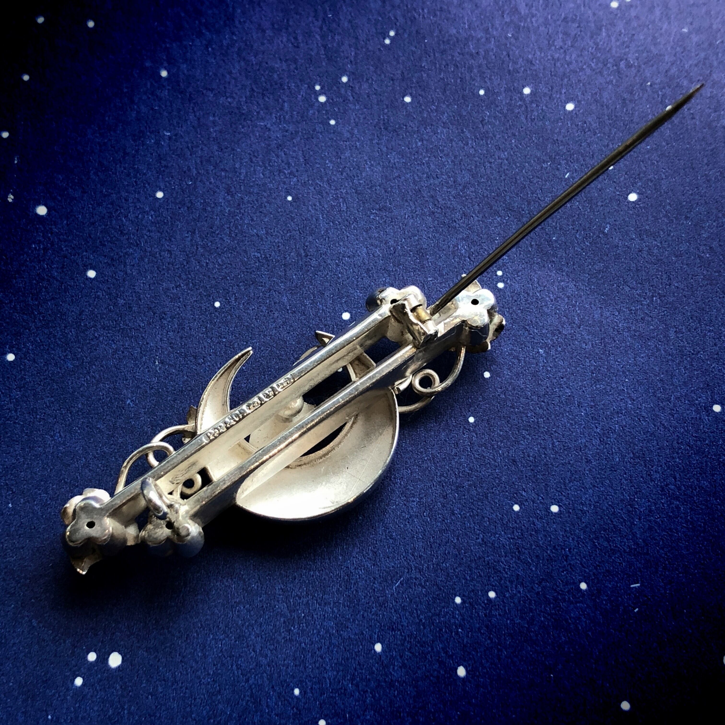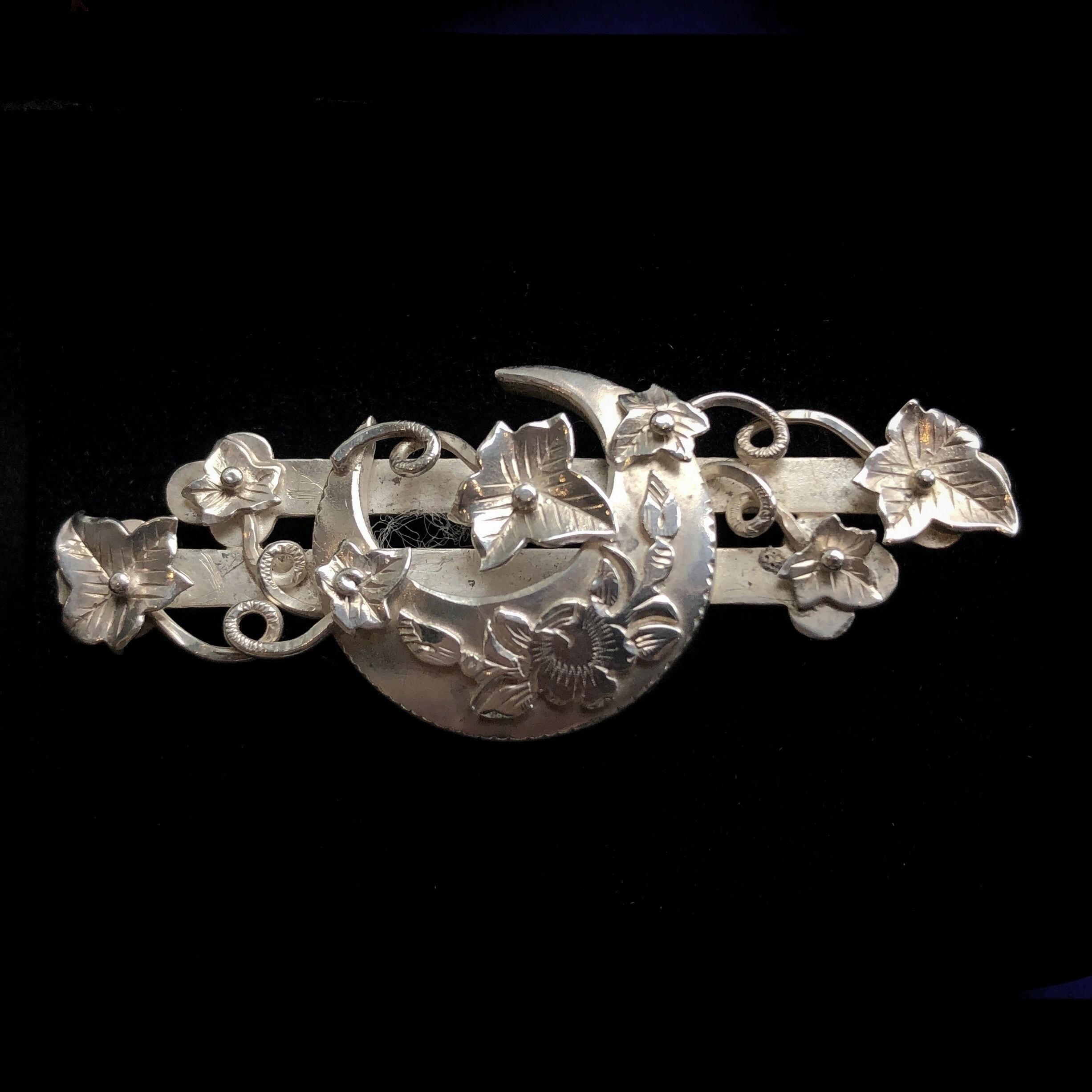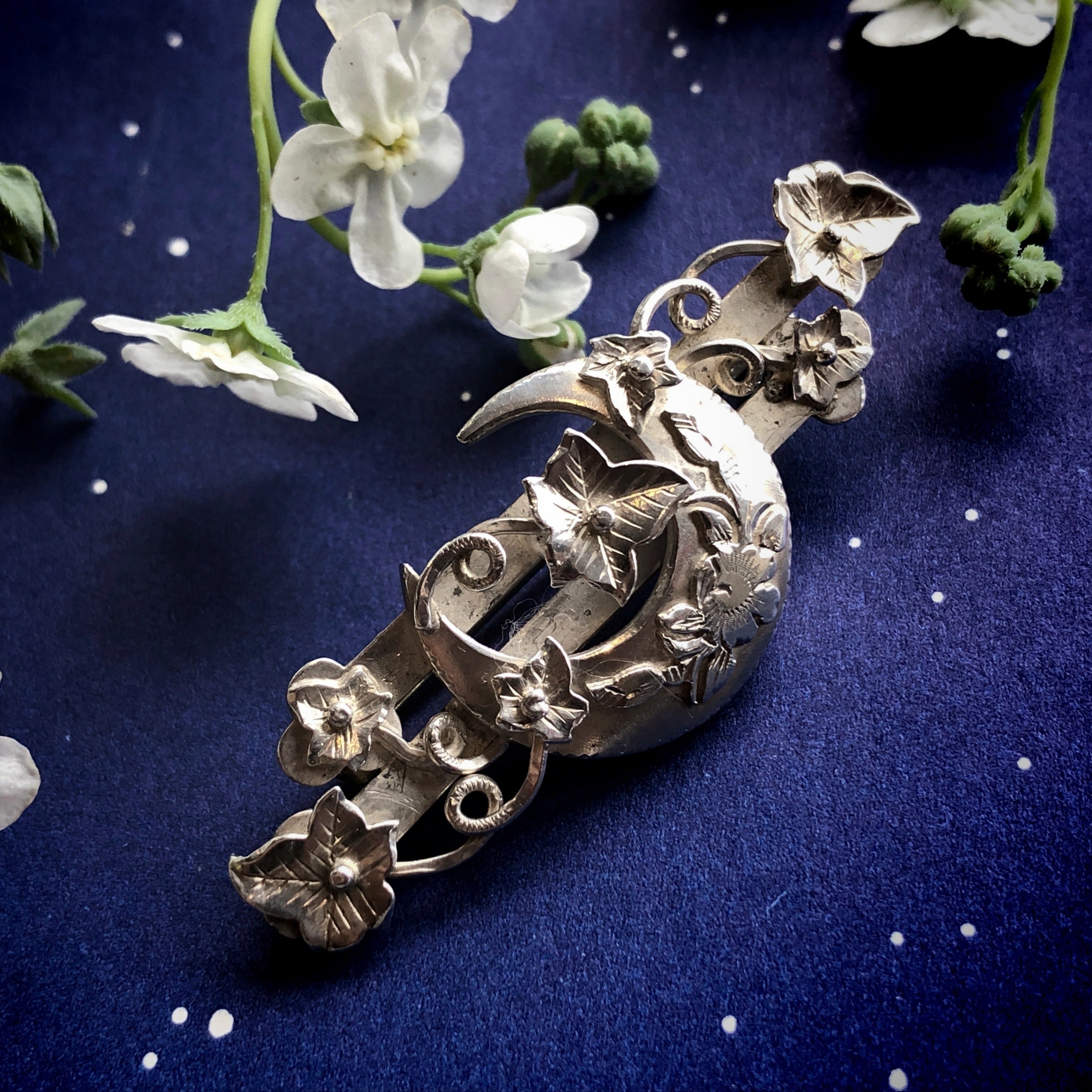 三日月に立体のツタの蔓と葉をあしらい、花も浮き彫りになった、とても素晴らしいデザインと細工のブローチです。中央の浮き彫りの花は時計草で、その花言葉は「聖なる愛」、またアッシジの聖フランチェスコが夢にみた十字架上の花とも言われています。