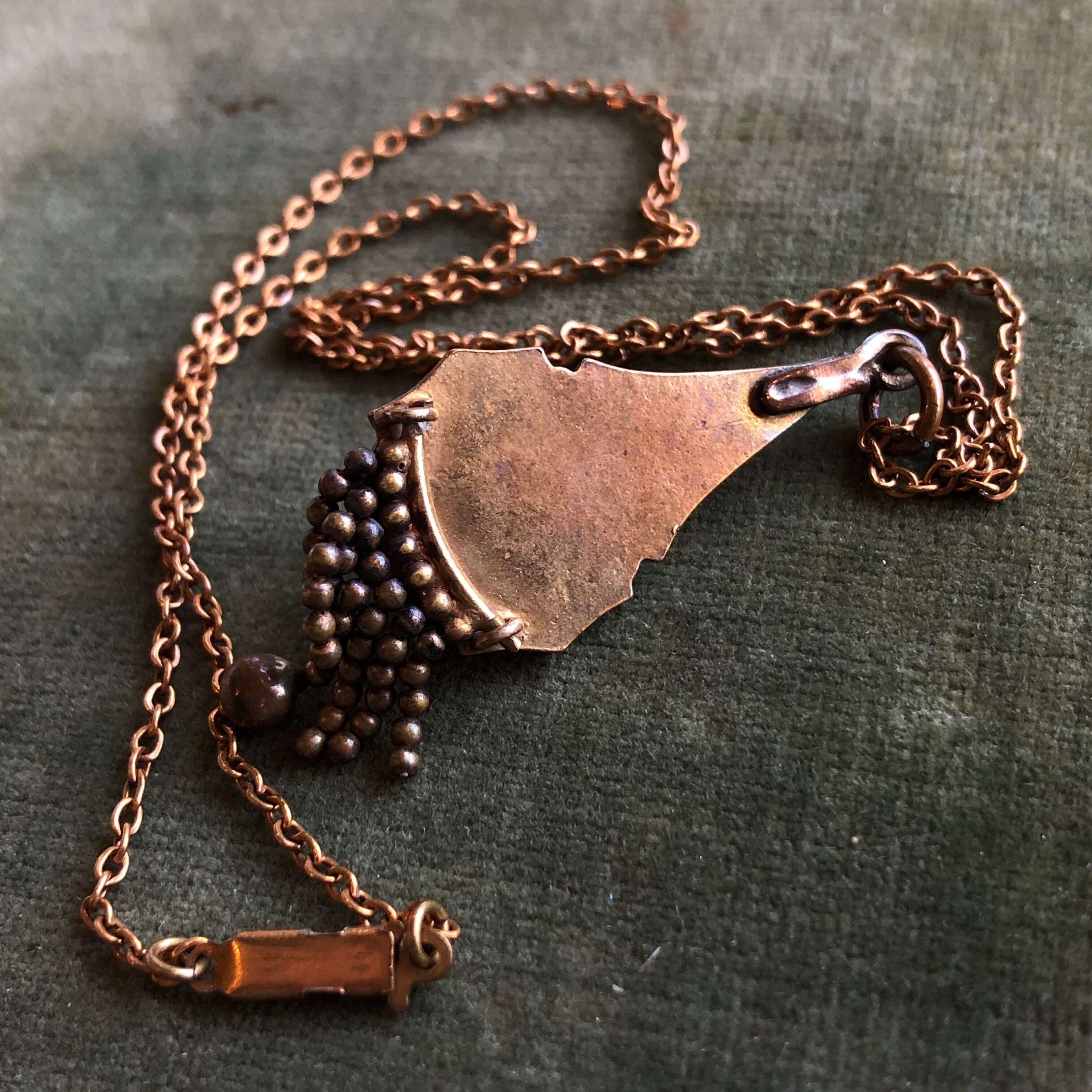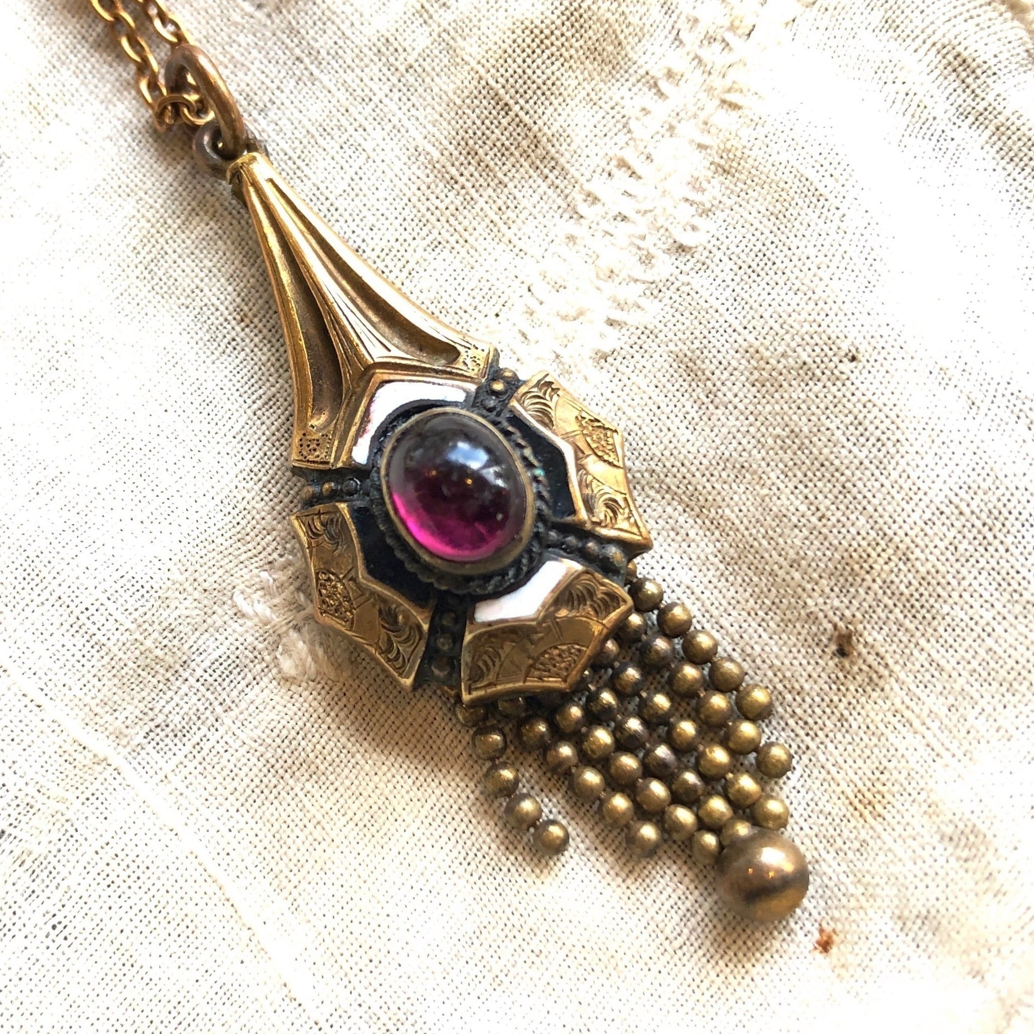 中央に葡萄酒の滴のような粒がひとつ、周りの金属には波のような不思議な模様が彫り込まれ、エナメルの白と黒、さらに水滴が流れ落ちるような金属のタッセルという、全体に神秘的な雰囲気が漂うペンダントです。