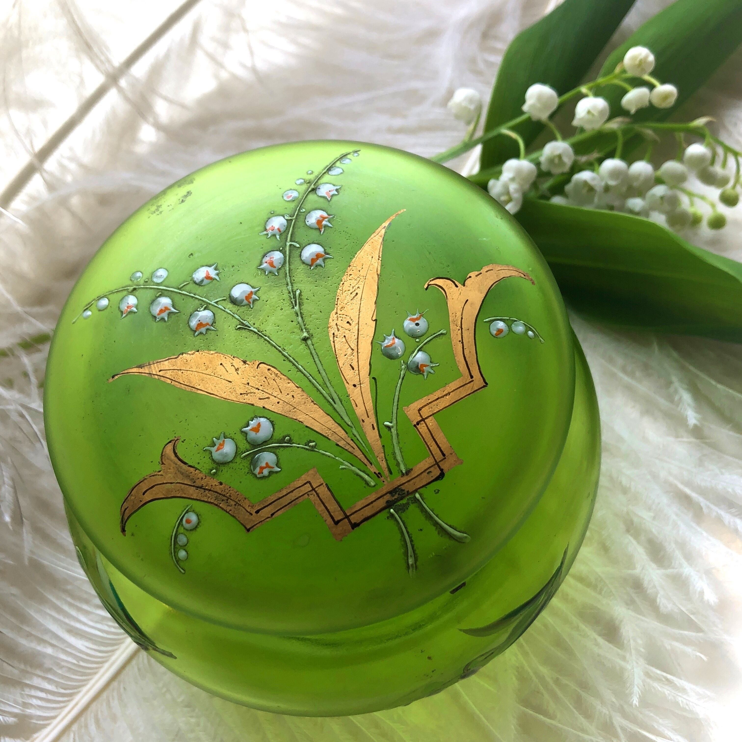 柔らかな質感の緑のガラスに立体感のあるエナメルでスズランが描かれたボンボニエールです。側面にも愛らしいスズランがあしらわれ、透明度の高いガラスに磨りガラスの処理が施されて、優しく瑞々しい雰囲気になっています。
