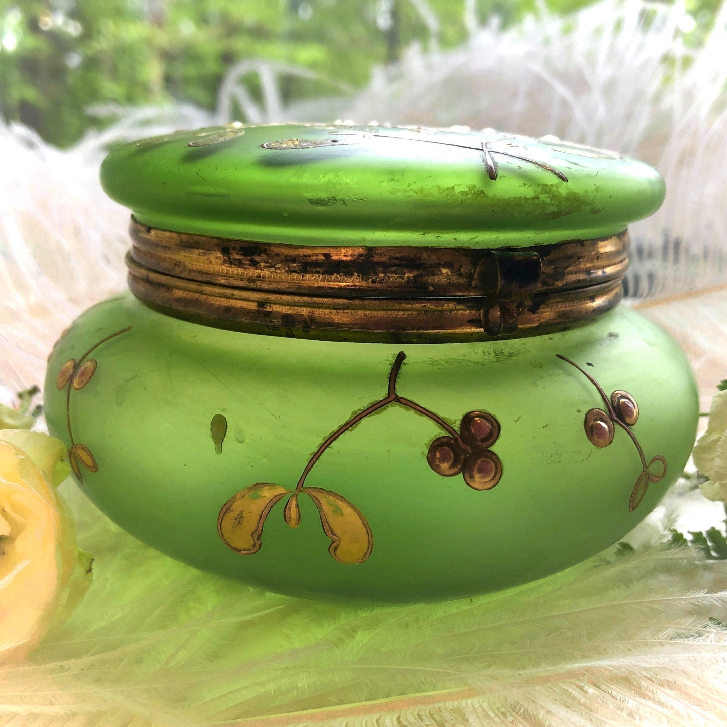 ガラスの硬質な殻を薄くくるりと剥いたような肌触りの緑の摺りガラスに立体感のある金彩でヤドリギが描かれたボンボニエールです。ヤドリギは根を張らず、他の木の枝にあってその木を枯らすこともなく早春に花、秋には実をつけ、一年を通して青々とした植物です。そのため古代ケルトで神聖な植物とされのを始め、ヨーロッパでは永遠の生命を、またクリスマスを象徴する植物でもあり、幸運を呼ぶ木と言われています。そのようなヤドリギをボンボニエールに描いたことには、やはり意味があったのでしょう。どんな場面で使われたのか今となっては知る由もありませんが、このヤドリギに込められた祈りを思う時、このお品が少し神秘的に見えてきます。