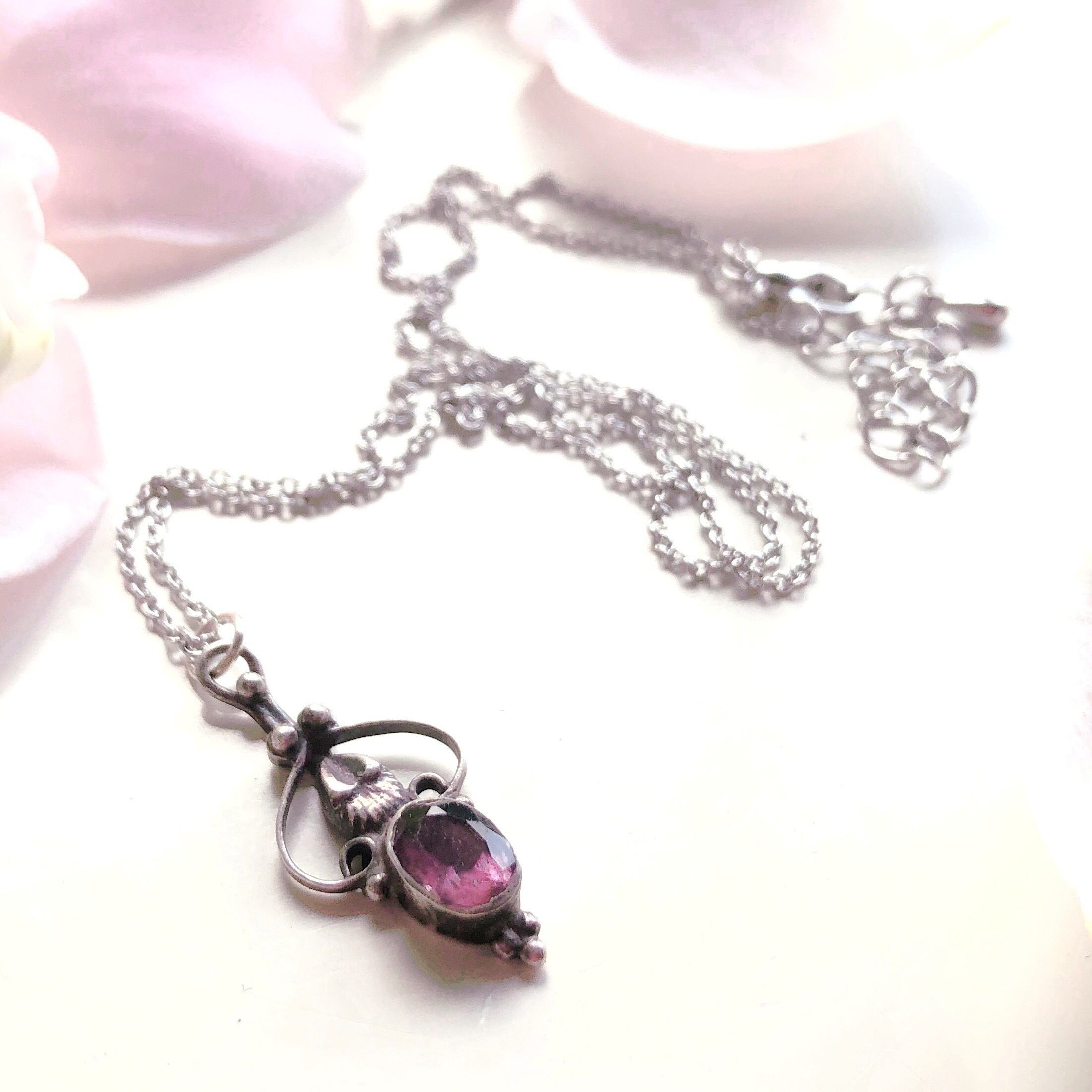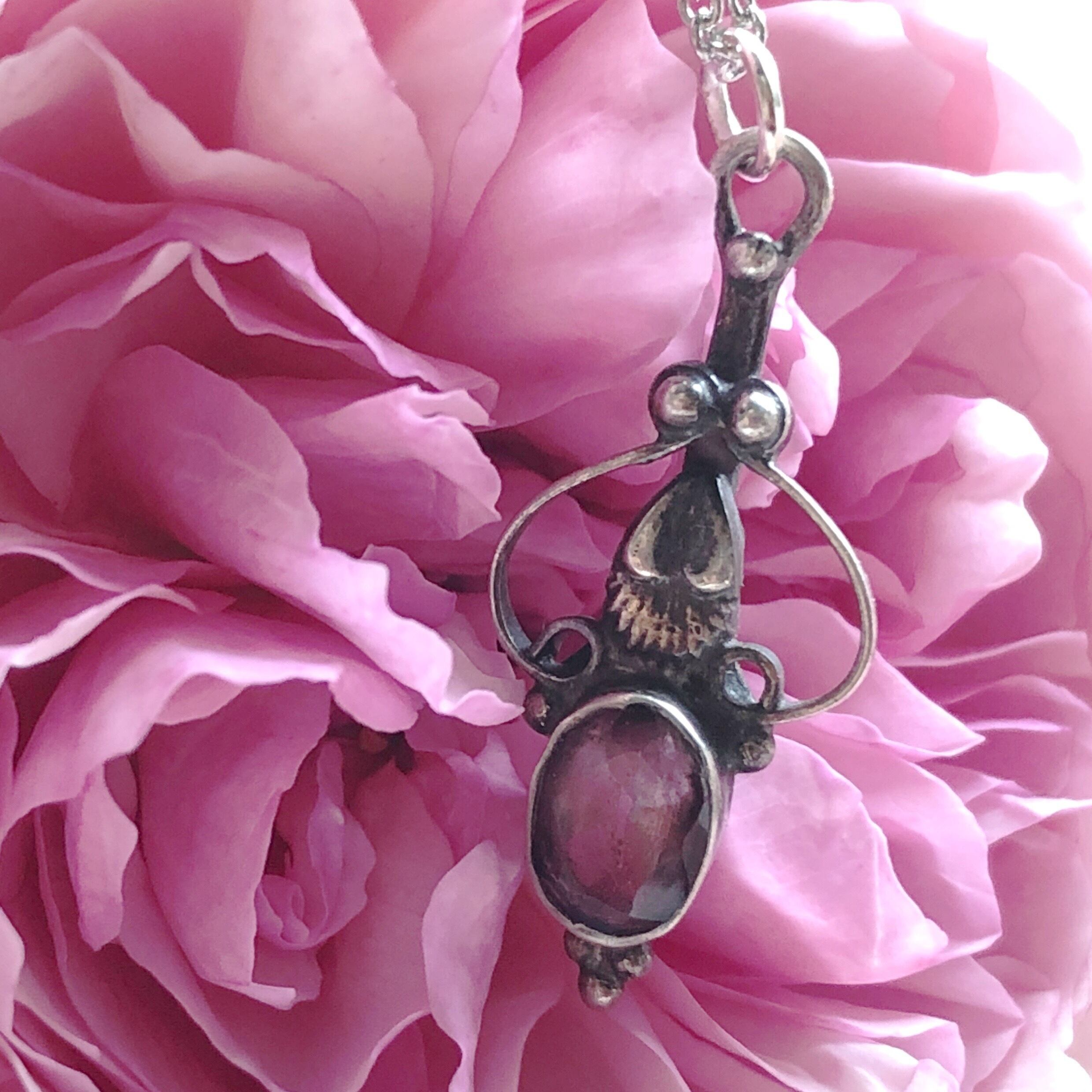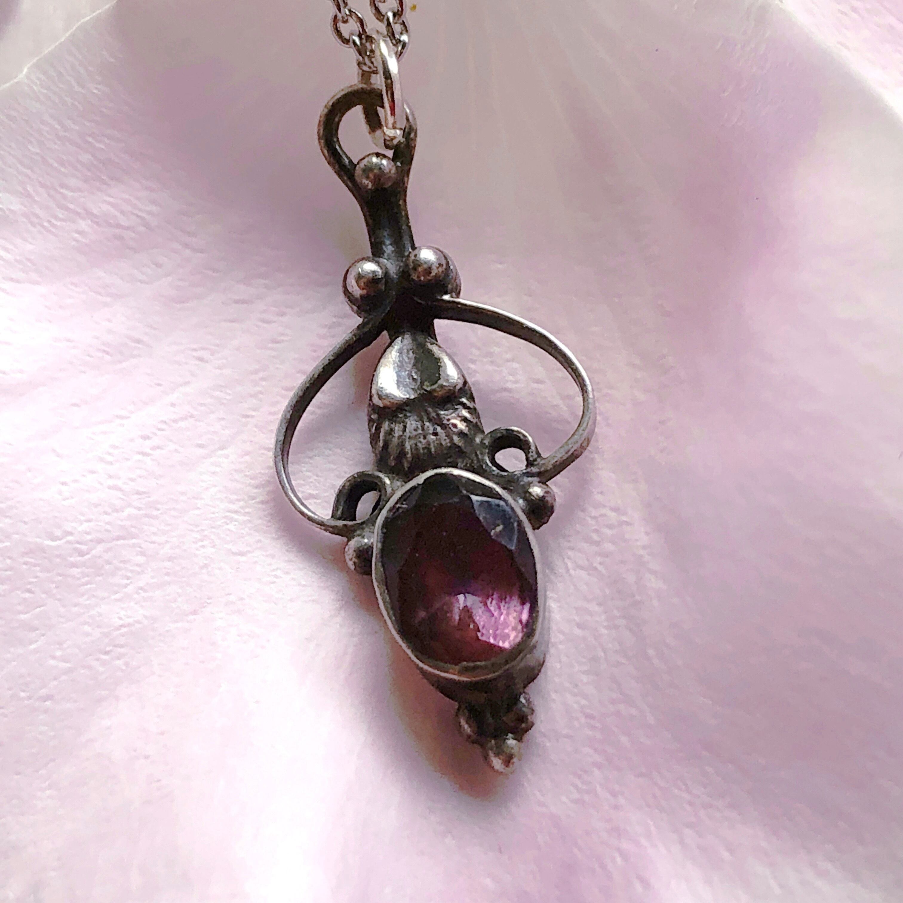 曲線を組み合わせた不思議な意匠の台座に、うっすらと赤みを帯びた薄い紫の、こちらも微妙な色味のアメジストが一粒置かれたペンダントです。枠は石の周囲だけで表裏から光が入るので、静かで深みのある石の中に時として光が宿ります。