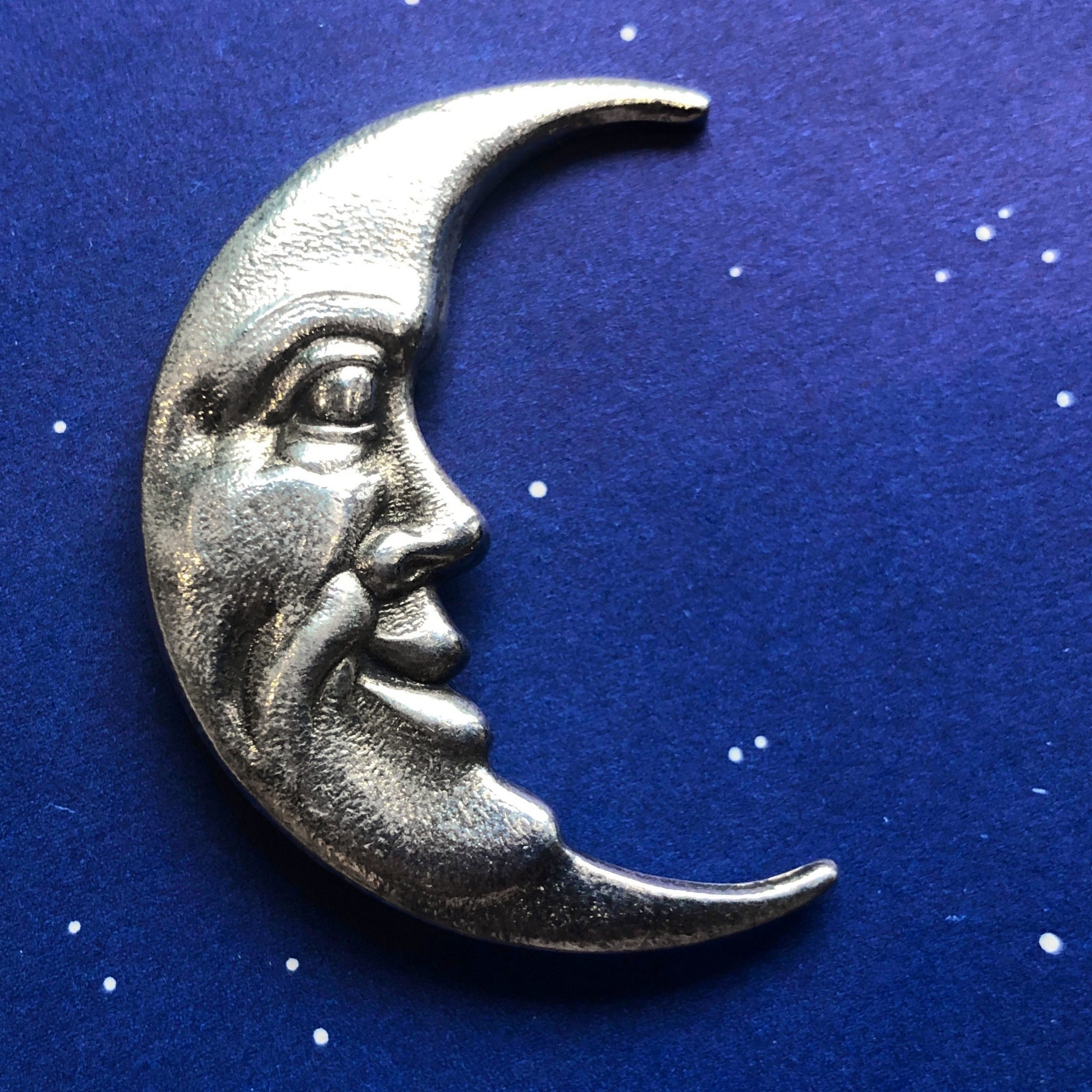 表情豊かに笑みを浮かべる月のブローチです。銀色の金属が鈍く古色を帯びて、顔の彫りを一層深くしています。