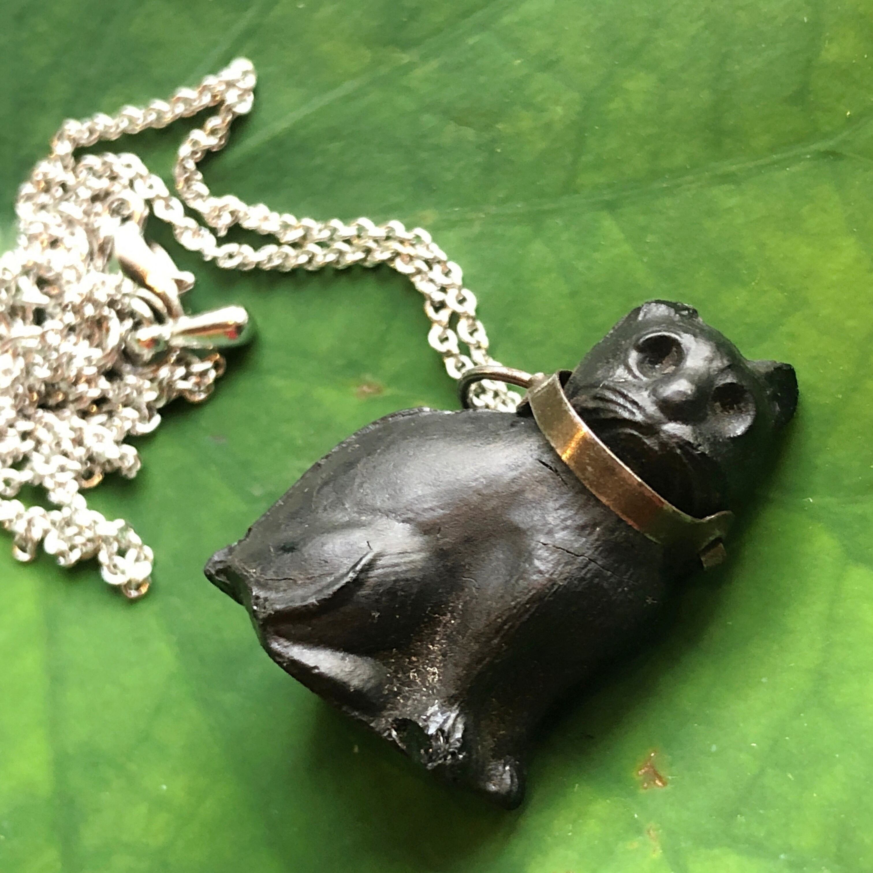 どこから紛れ込んできた黒猫です。古いもののようで、素材はヴォルカナイトと思われます。ヴォルカナイトは1842年に発明された天然ゴムを素材にした樹脂で、ヴィクトリア朝のモーニングジュエリーではジェットの代用品として使われました。