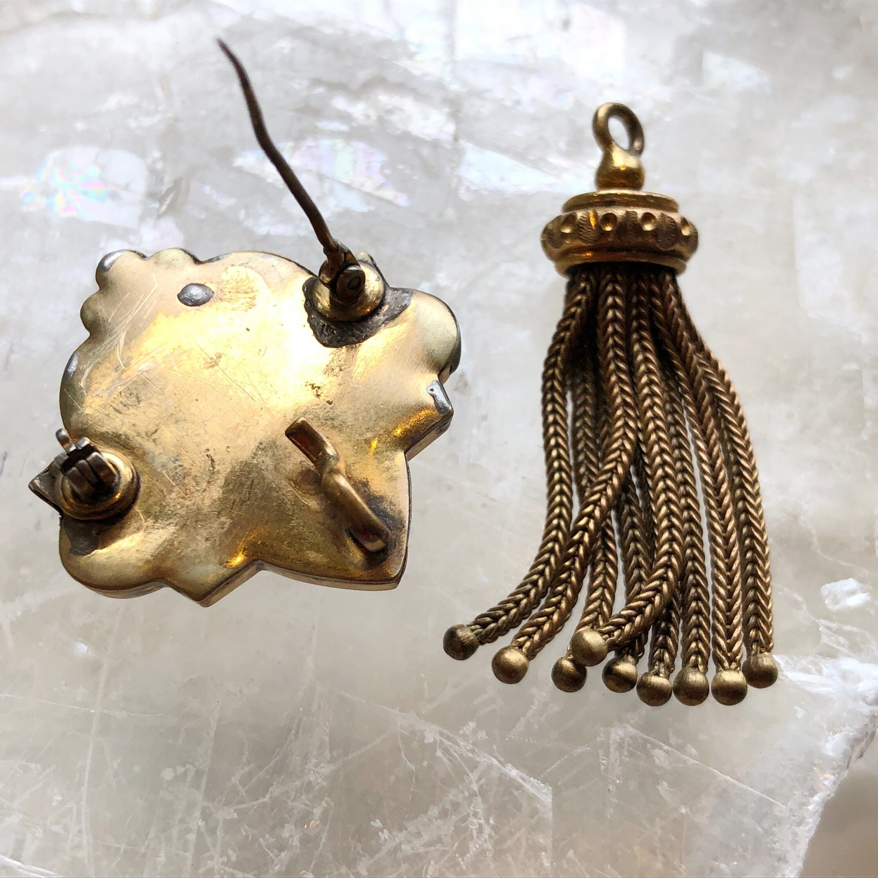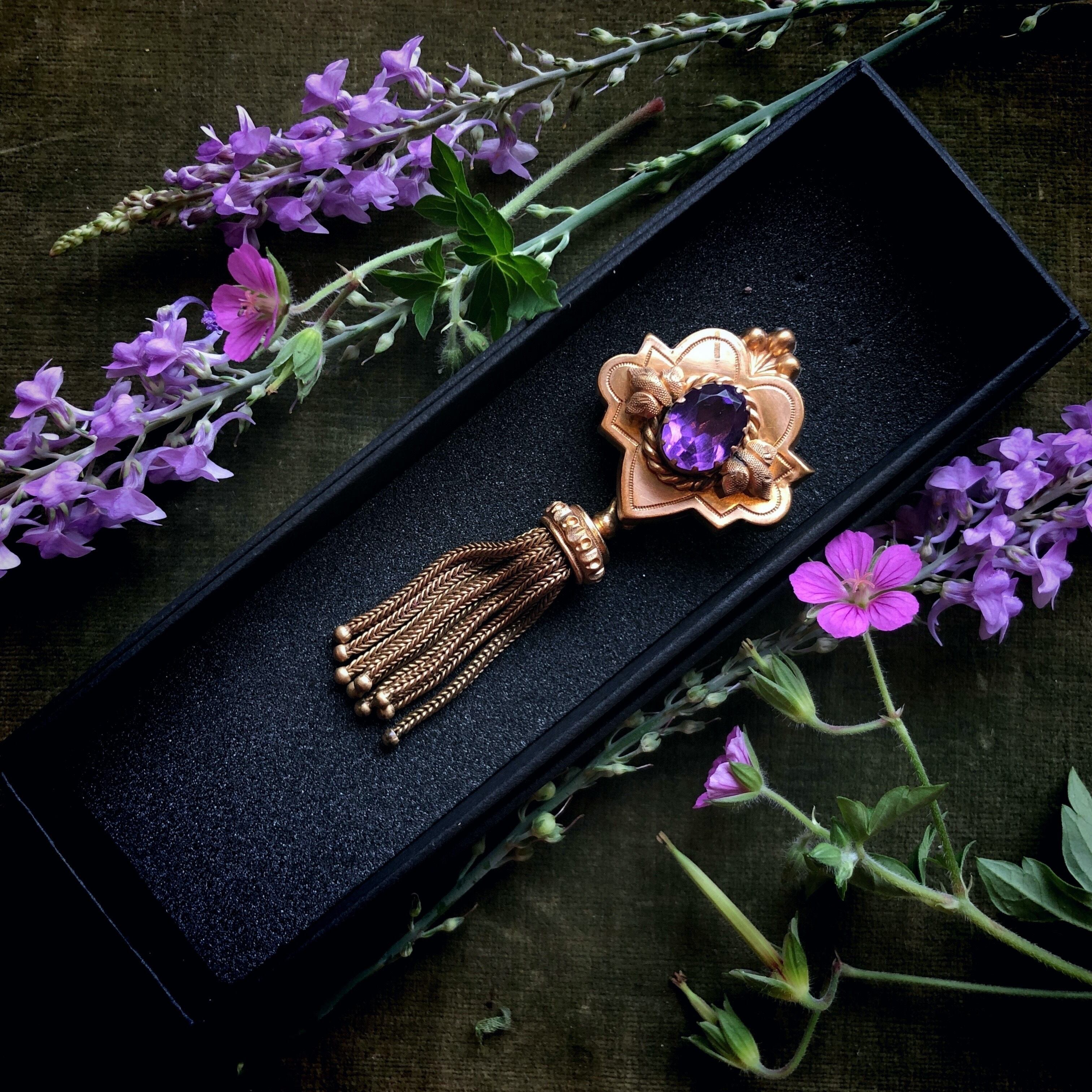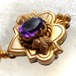 20世紀初頭、イギリス、エドワード朝のタッセル付きブローチです。中央に置かれたアメジストガラスはほんのりと淡い葡萄色、周囲の植物と曲線を組み合わせた金属部分は金メッキよりもずっと層の厚い金張りで未だ鈍い光を残しています。タッセルも金属製で、全体がちょっと神秘的な雰囲気のお品です。