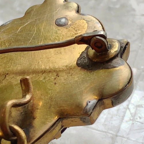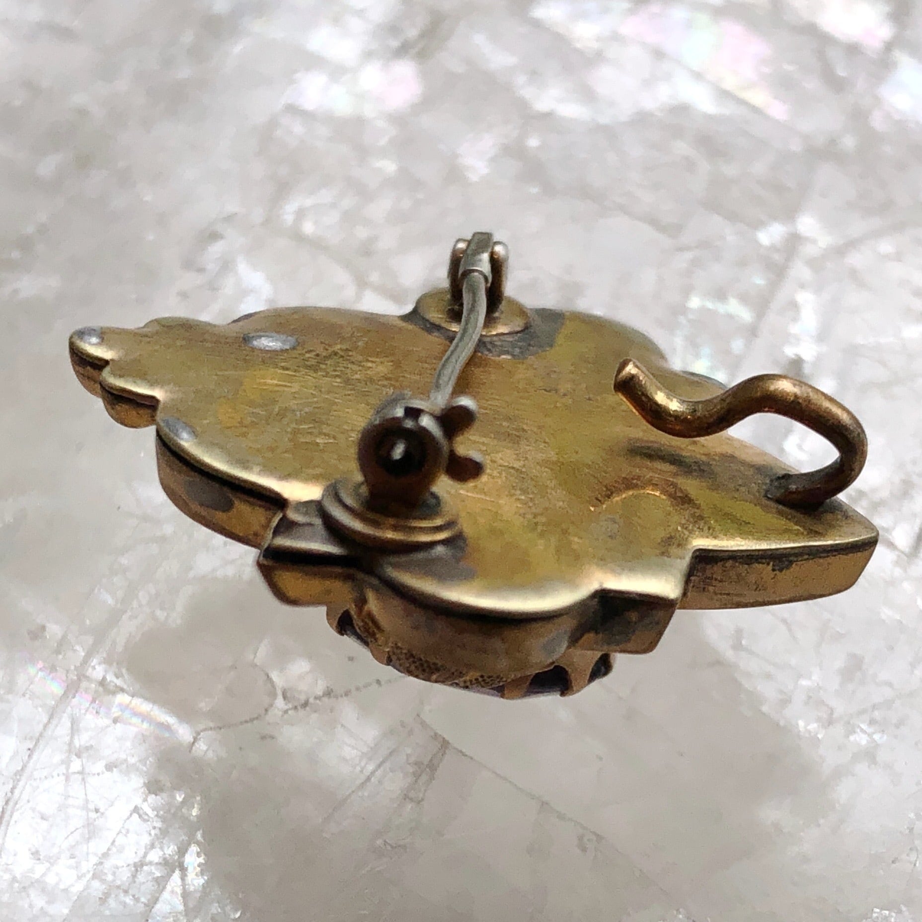本体の金属部分は薄い金属を曲げた細工で中は中空になっているため思いのほか軽く、ブローチとして薄物に着けても垂れにくいと思います。本体の裏側に当たる板が一度はずれて修復されたようで、今も若干の隙間が見られますがすぐにはずれる状態ではありません。またピンの台座にも修復の跡があります。