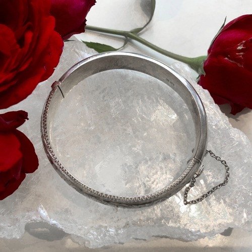 円の半分に植物をモチーフにした装飾が精緻に刻まれたバングルです。施された装飾は手彫りのようですが、軽やかにリズミカルに曲線を描き、シルバーそのものの柔らかく上品な輝きを全身にまとった姿はどこか幻想的で、まるで霞の中に姿を現した妖精が身につけている腕輪のような雰囲気です。