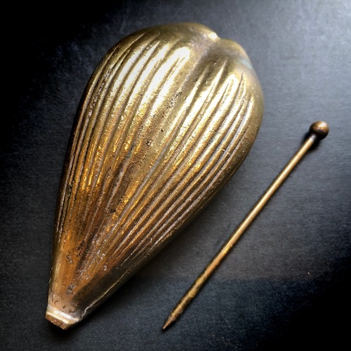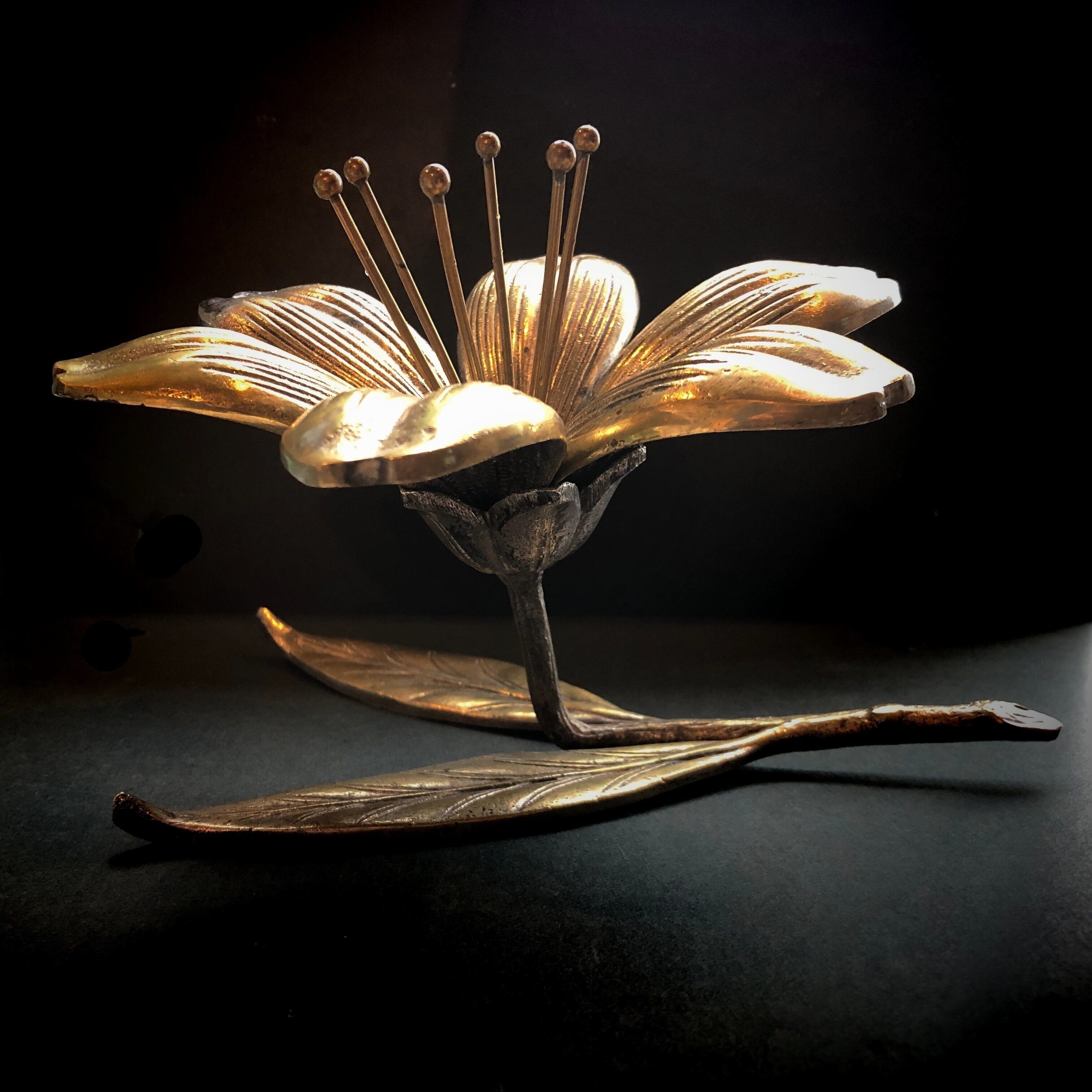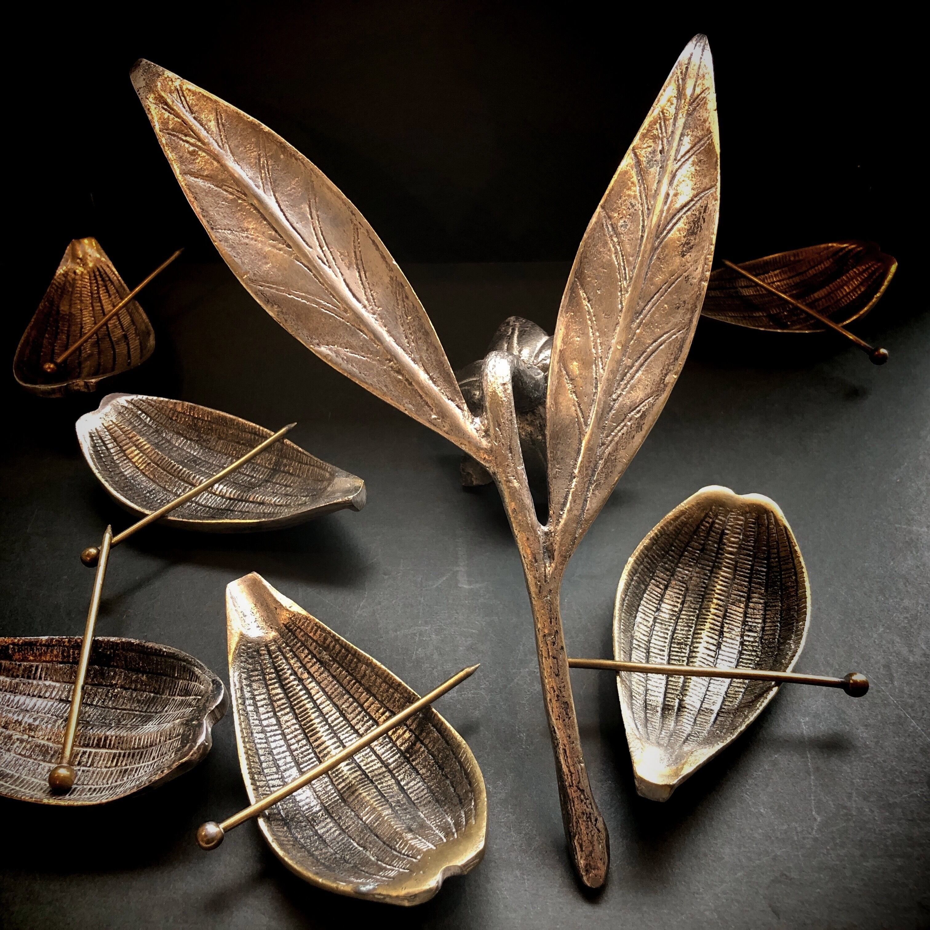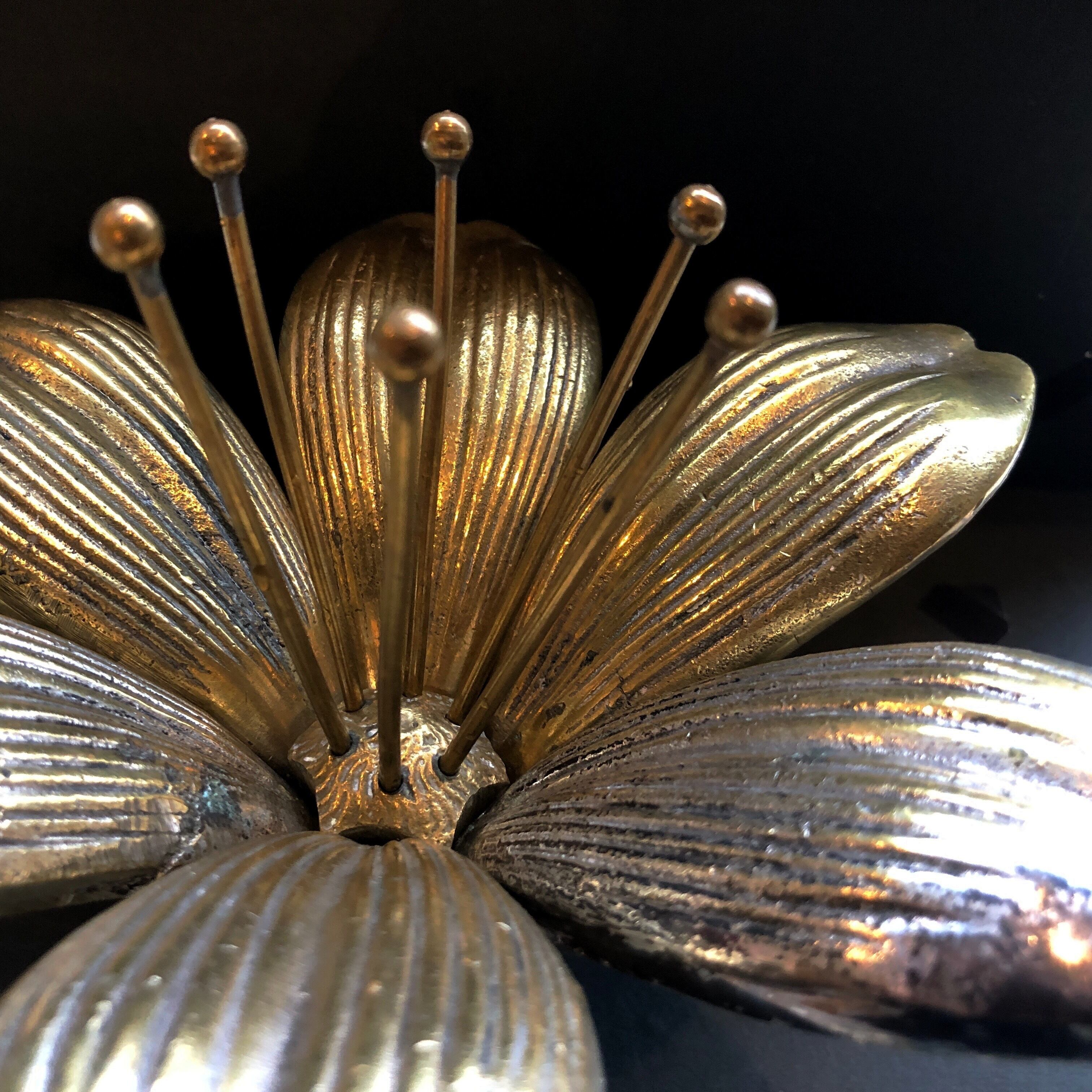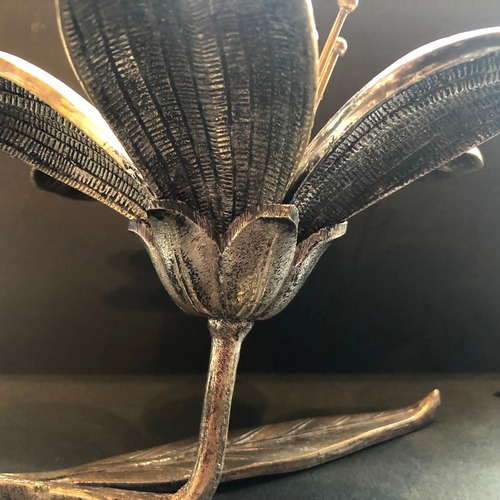 この美しい金属の花のオブジェ。花びらを取ると、それがトレイになり、また蘂の棒はピックになります。お茶菓子などの取り皿としてもよいと思いますが、おつまみのオリーヴなどに使ったのかもしれません。そんなにたくさんは入らないので、きっと来客用だと思います。テーブルに置かれた花から花びらを一枚取ってスッとお客様に差し出す……実に優雅でスマートですね。