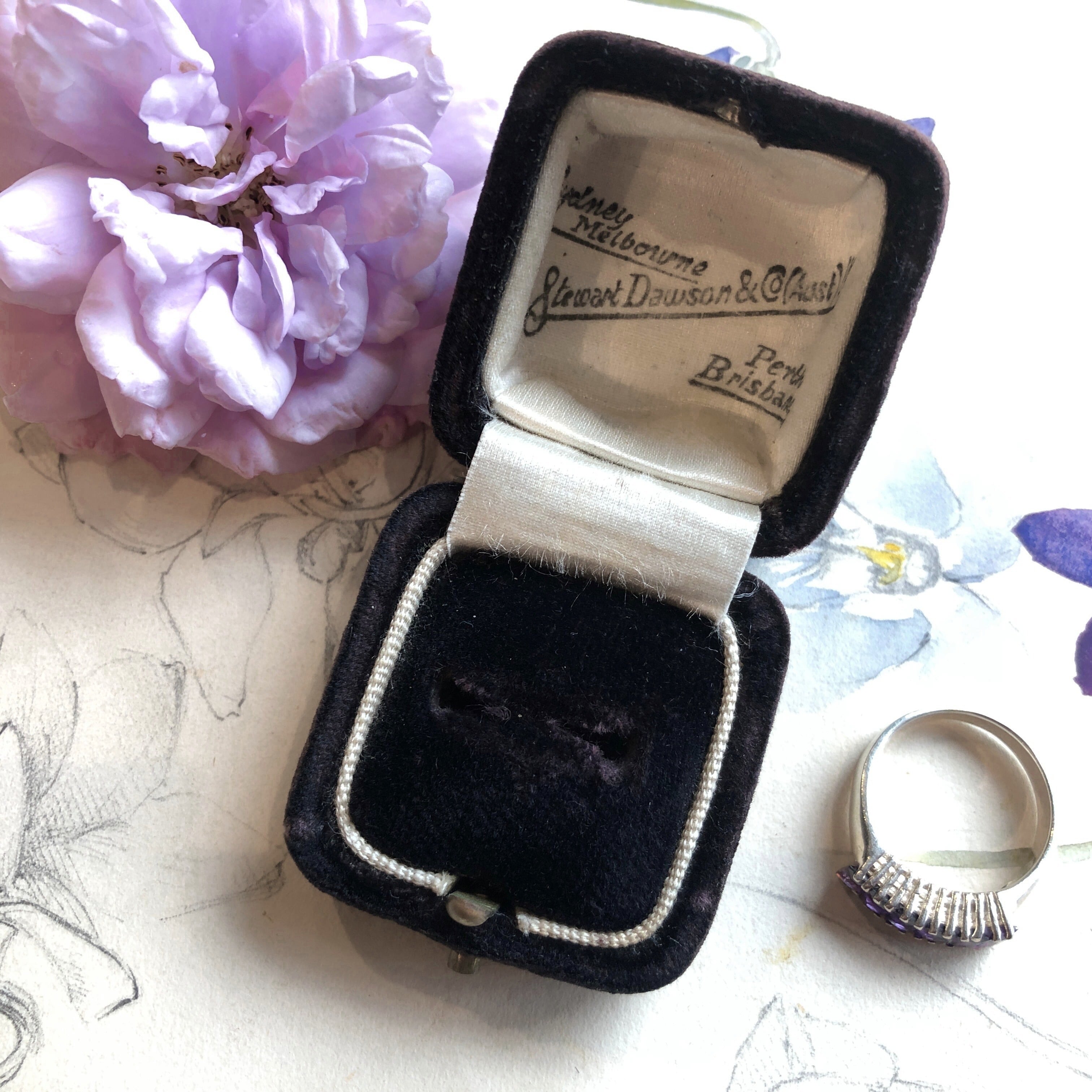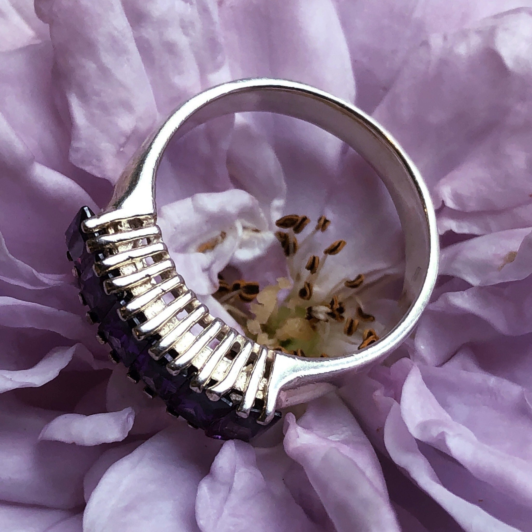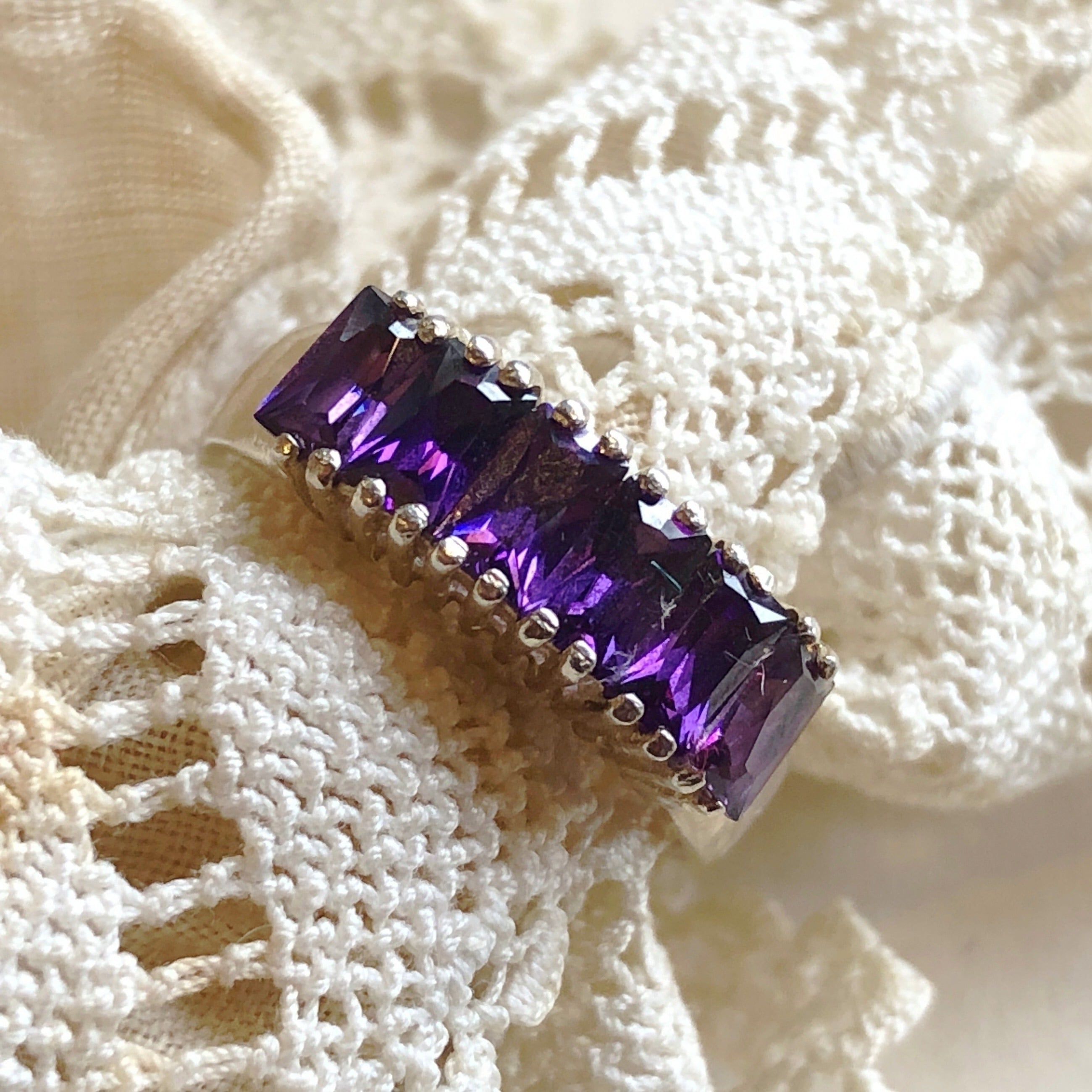 美しいすみれ色のアメジストが端正なスクエアカットで並んでいる指輪です。やや薄い葡萄酒色のアメジストの輝きは瑞々しく、時に煌めき、とても上品な華やかさを漂わせています。
