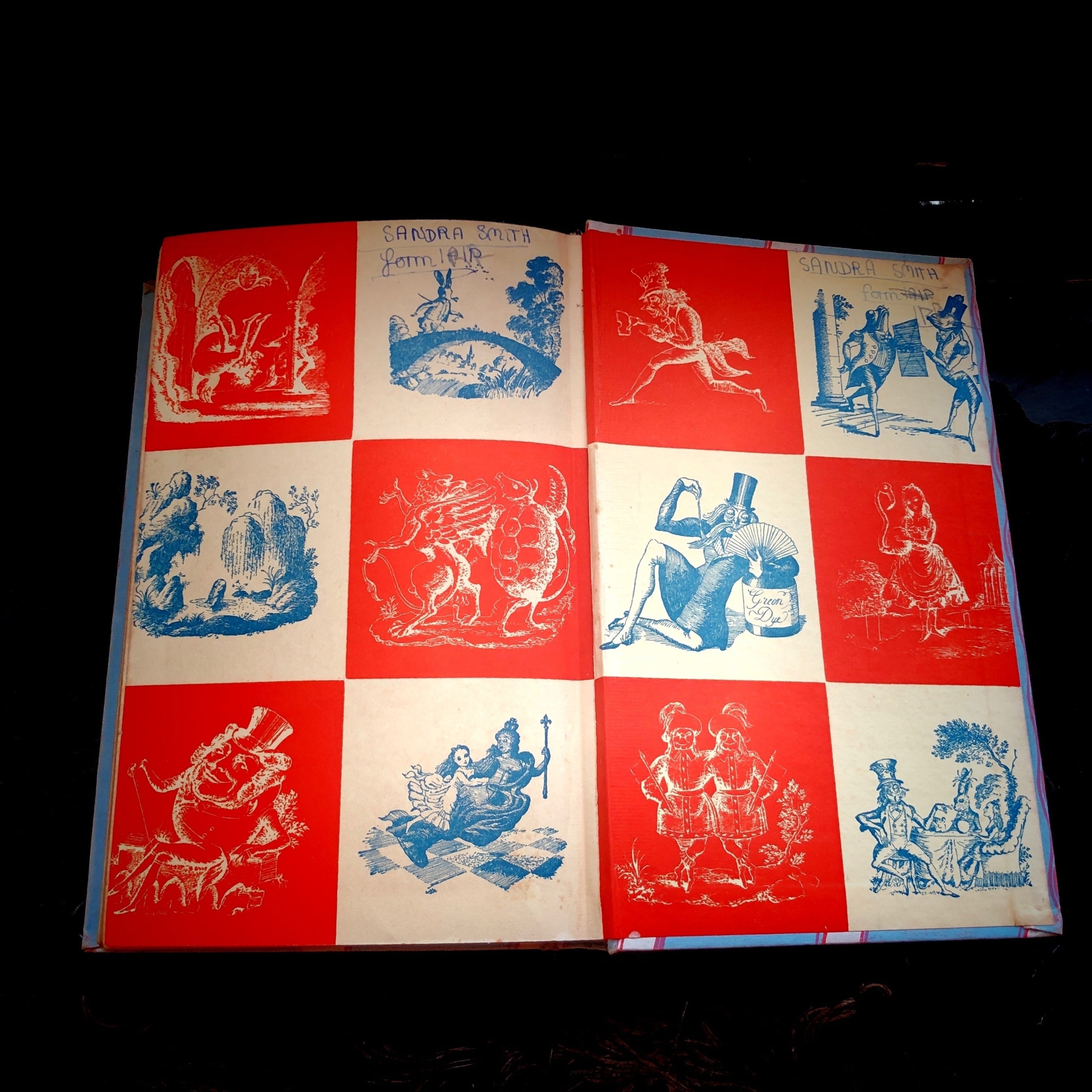 不思議の国のアリスと鏡の国のアリスのハードバックの一巻本です。もちろん、英文はルイス・キャロルが書いた通りで、鏡の国のアリスでの鏡文字もその通りの文字組になっています。