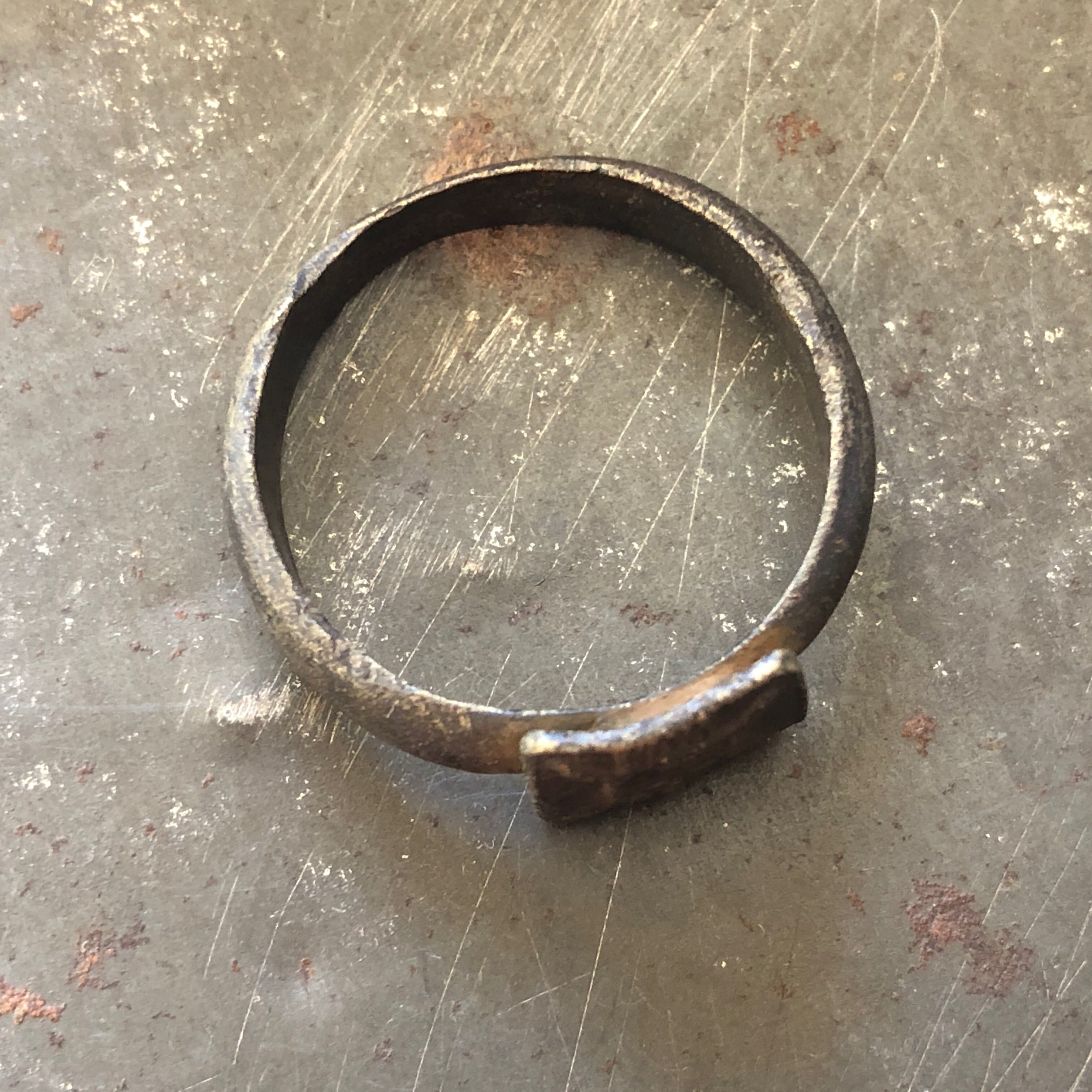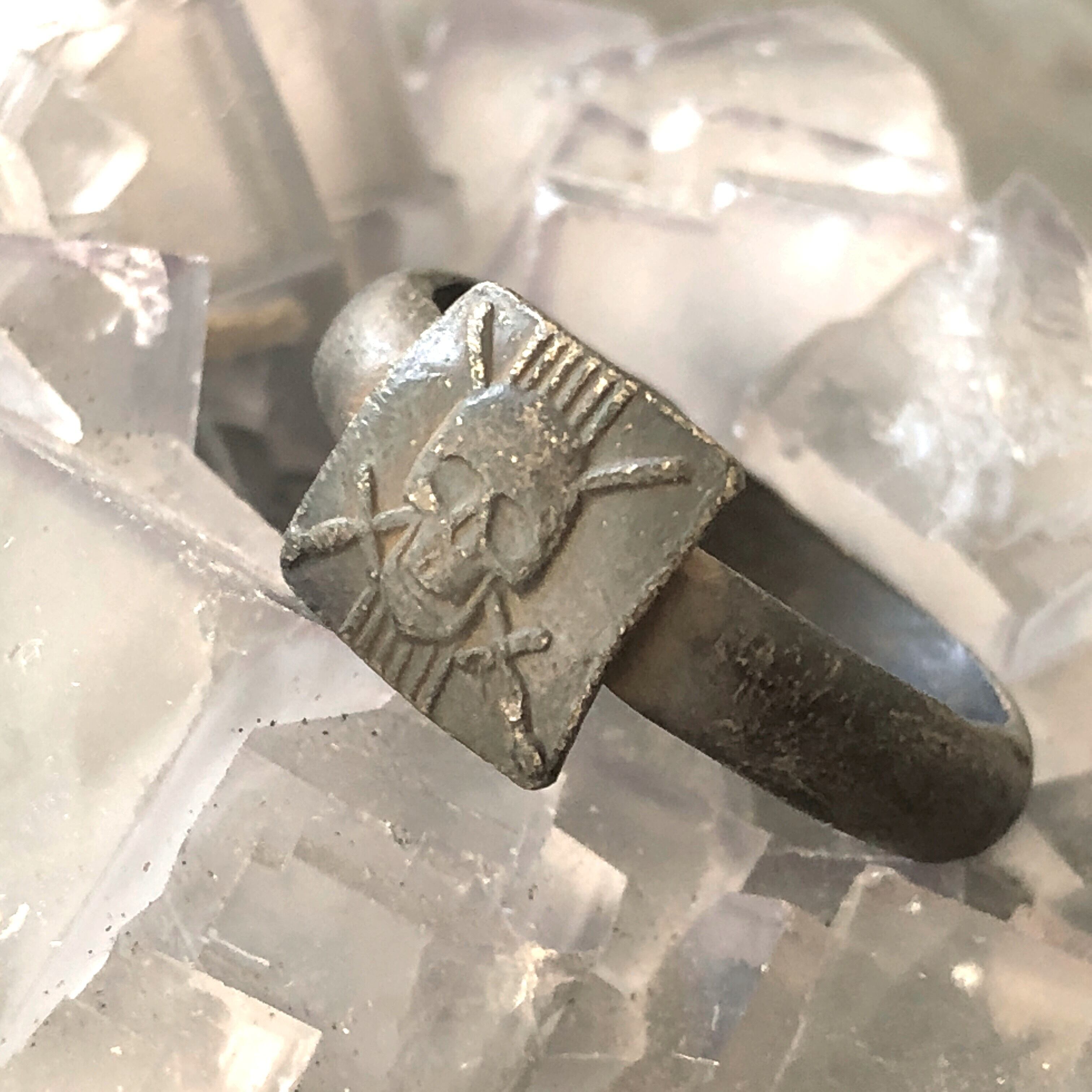 錆びた髑髏の指輪です。売主からの情報では、第一次あるいは第二次世界大戦で兵士が身につけていたものとのことですが、果たして本当にそうだったのか。今となっては知るよしもありません。ただ錆びの浮いた質感からは、過酷な環境、あるいは労働で身につけていたことを思わせる迫力が感じられます。それをそのままお伝えするために、特にクリーニングなどはしておりません。
