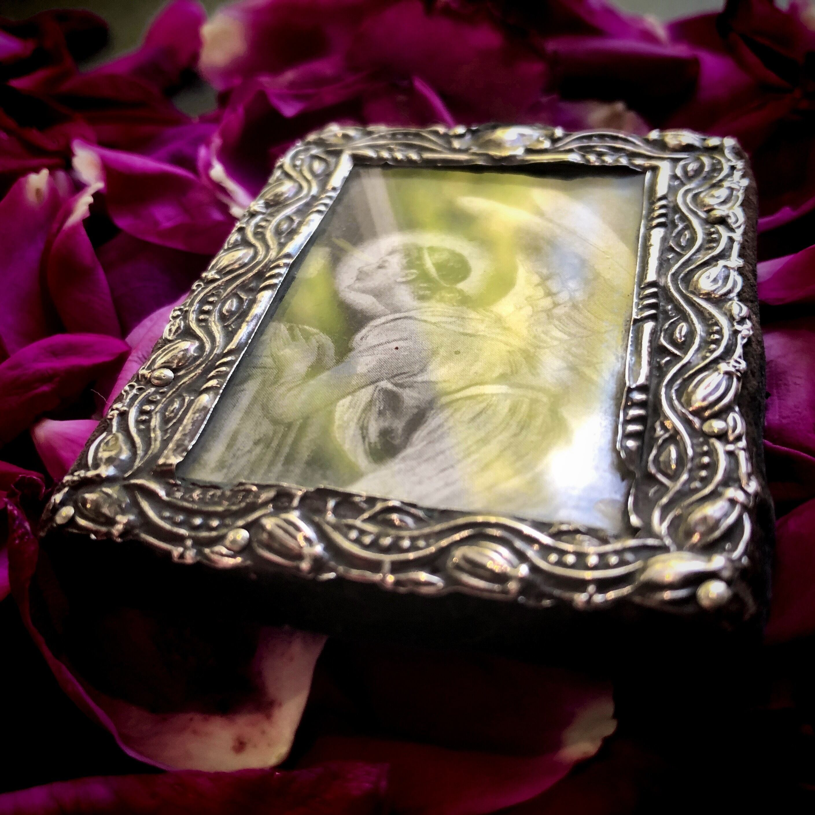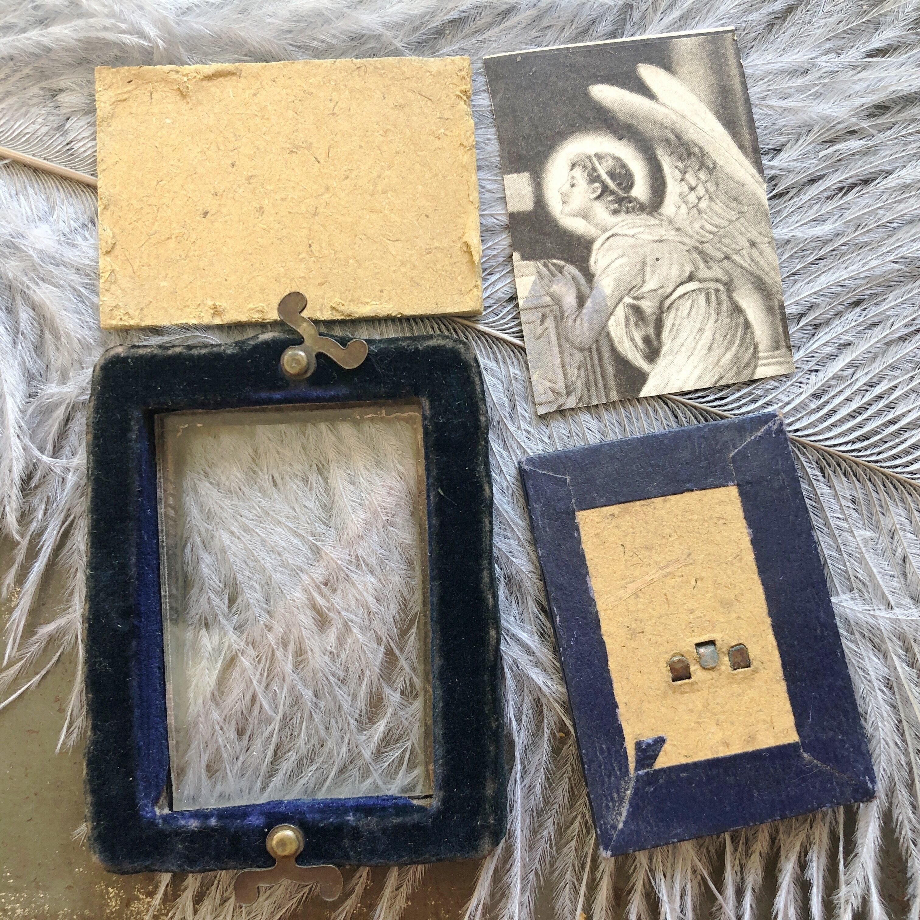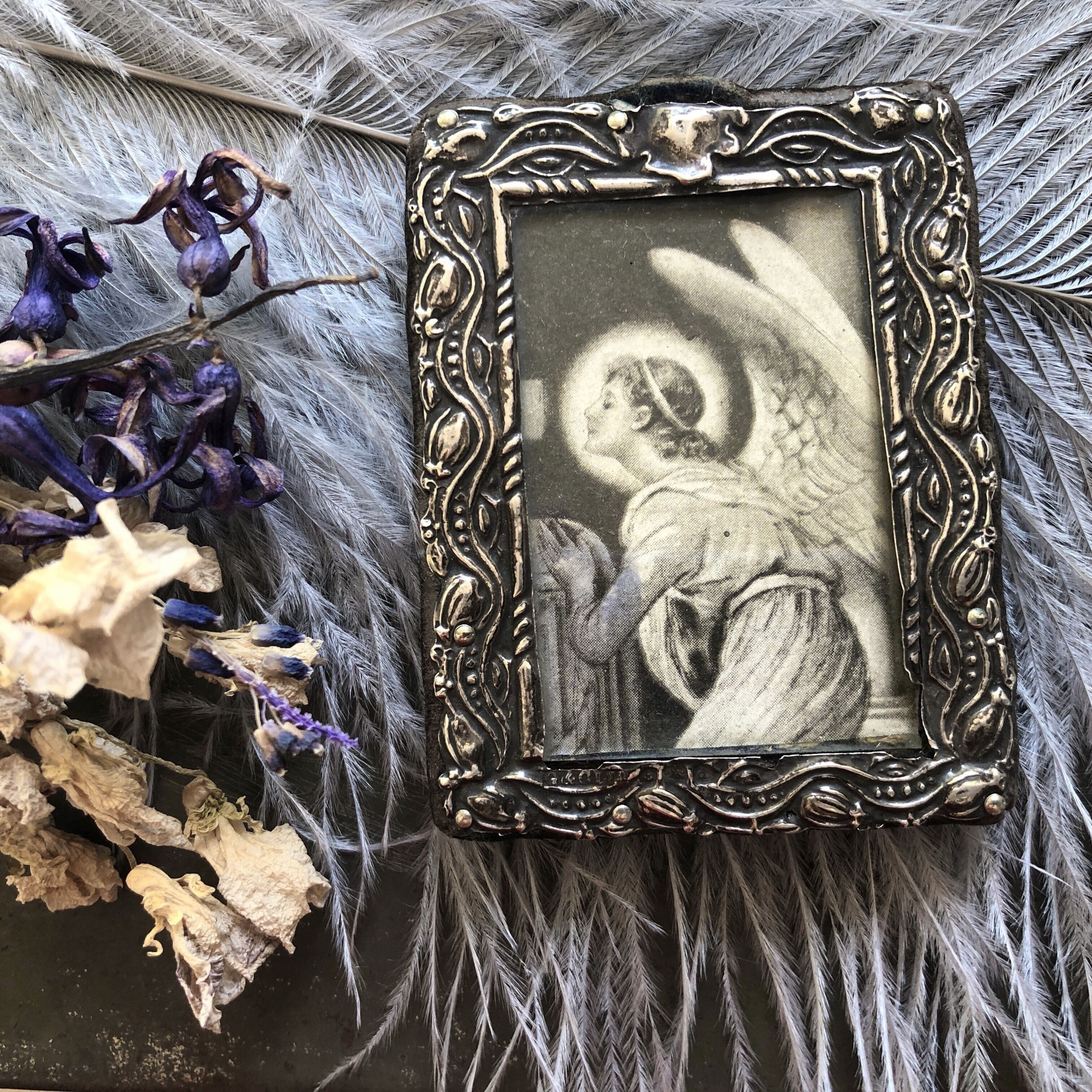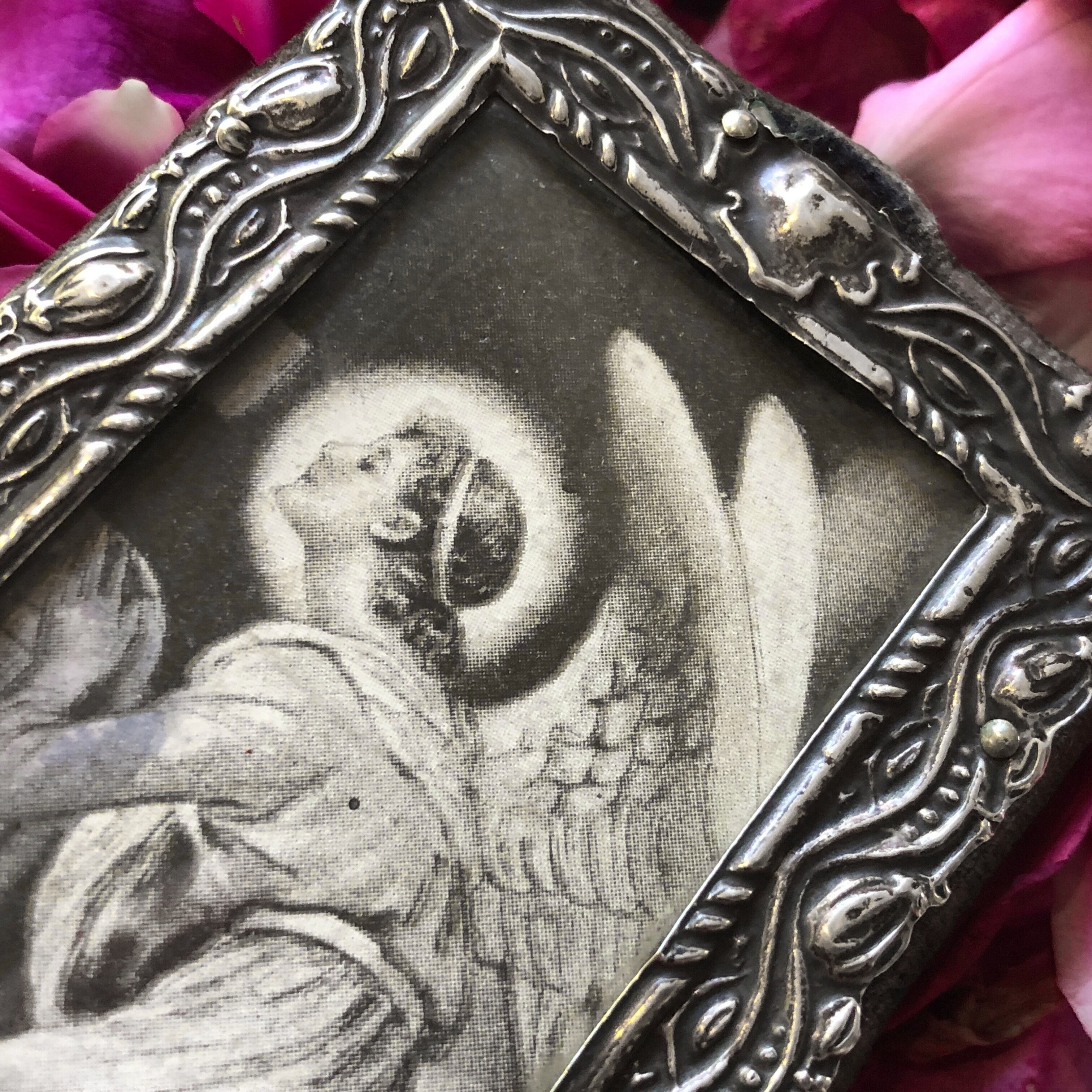 植物をモチーフにした装飾が浮き彫りになった小さなフレームです。中に印刷された天使の図版を入れておりますが、これは入れ替えることができます。