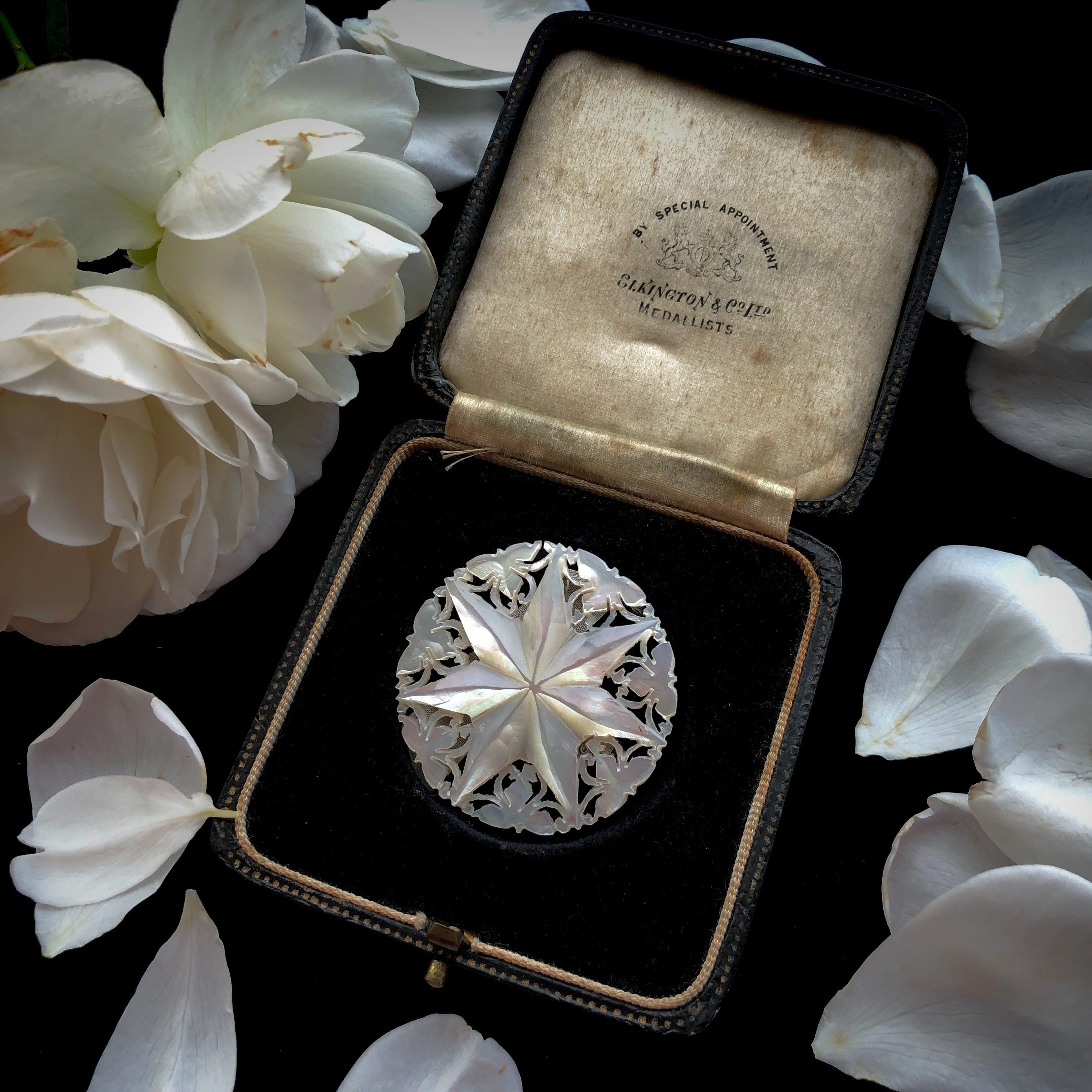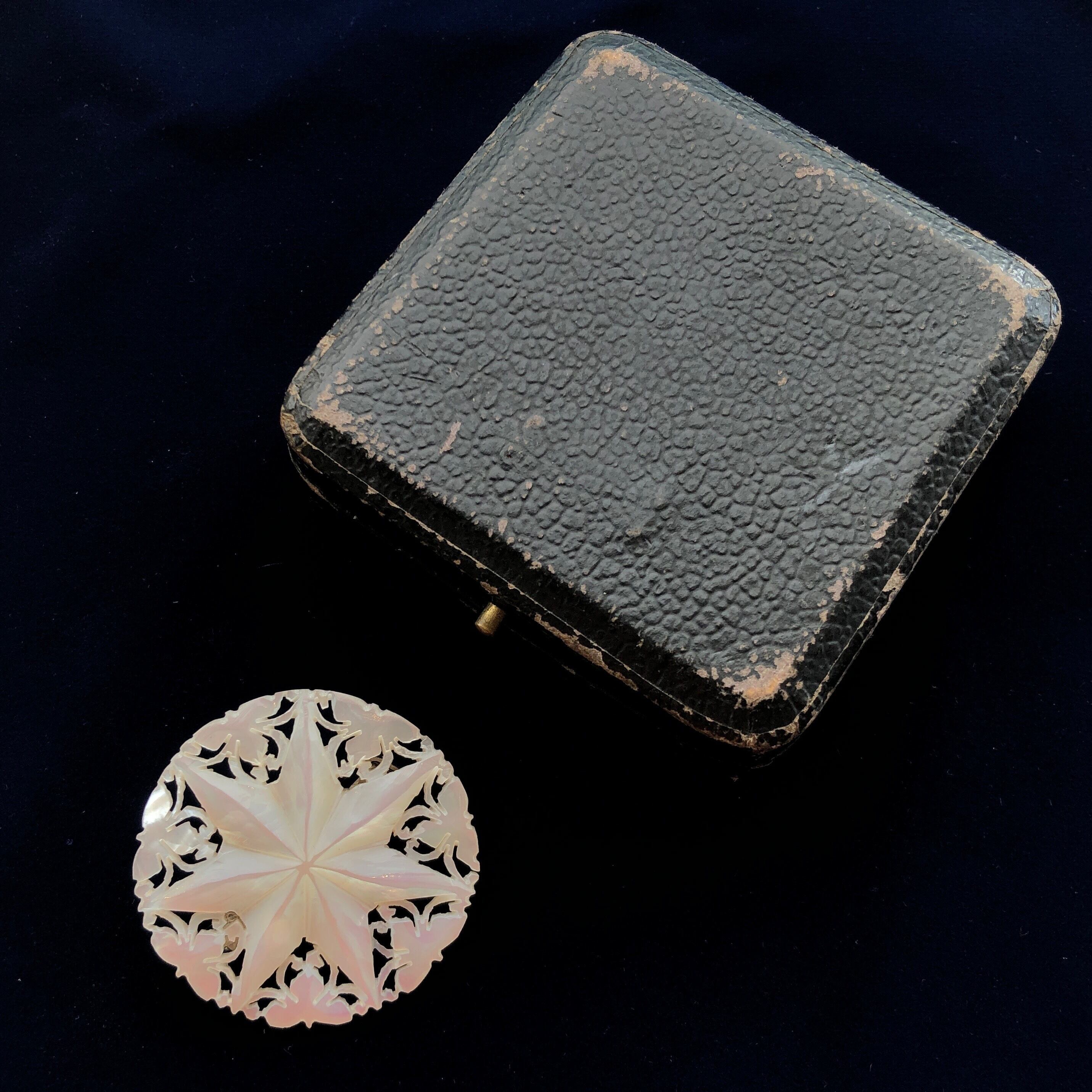このお品は製作から60年程度は経ったヴィンテージで、オリジナルではありませんが雰囲気がぴったりのジュエリーケースがありましたので、せっかくですのでセットにしてお届けいたします。繊細な彫りと真珠貝独特の素晴らしい質感、そしてそれを引き立てる古いジュエリーケースを合わせてお楽しみください。