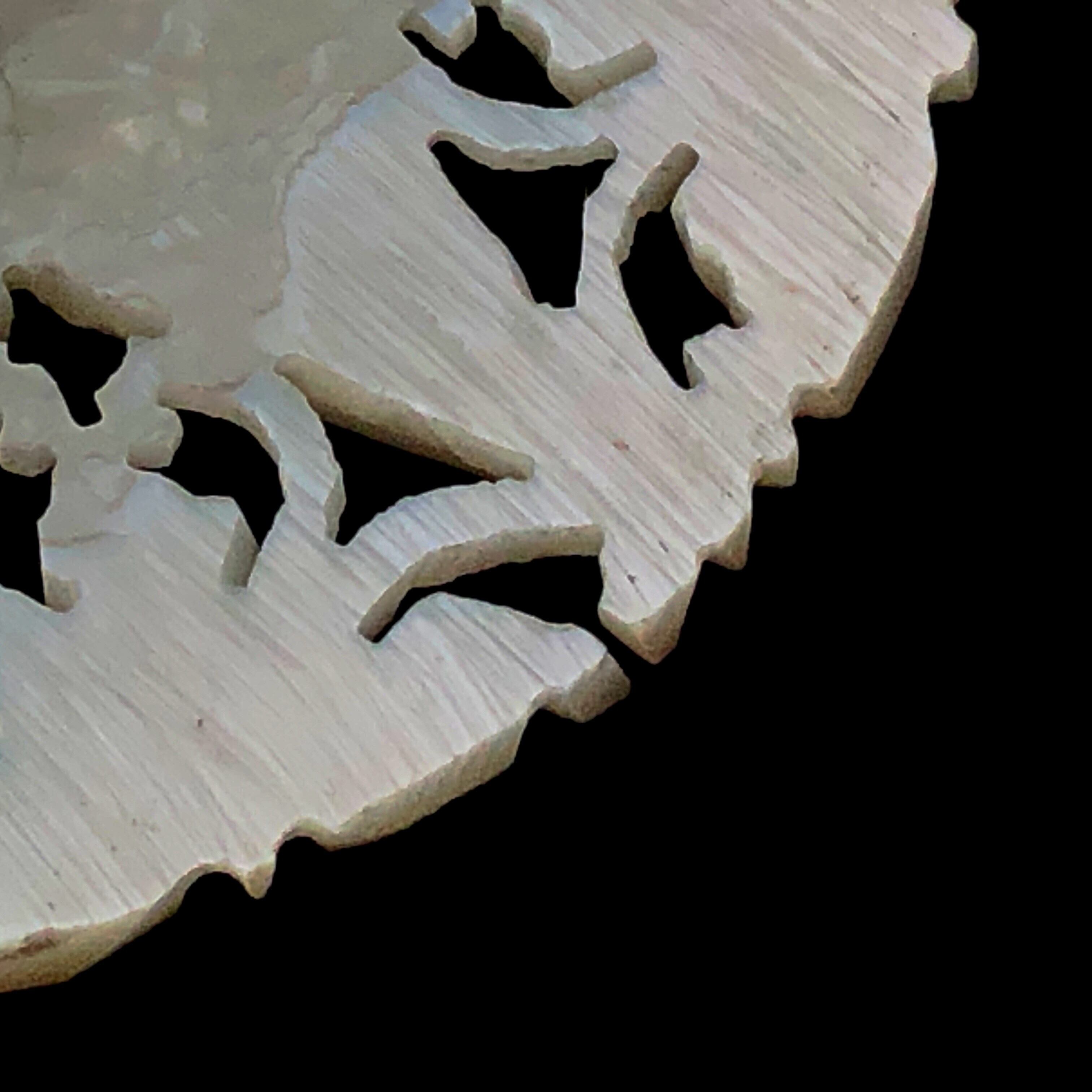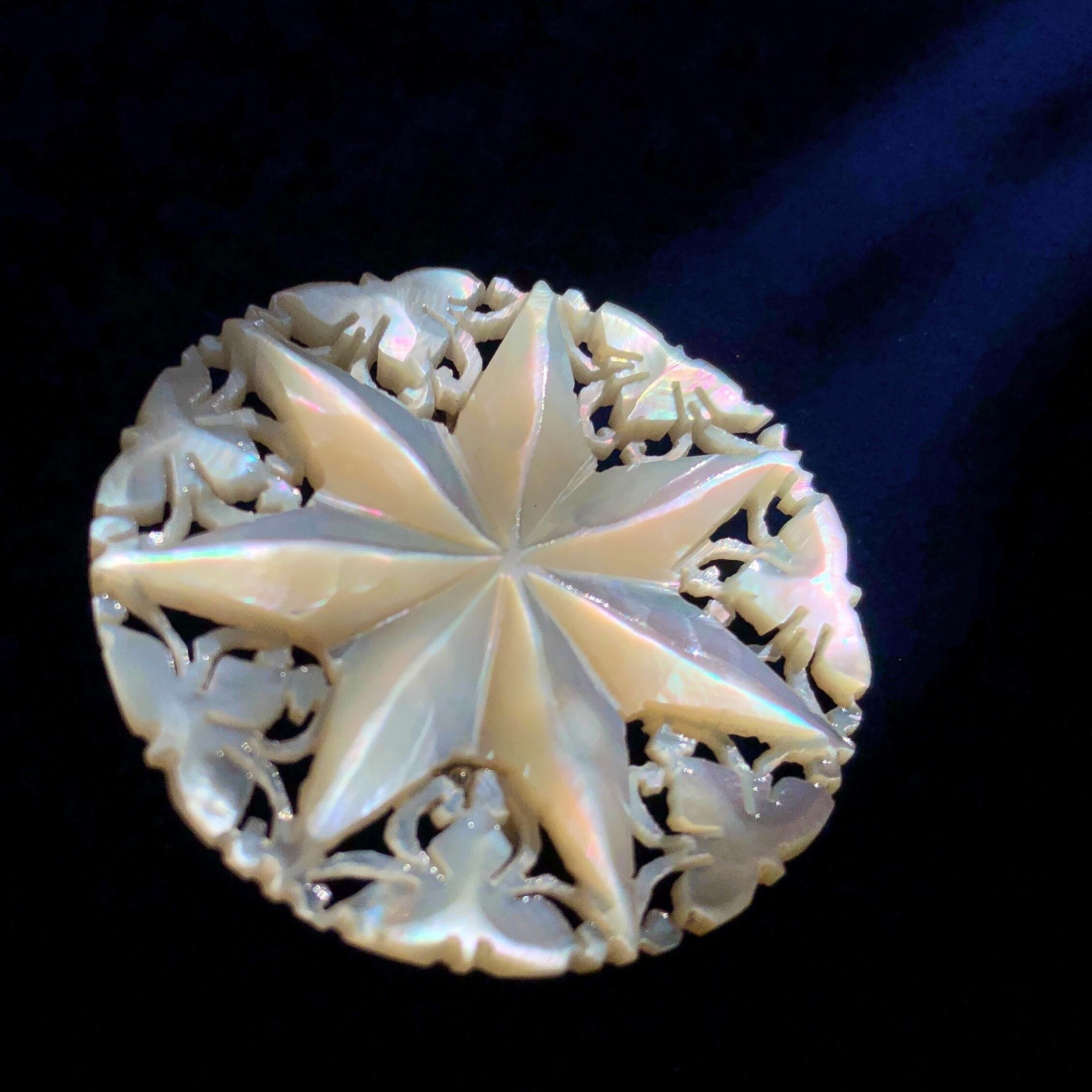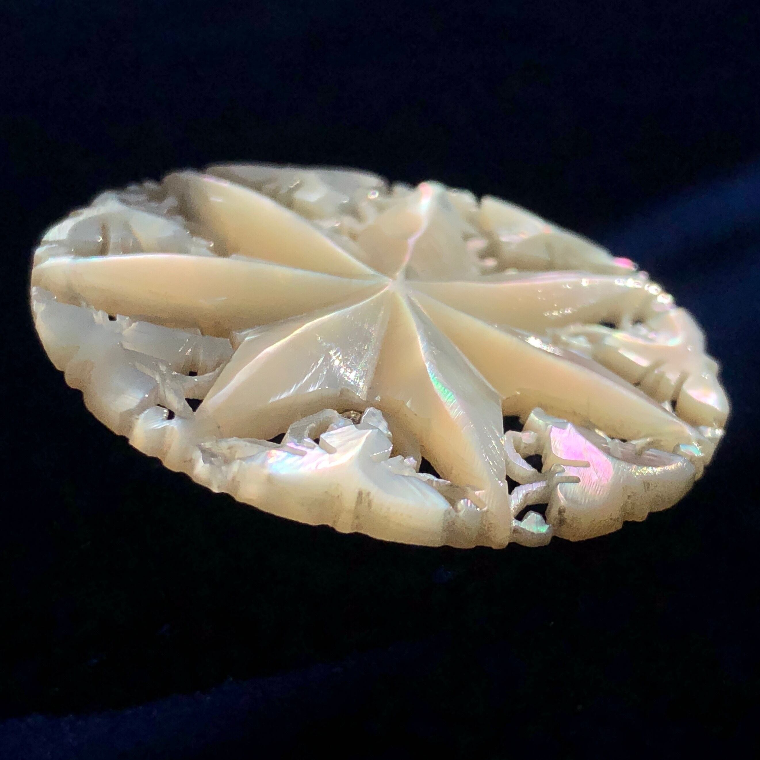 天然の貝を使ったお品はひとつひとつ違う特徴を持っていますが、こちらは真珠貝特有の美しい虹色の光沢にまず目を奪われます。さらに彫りも繊細で表面に柔らかな艶を帯び、優しくも神々しい仕上がりになっています。