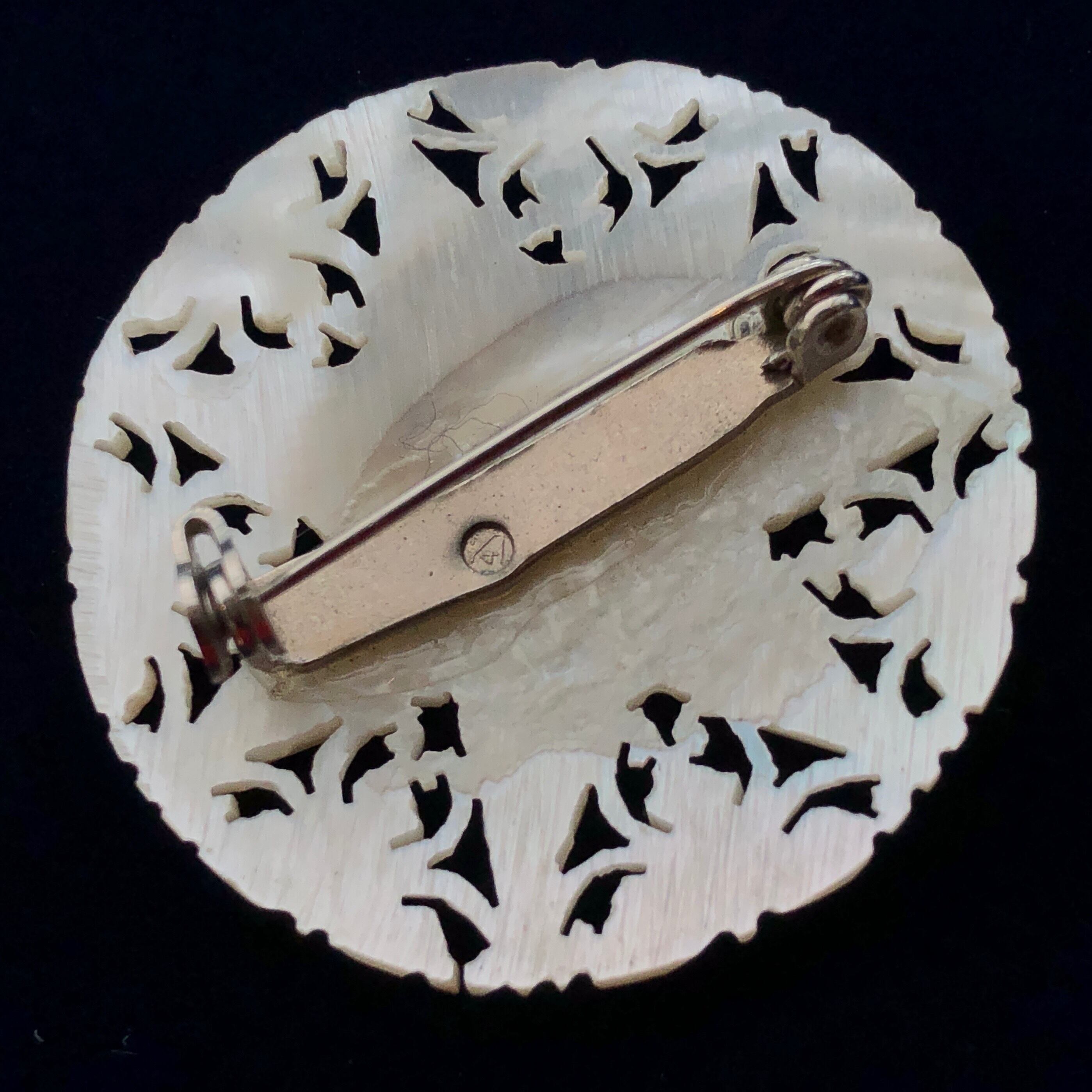 ベツレヘムで真珠貝を手彫りしたブローチです。昔からの手彫りを守り、時間をかけて彫ることに祈りの意味もあったようです。当地を巡礼で訪れた方々が、このような装飾品をイエス・キリストにまつわる遺跡に触れさせて、記念に持ち帰ることもありました。