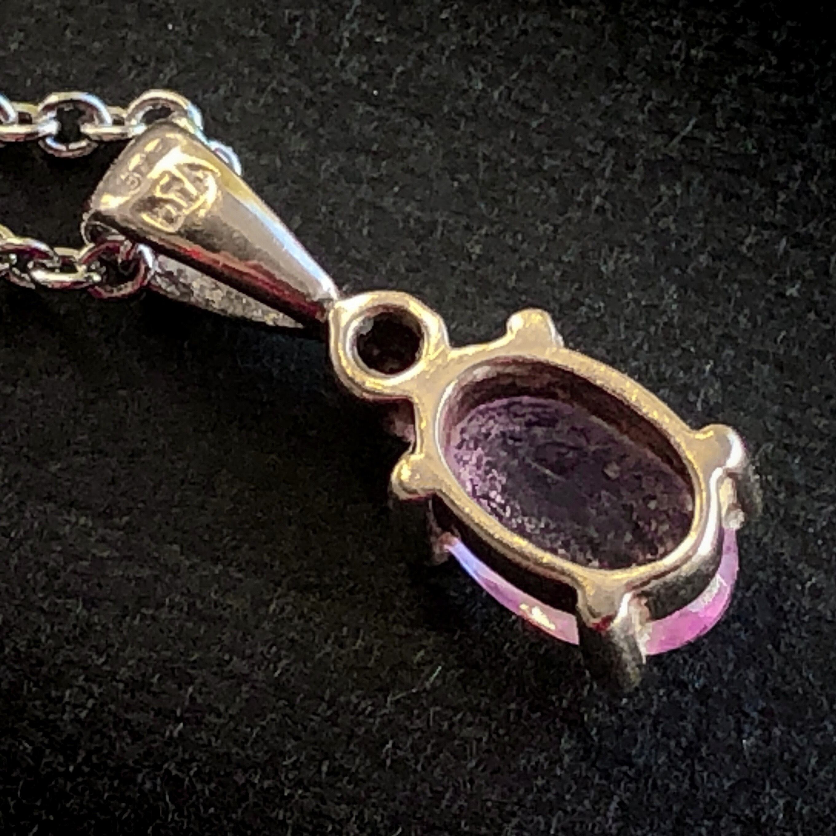 20世紀前半までのイギリス製。サイズはアメジストが約0.4×0.6センチ、ペンダント全体が約1.3センチです。チェーンは現行品で長さが約43センチです。