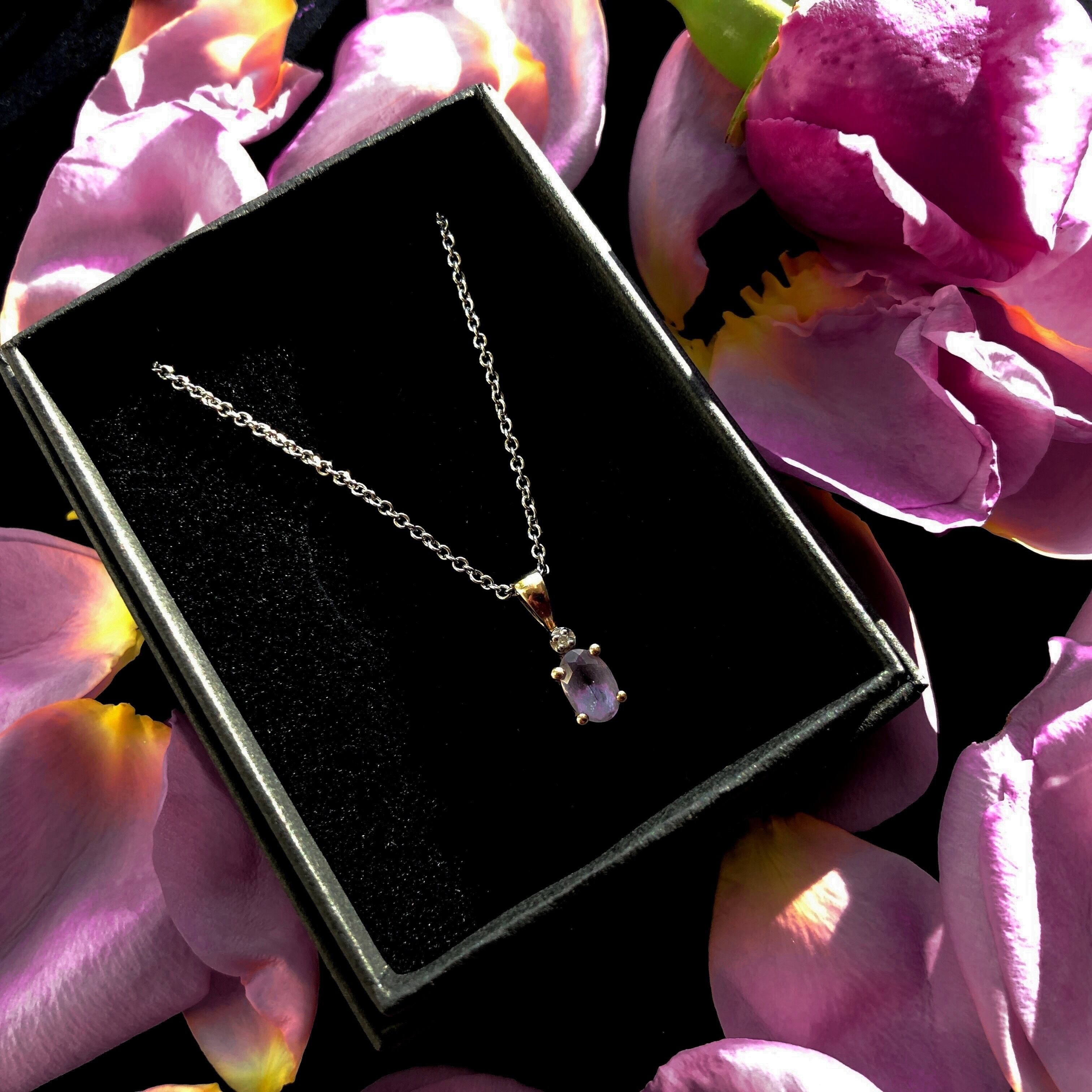 小さなアメジストが一粒置かれたペンダントです。淡いピンクの石は綺麗にカットされて、とても可愛らしく、清楚な、しかしどこか儚い美しさを感じさせます。そして、その小さな粒に上に、さらに小さなダイヤモンドが置かれています。この極小の煌めきは、美しくも儚げな淡いピンクの石に何を付け加えようとしているのでしょうか。小さな世界に密やかに生まれるドラマを、どうぞ身につけてみてください。