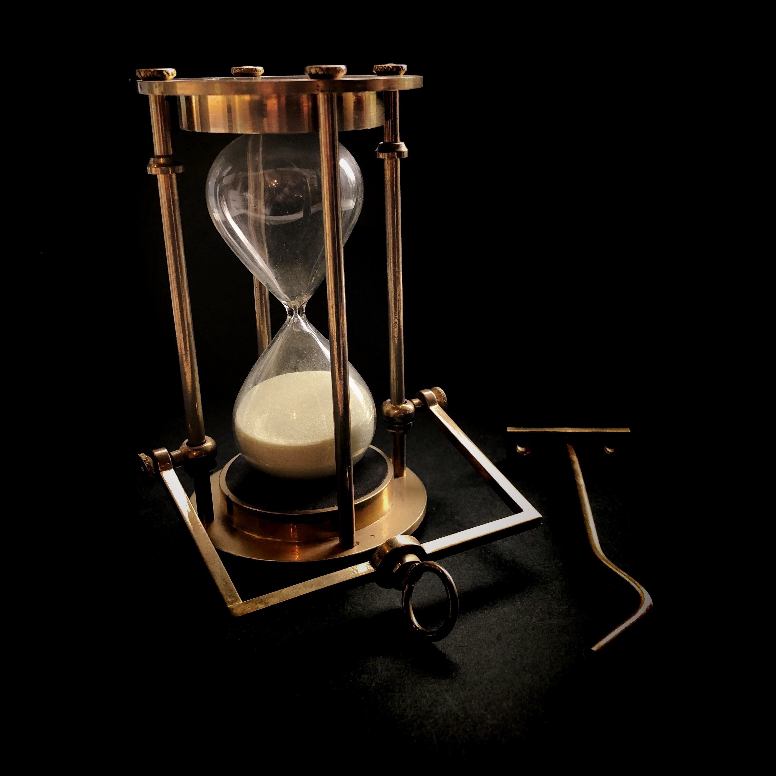 正確な電波時計などが普及している現代ではいかにもアナログな道具ですが、砂時計は時代を超えて「時間」の、それも「儚く過ぎゆく人生の時間」の象徴であり、人生の旅を行く船のキャビンで揺れている様を想うのも一興でしょう。