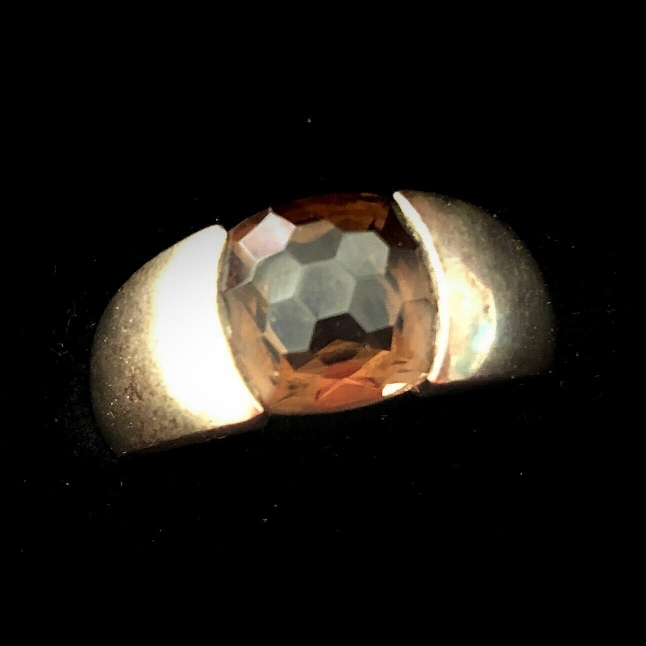 鈍いシルバーの台座にスモーキークウォーツが一粒置かれています。この水晶の色味を一言で申し上げることは困難です。黄色味、黒味が複雑に混じり合ったやや薄い茶色、カットされた透明感のある石の側面からも光が入り瑞々しい煌めきを宿す瞬間もあり、上品な落ち着いた佇まいの中に清らかな快活さがちらりとのぞくという感じでしょうか。