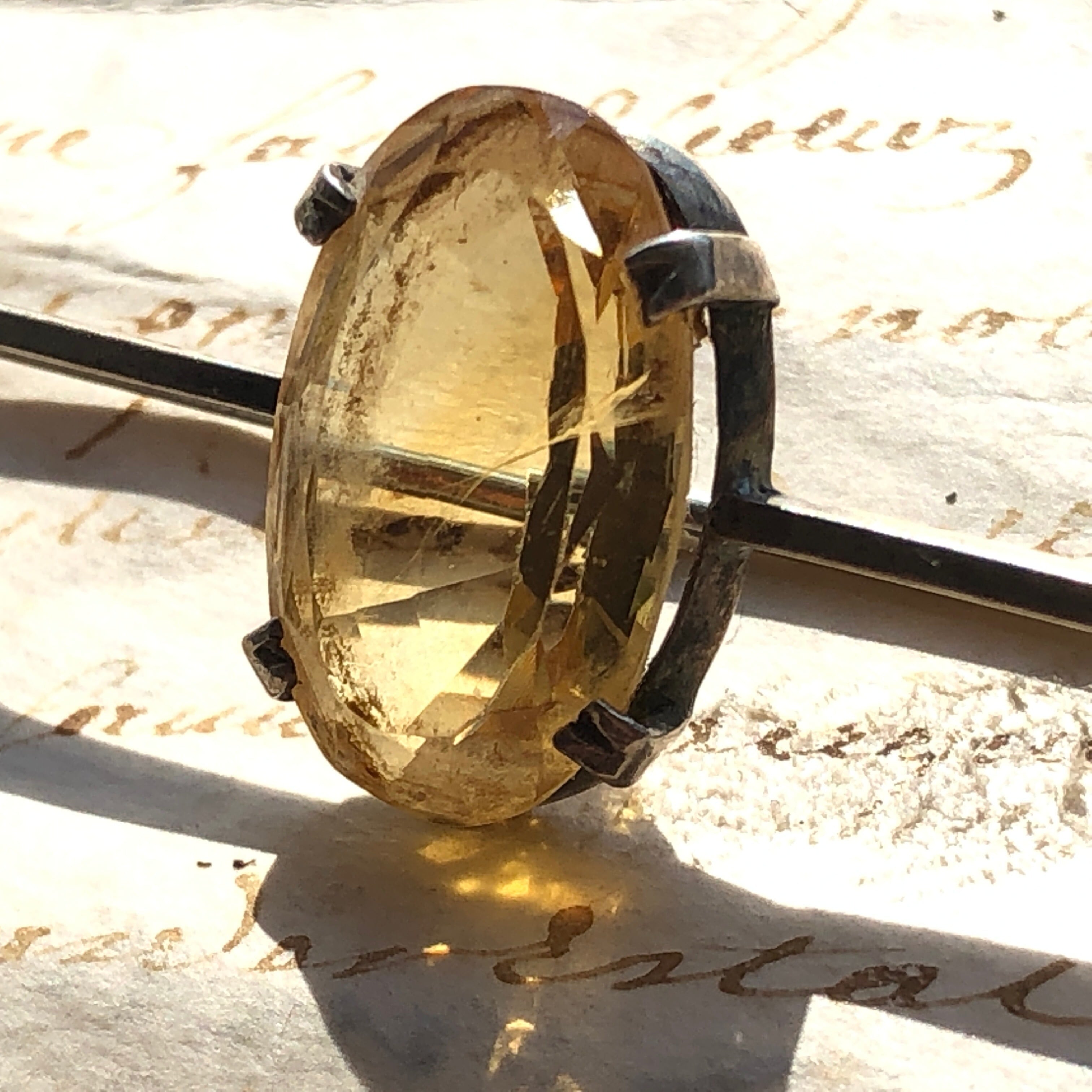 銀色のバーはホールマークが確認できず、素材についてははっきりとしたことは申し上げられませんが、古色を帯びた鈍い輝きは、瑞々しく艶やかな黄水晶の質感をさらに引き立てています。
