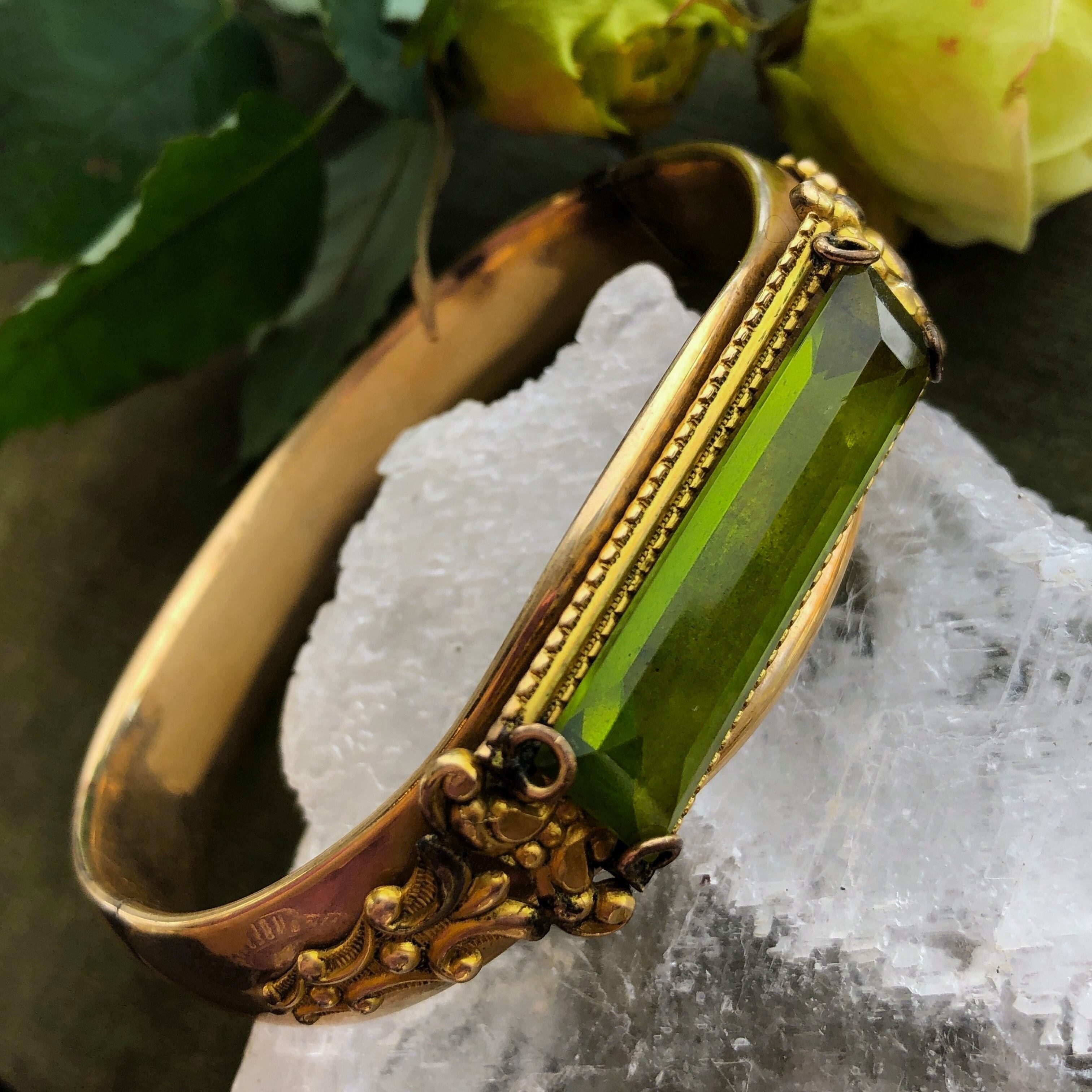 綺麗にカットされた軽やかな黄緑色のガラスは美しい透明感があり、金属の部分は金張りか金メッキかははっきりしませんが、金よりも少し赤みを帯びていますので、金に混ぜ物をして色味を整えたローズゴールドを張ったものとも思われます。一足早く早春の息吹を身にまとってはいかがでしょう。