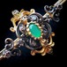 中央にミルキーグリーンのエメラルドを置き、細やかな装飾の中にはクリアなダイヤモンドを配したブローチです。金属部分は銀の純度92.5%以上のスターリングシルバーに金の彩色を施しており、ホールマークも確認できます。エメラルドの周囲は敢えて彩色をせずにシルバーを残したようで、その部分が時代とともに黒みを帯び、華麗な意匠が金色と黒の大胆で見事な対比を見せる姿はまさに時の流れだけが生み出すことのできる景色と言えます。