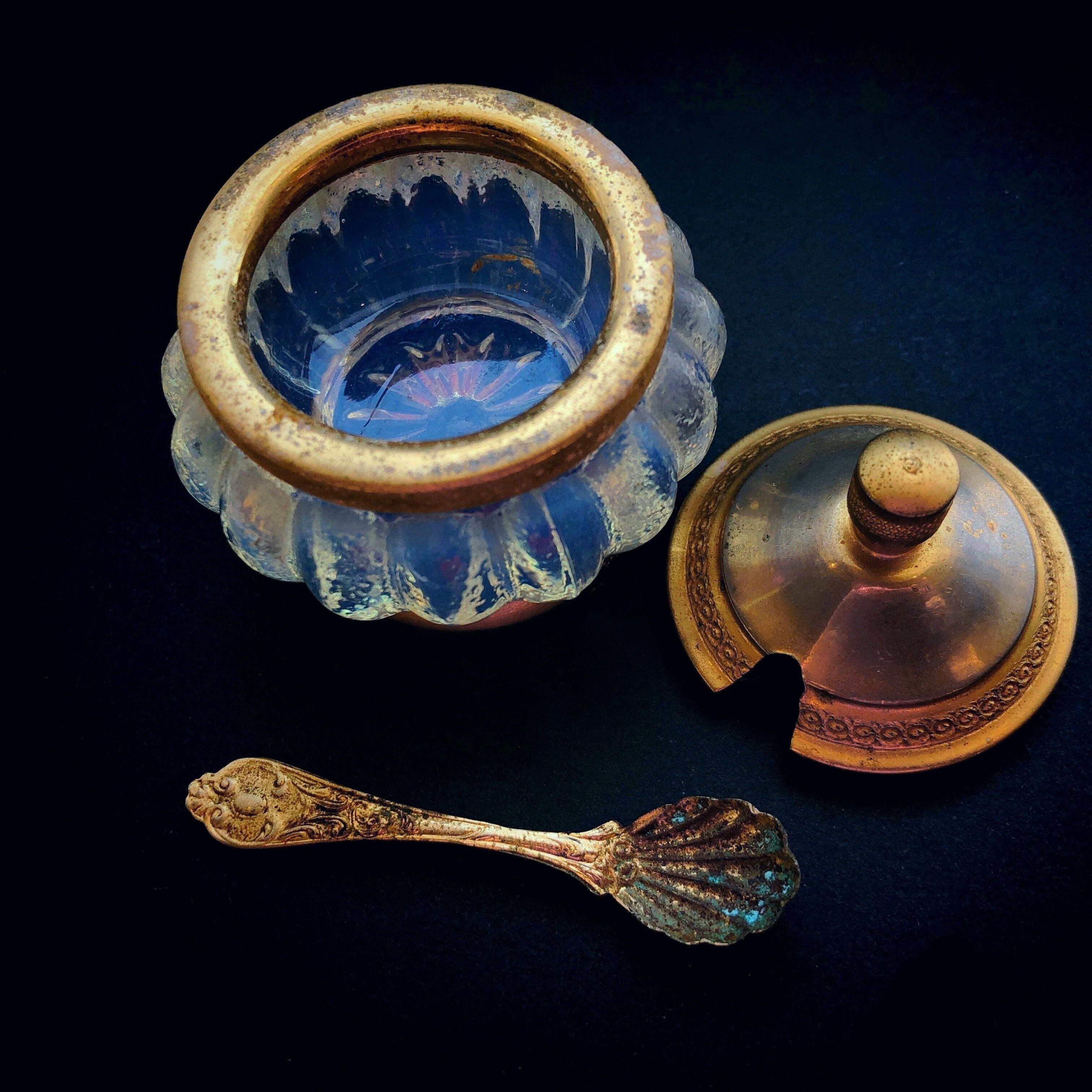 オパールセントガラスのミニポットはいかがでしょう。順光で見ると青白くぼんやり光って見え、逆光で見ると遊色が現れるのがこのガラスの特徴ですが、こちらのお品は特に透明感があるガラスの表面にごく小さなおうとつが施されており、光線を浴びると光の粒が散りばめられたような煌めきを見せるところが印象的です。遊色も薄いレモン色で、まるでレモンの果汁がガラスに拡がったような独特の質感です。金属の蓋も艶が鈍く古色を帯びています。