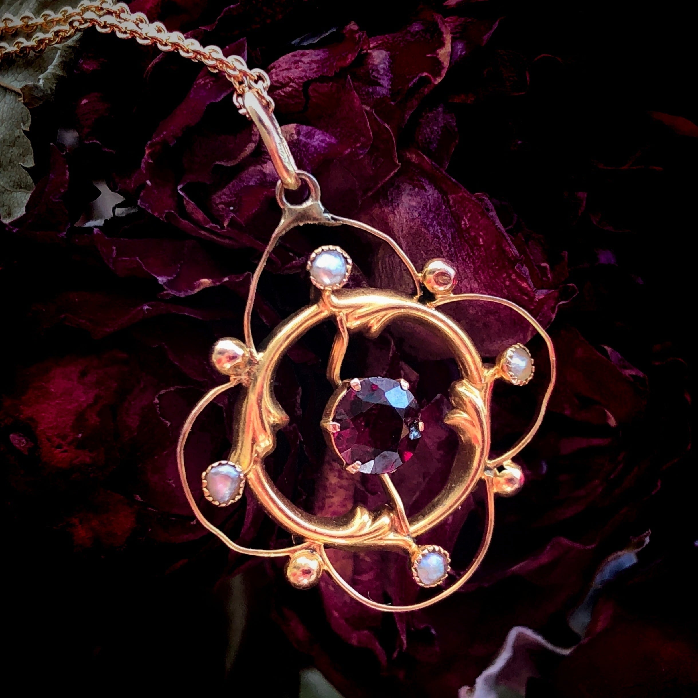 周囲にはシードパールが配置され、台座は9カラットの金で造られています。純金は白味を帯びた金色なのですが、それに混ぜ物をすることでより赤みを増したこの素材はローズゴールドなどとも呼ばれています。虹色の艶をまとった白いシードパール、ローズゴールドの細やかな曲線、そして中央で様々な表情を見せる一粒の石。その全てがとても優雅に調和しています。