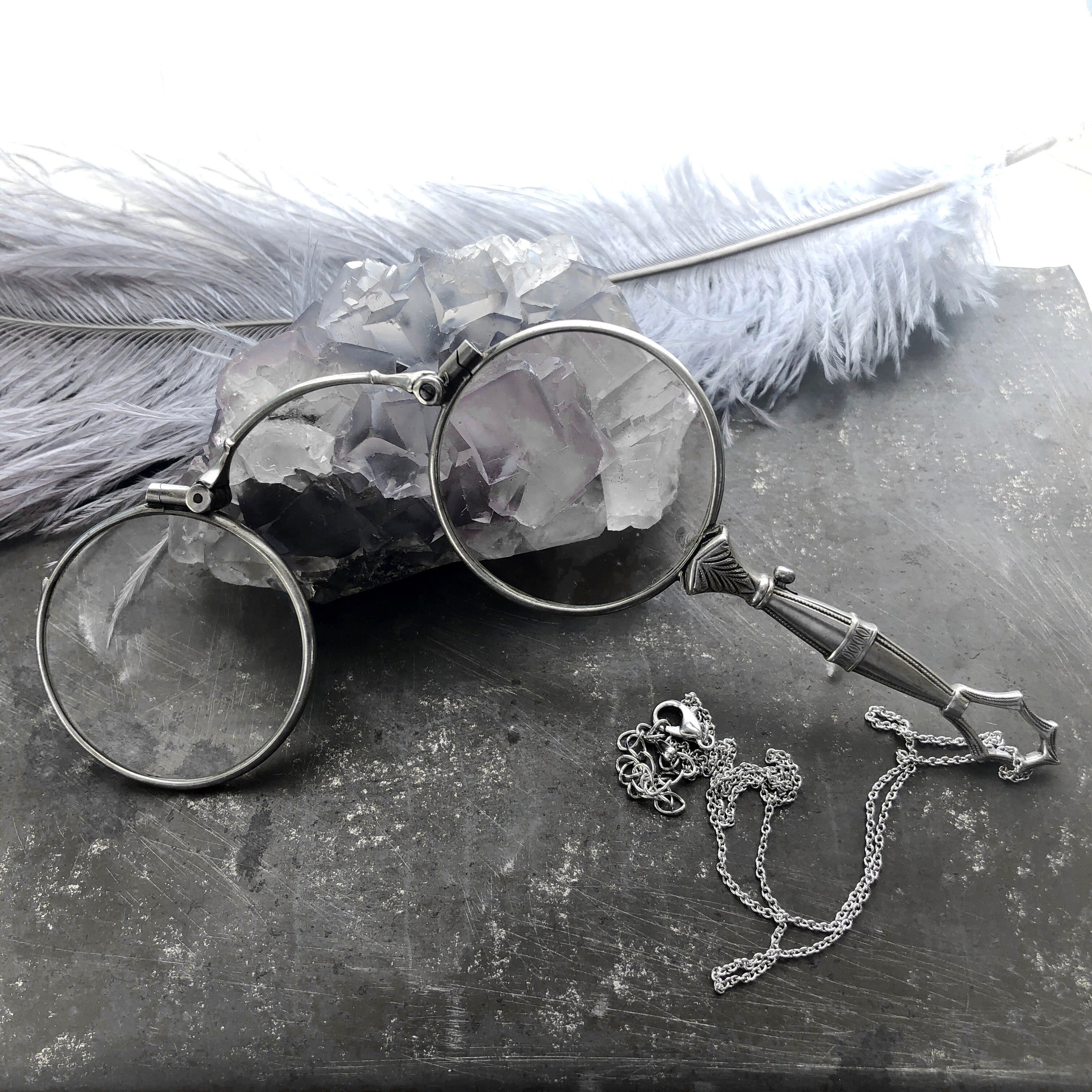この金属の柄にレンズのついた器具は何でしょう。拡大鏡でしょうか。実際、拡大鏡としても使えますが、柄についた小さな突起を下にずらすとポンと2枚のレンズに!なんとこれは現在で言う老眼鏡なのです。お年寄りでなくても小さい文字は読みにくいものですが、これを使うと少し拡大されてしかも両眼で読み取りやすくなります。2枚のレンズを重ねればさらに拡大の倍率は高くなり、拡大鏡の用途にも使えるという便利なお品なわけです。