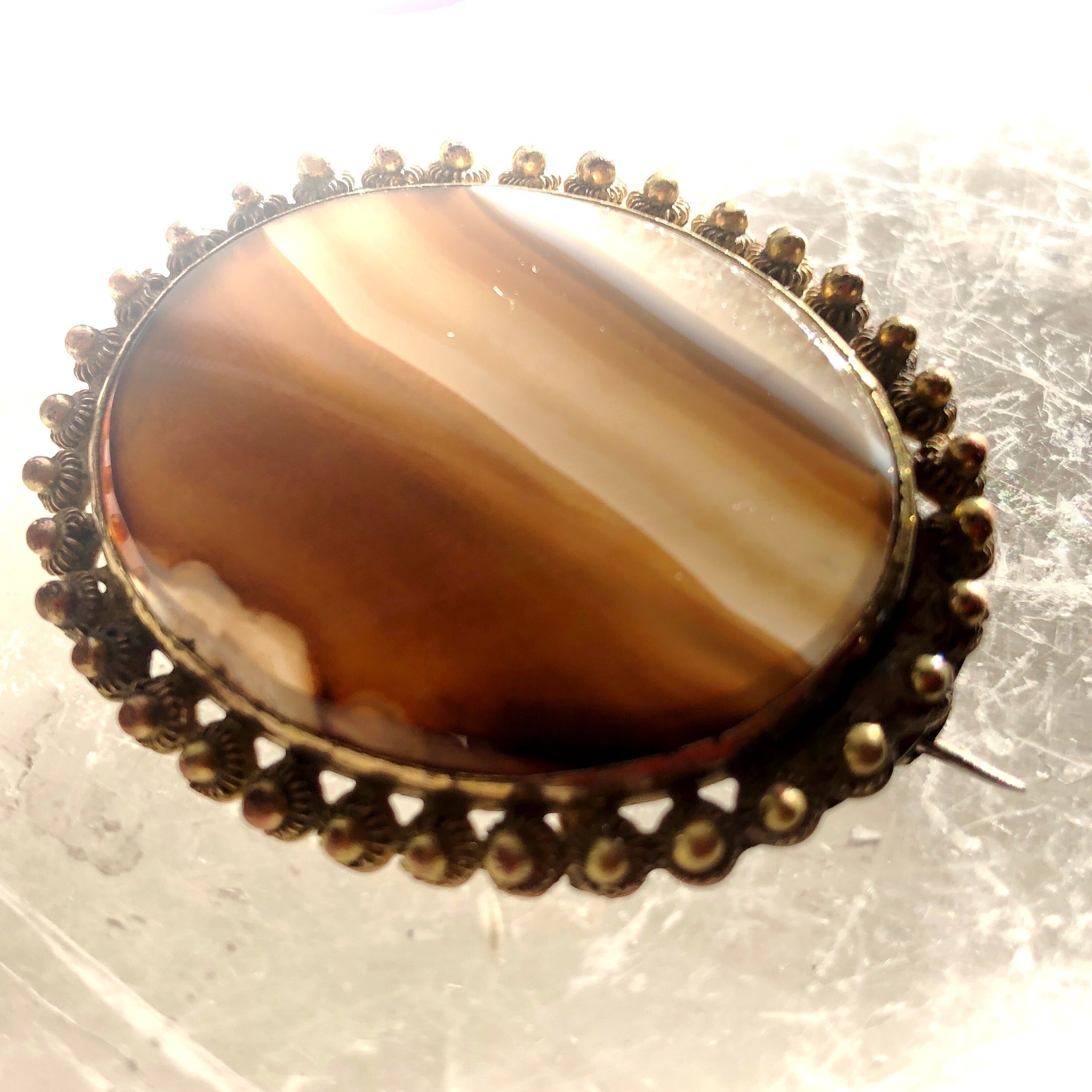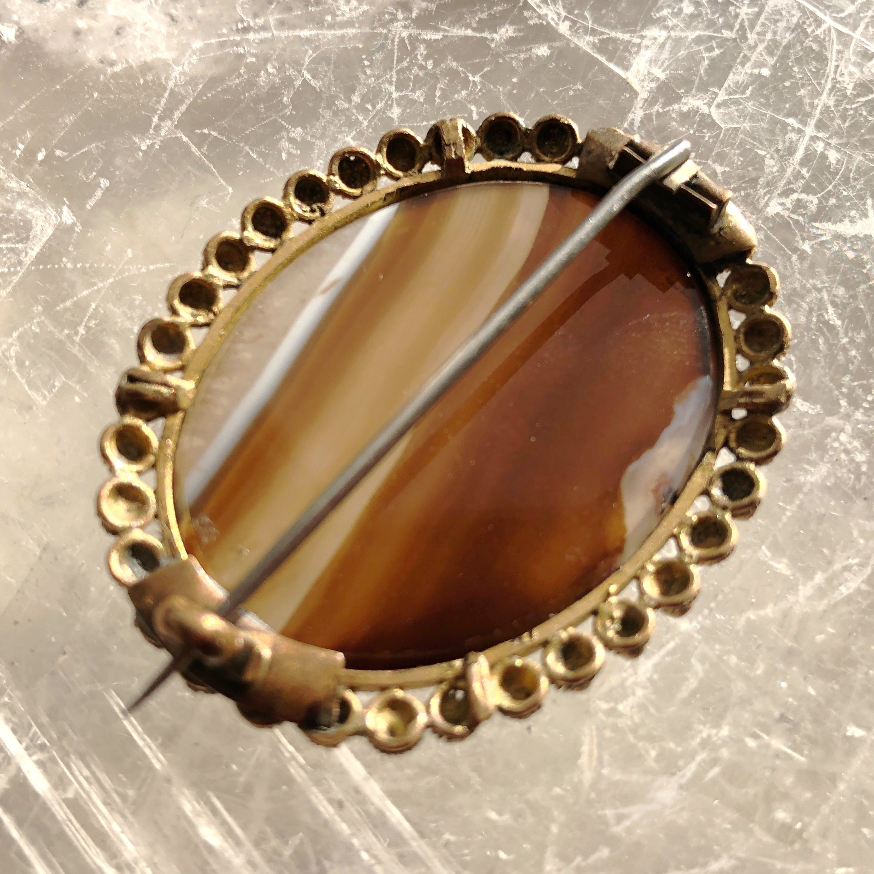 この不思議な風景は何でしょう。150年前の望遠鏡で見た木星の表面でしょうか。これは縞瑪瑙の楕円の板に枠をつけて固定したブローチなのです。自然が造り上げた模様なのですが、それだけでなく半透明で光を通しますので、光の具合によって暗闇に白い線の風景になったり、また明るく縞模様のグラデーションを見せたりと様々に変化します。