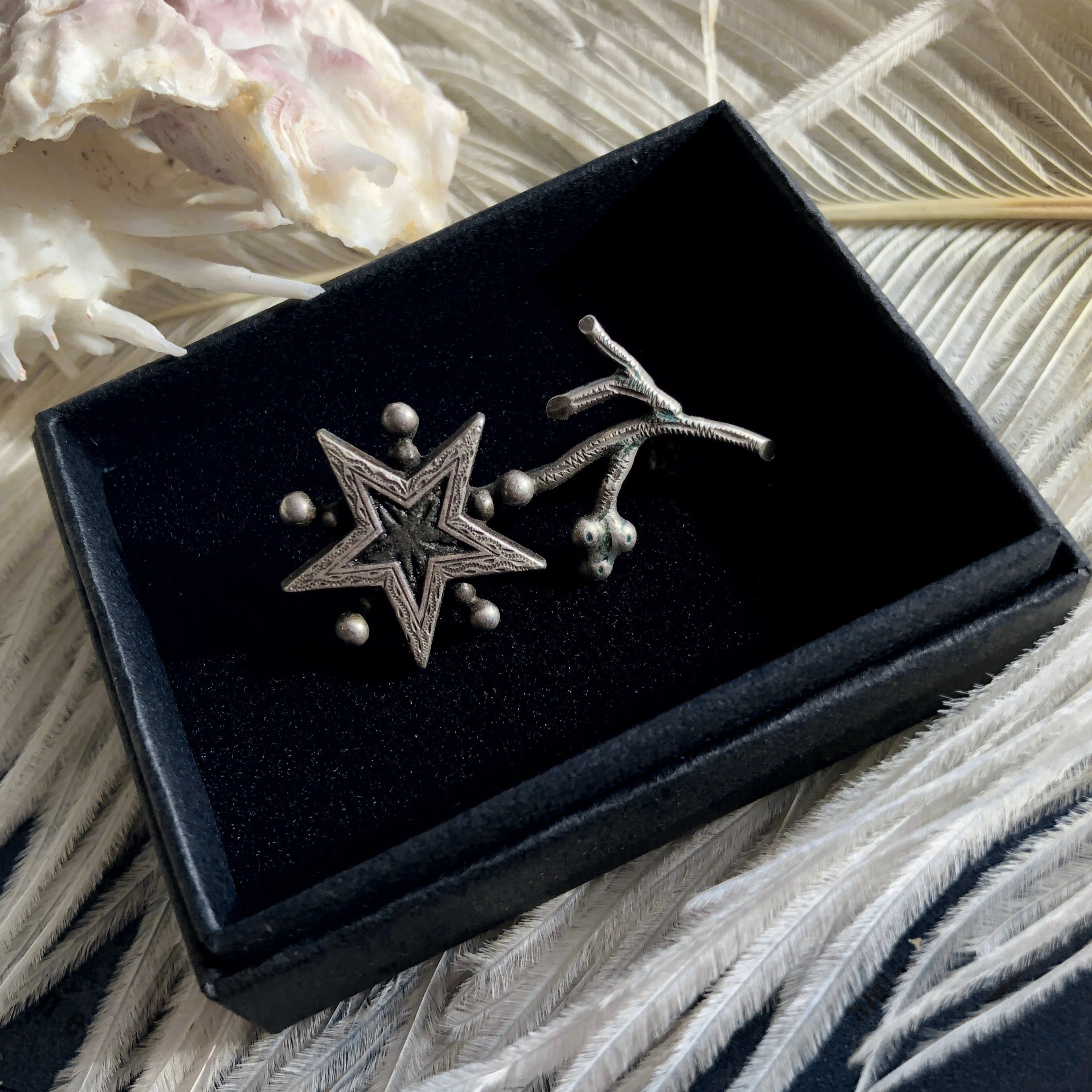 鈍いシルバーの枝に星がひとつ。その中央には黒みを増した焦茶の五稜星が置かれています。その深い色合いは永遠に続く暗闇への入り口のようでもあり、よく見ると全ての角に闇の世界への道標のように線が刻まれています。こちらはウミユリの化石で、その過ごしてきた長大な時が生み出すのでしょうか、見る人を別世界へと誘う魅力があります。