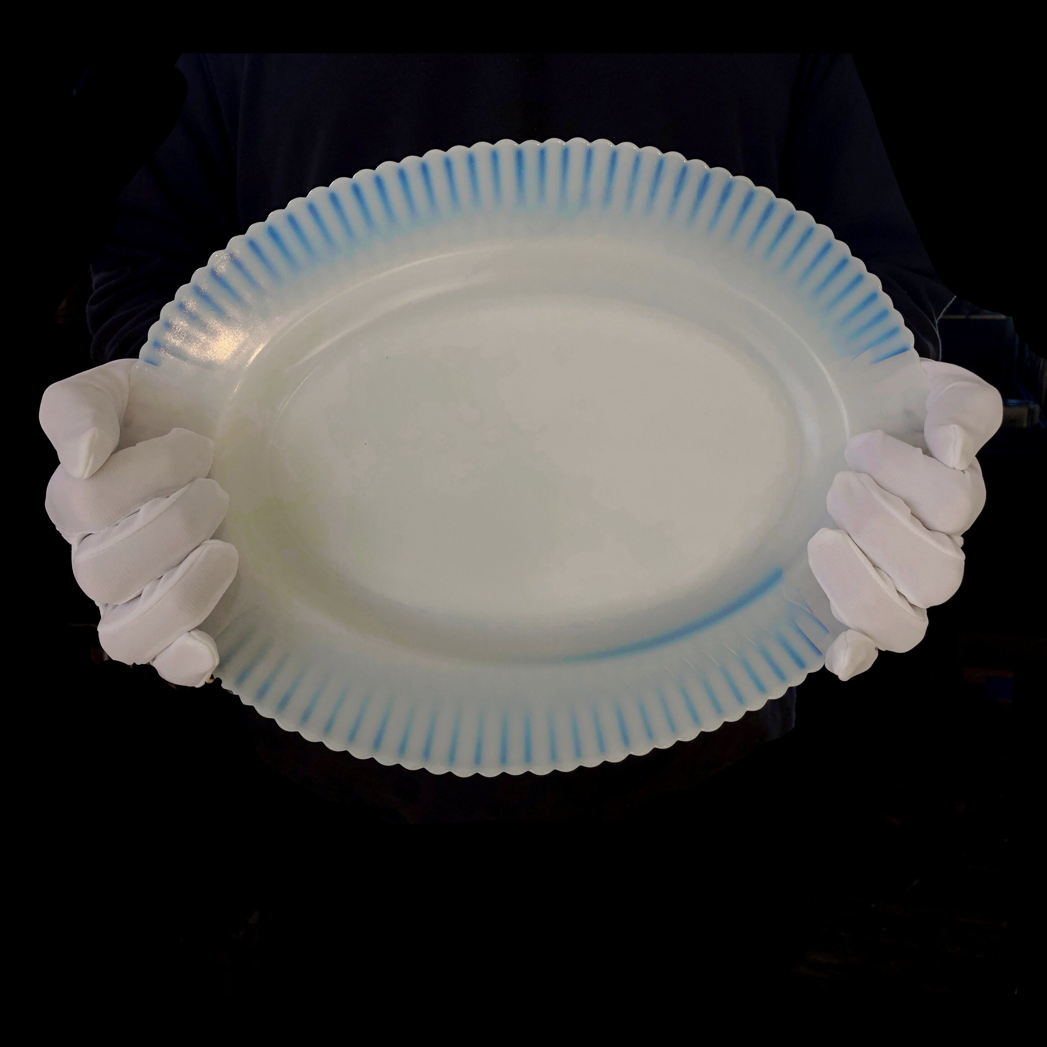 こちらはガラスらしからぬ柔らかな肌触り、青白くぼんやりとした佇まい、さらに光線の加減で浮かべる遊色が特徴のオパールセントガラスの楕円形大皿です。そのどこか靄に包まれてふわりと浮かんでいるような姿は夢に出てくるもののようです。中でもこちらは周囲に花びらのような縁取りをつけただけのプレーンな造形で、本体の幻想的な質感がよく生かされています。