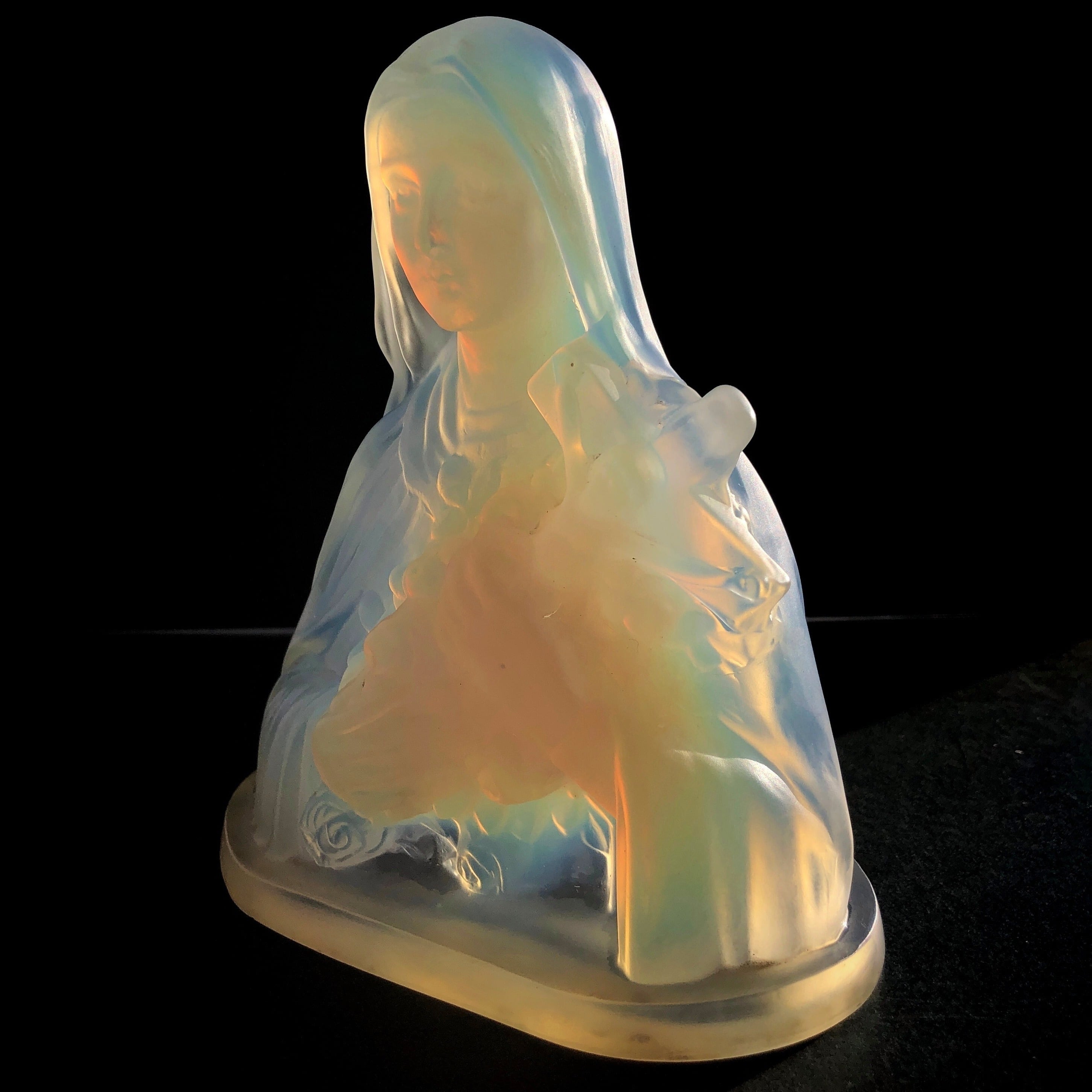 オパールセントガラスの聖テレーズ半身像です。オパールセントガラスは、ガラスとは思えない柔らかな質感で青白く佇む雰囲気ですが、光の加減で様々にアプリコットの遊色を浮かび上がらせます。こちらのお品は、まず何と言っても内部から発光しているかのような青白い色調が美しく、さらに像の流れるようなおうとつやローブの襞に合わせて濃く、薄く、ぼんやりと幻想的な遊色を浮かべます。また背後から光をあてるとお顔が特に濃く色を帯びて浮かび上がり、目の周りに宿るレモン色の煌めきも印象的です。ぜひ自然光でご覧ください。