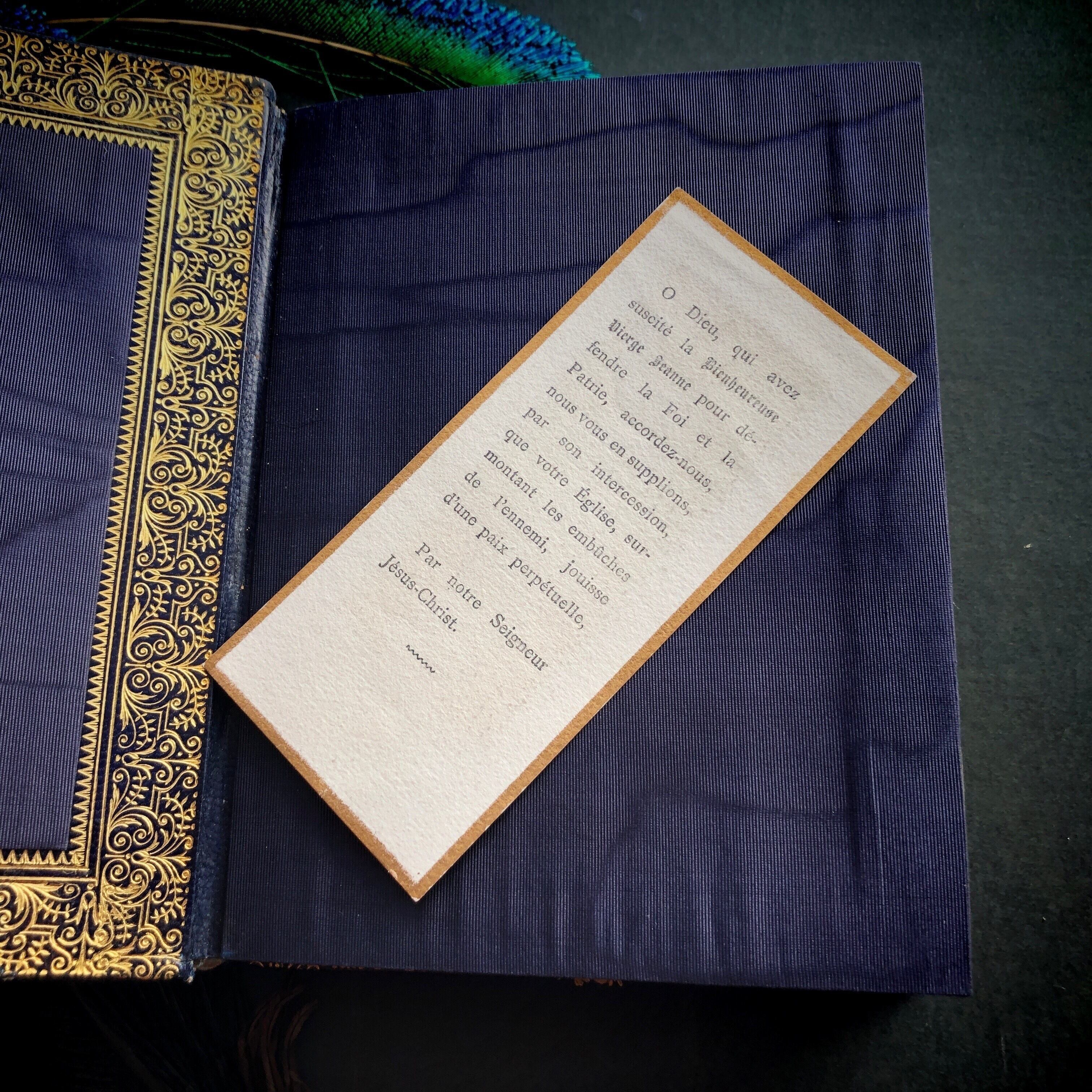 他にも数多くの聖女が手彩色の挿絵とともに出てきますが、それではフランスの守護聖人ジャンヌ・ダルクはどうでしょう。神の声を聞く彼女の姿の挿絵とともに採り上げられてはいますが、しかし、"Sainte"「聖」の称号はありません。この祈祷書は、出版年の記載はありませんが売主の情報によると1900年とのことです。彼女が列福されるのは1909年4月18日ですから、この書籍が世に出た時にはまだ聖人ではなかったということなのかもしれません。その代わりということなのでしょうか、ジャンヌ・ダルクの列福を記念するカードが挟み込まれていました。これは、かつての持ち主が1909年当時、彼女に捧げるべくこの本にしのばせたものと思われます。