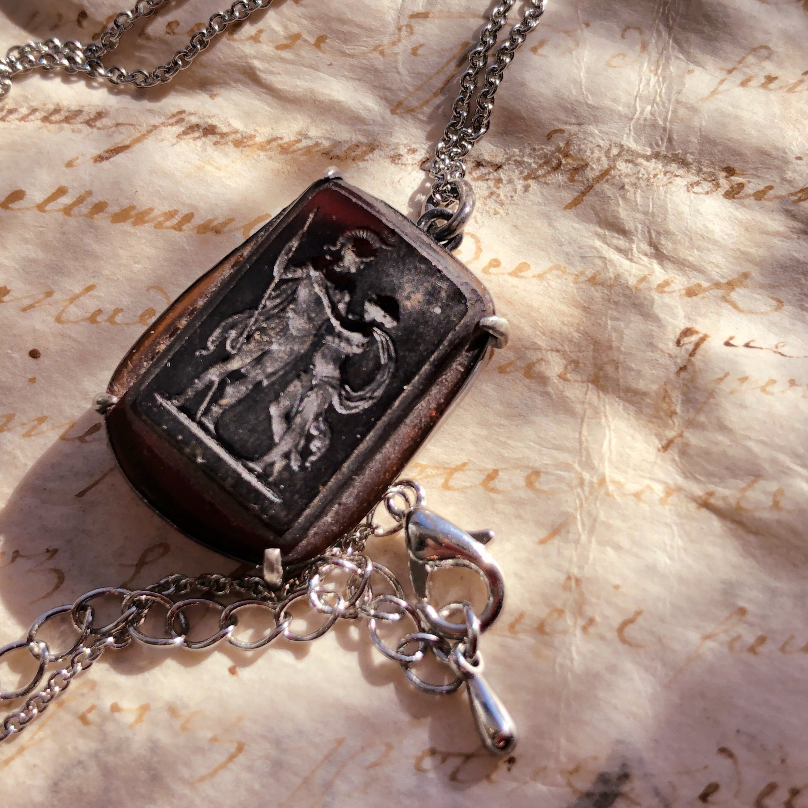 買い付けた時はガラスの印章だったのですが、せっかく素敵な彫刻が施されているので、オリジナルシルバーの工房浮草さんに依頼してペンダントに仕立てました。シルバーの台座は枠のみで、印章は爪で固定されております。裏から光が入ると濃い不透明なガラスがぽっと光を含んで柔らかなワインの色に変わり、そこにふたりの姿が浮かび上がります。どうぞお手元でお試しになってください。