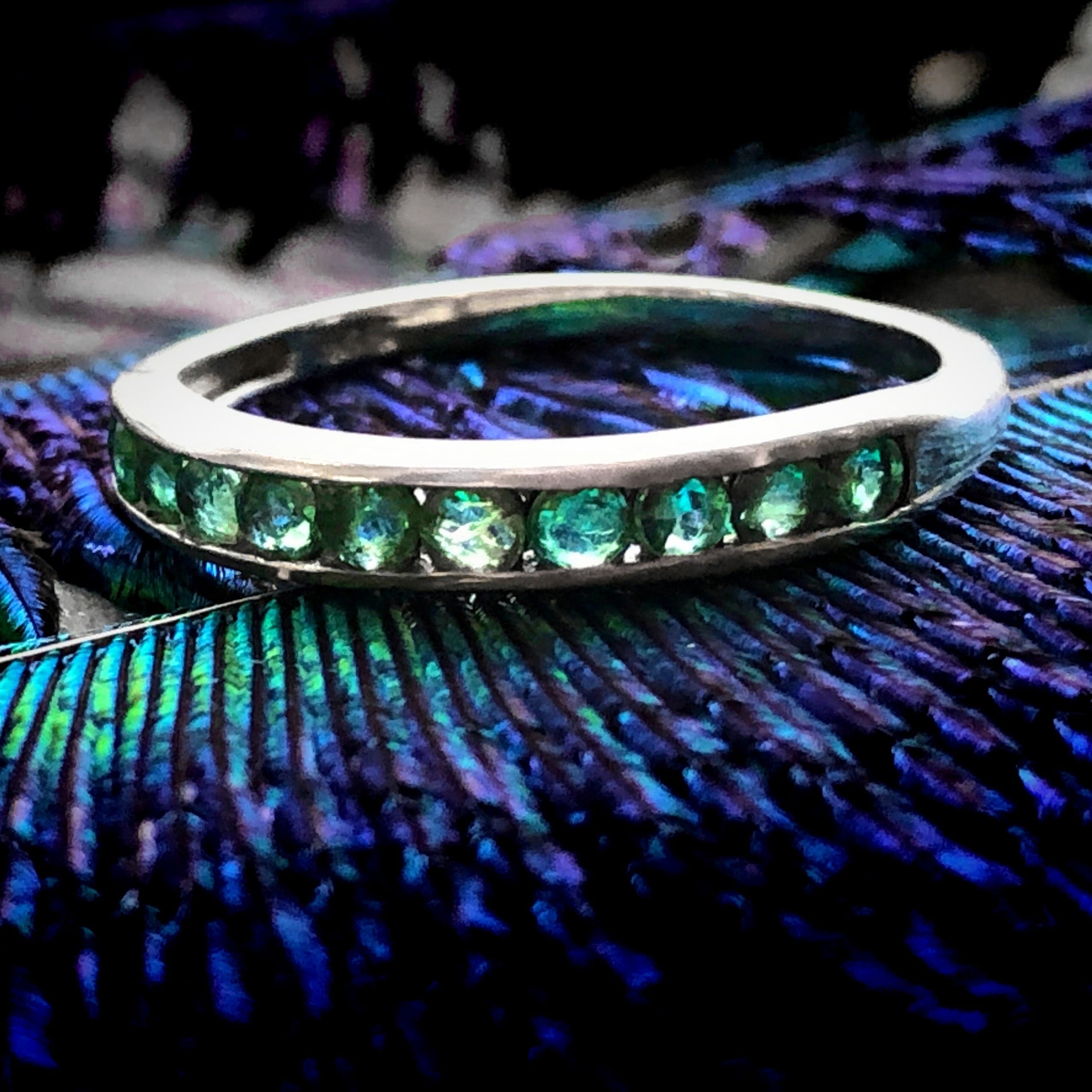 小さなエメラルドが並んだ指輪です。可憐な小粒の石は清楚な薄い青緑で、綺麗にカットされて小さな煌めきを放ち、本当に爽やかな美しさです。台座は銀の純度が92.5%以上のスターリングシルバーで、素材そのものの艶をまとっています。