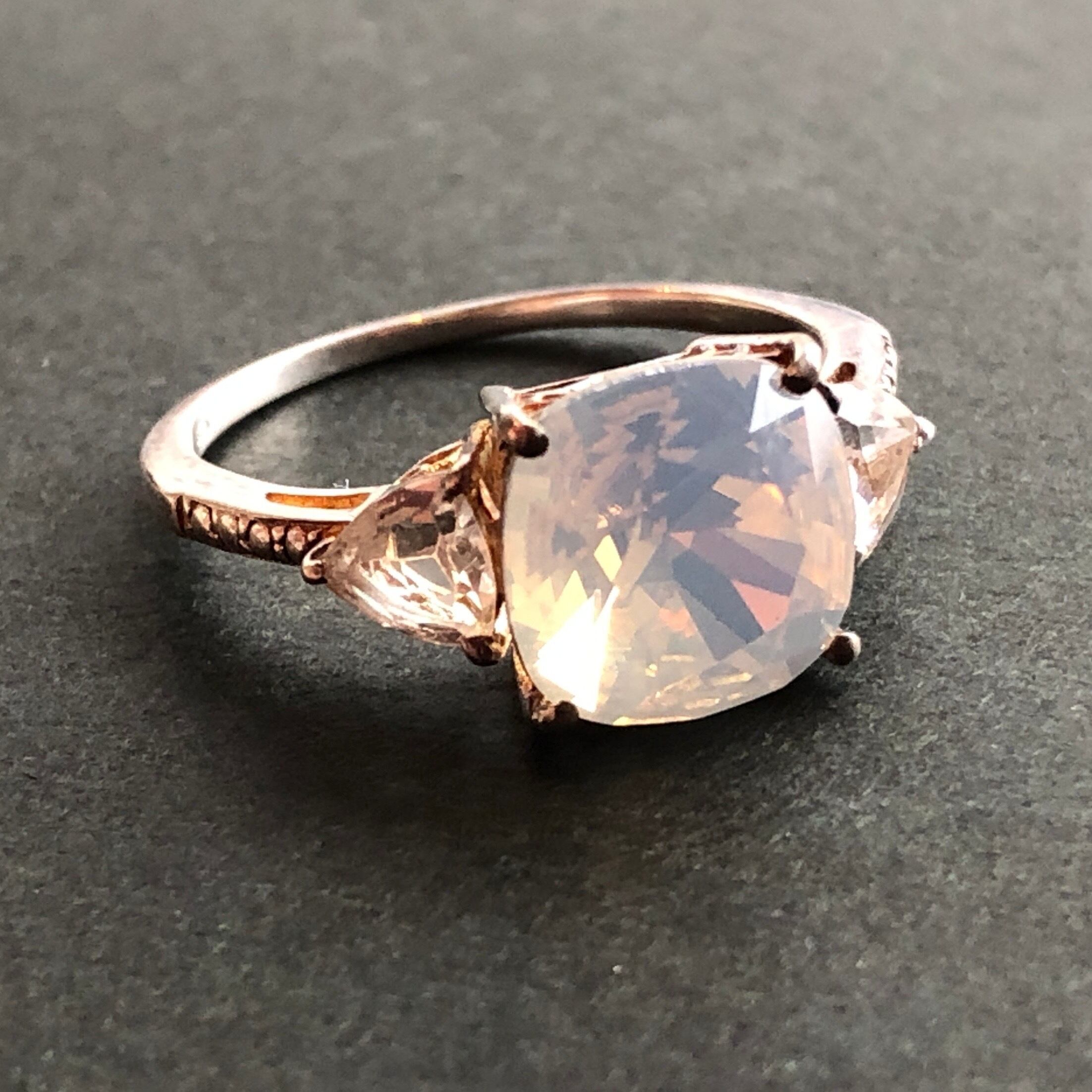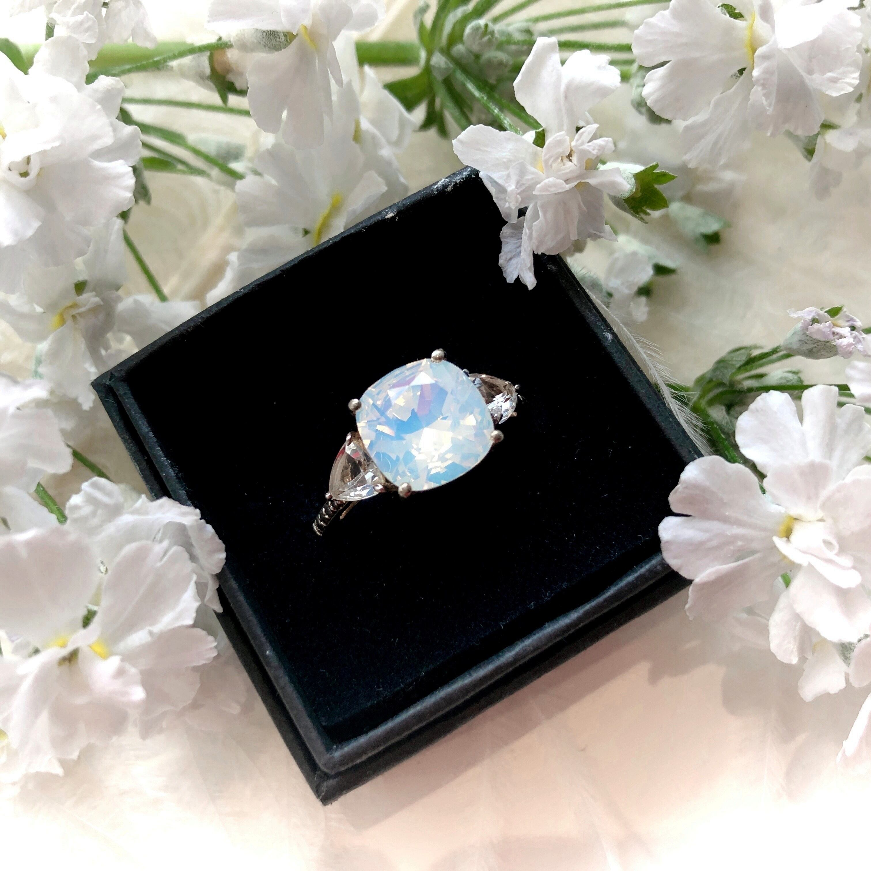 この質感と遊色の出現の仕方から、こちらはオパールセントガラスと思われます。また、その左右に配されたクリアなガラスも、綺麗にカットされ、角度によって放つ美しい煌きでこのリングの魅力をより引き立てています。こちらは、19世紀、ろうそくの灯りの下のダイヤモンドなどと称されたペーストガラスと思われます。また、台座は銀の純度92.5%以上のスターリングシルバーで、3つの粒を籠のように支えて下面からも光を受けられる手の込んだ細工が施されています。