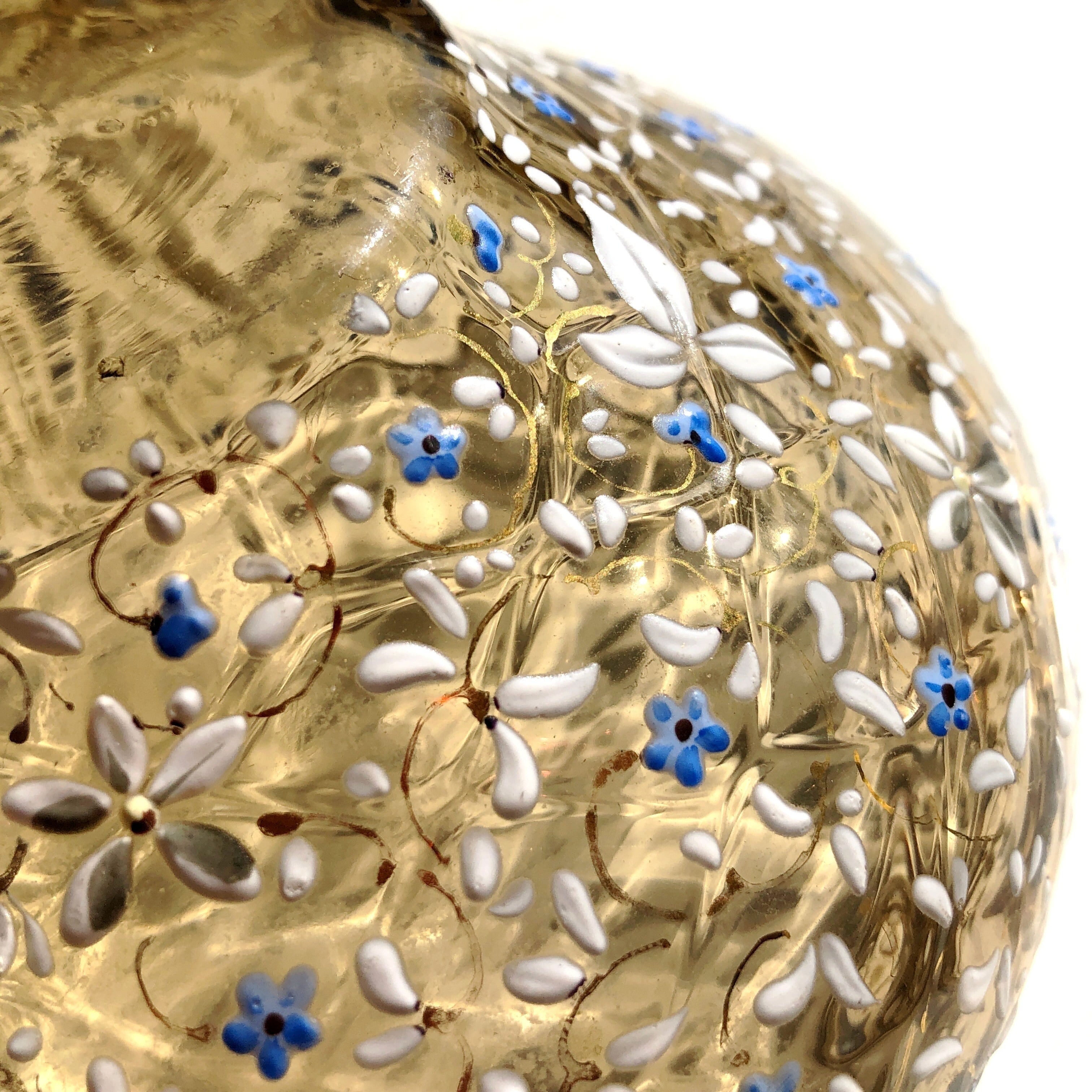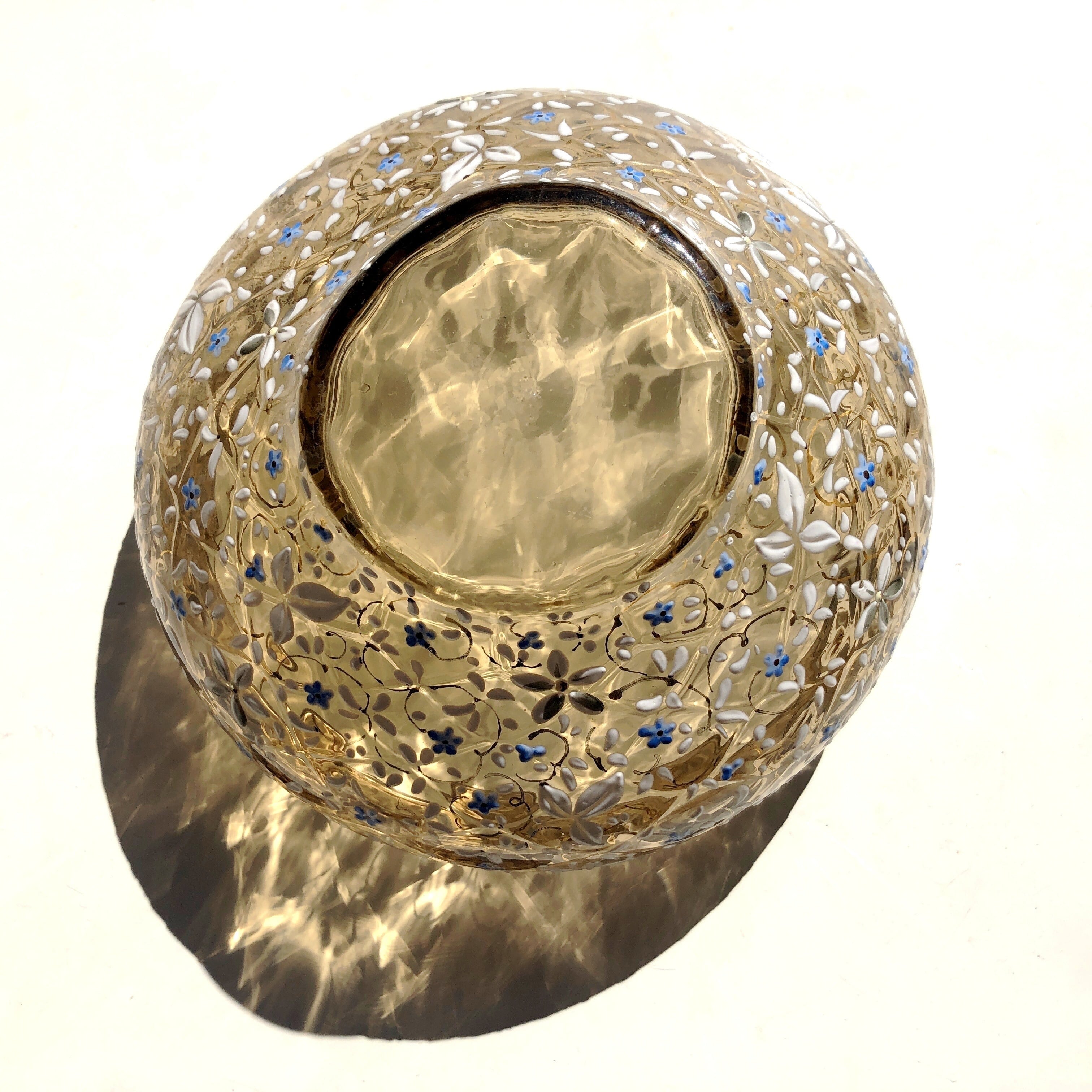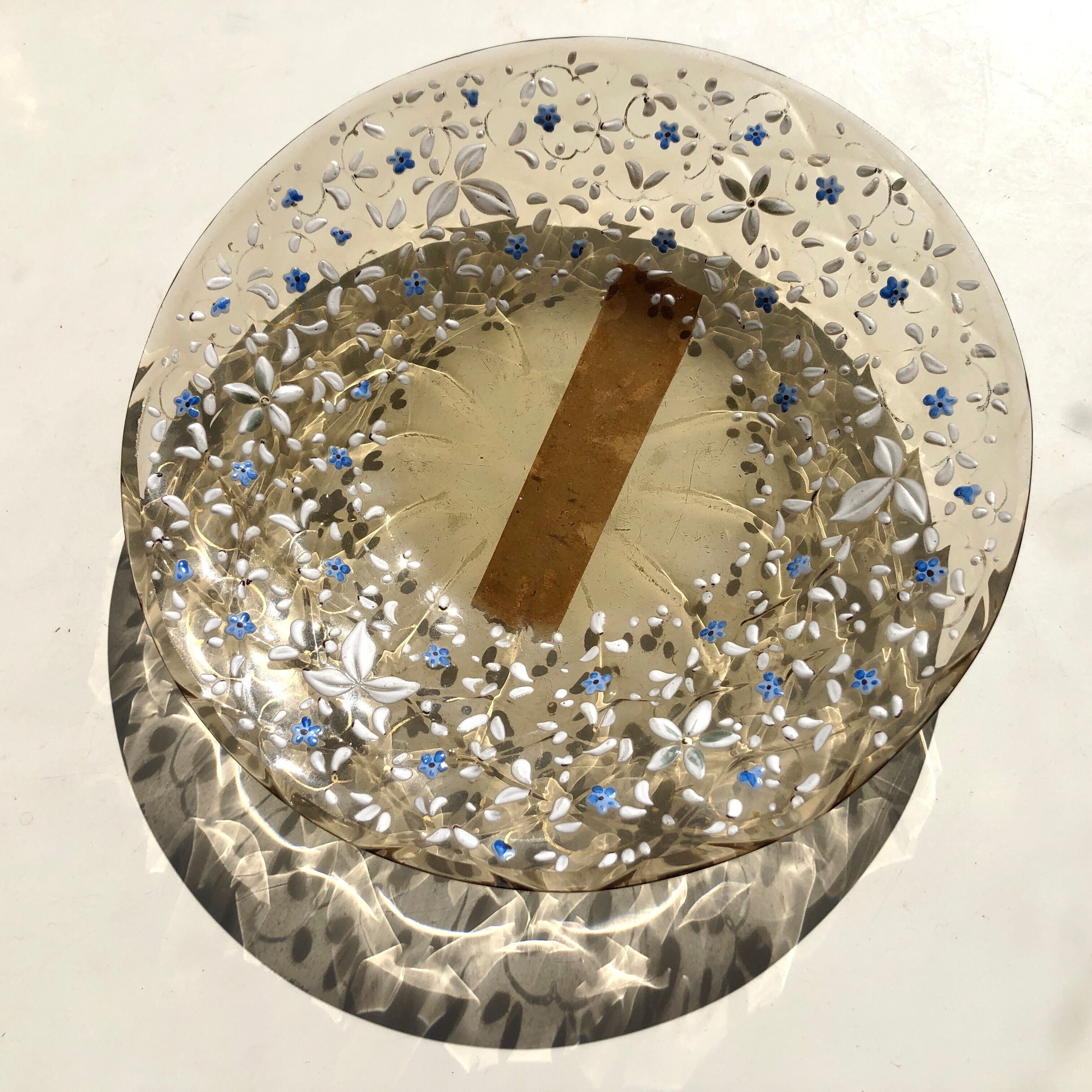 ガラスにしっとりと煙水晶の色合いを纏わせたボウルです。ガラスに施された幾何学的なおうとつがその透明感に微妙な歪みを与え、色の深みをさらに増した質感はまさに煙水晶のものです。エナメルの小花は乳白から青まで微妙に色調を変えてひとつひとつ巧みに描かれ、それが細かくびっしりとボウル、受け皿の全体を覆っています。落ち着いたスモーキークオーツの地に清々しく舞うブルー系の花々は本当によく合いますね。