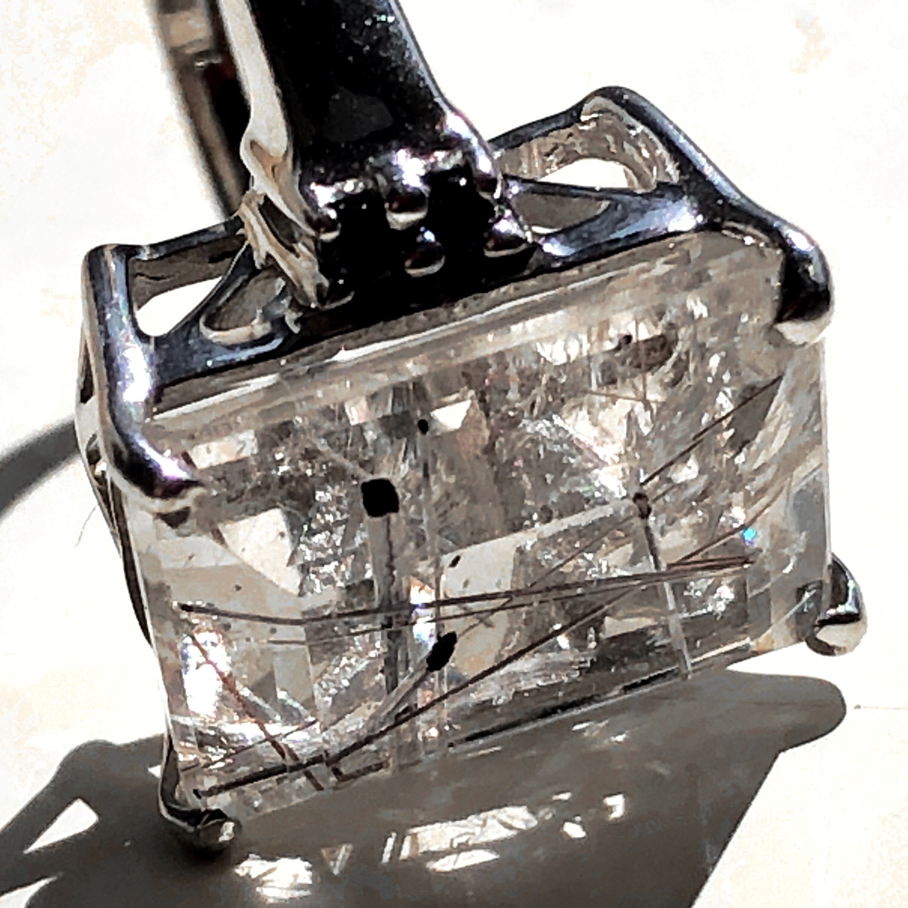 綺麗にカットされたクリアな塊の中に針のような筋が走る水晶の指輪です。四角い塊はただ透明なのではなく、光の加減、角度などで銀色の粒のような、あるいは泡のような煌めきを宿します。そこに、黒みを帯びたシルバーのような針がそれぞれ気儘な方向に、一部は重なり合いながら走っているのです。そして、光を浴びるとこの針は錆びた金属のような鈍い光沢を帯びます。