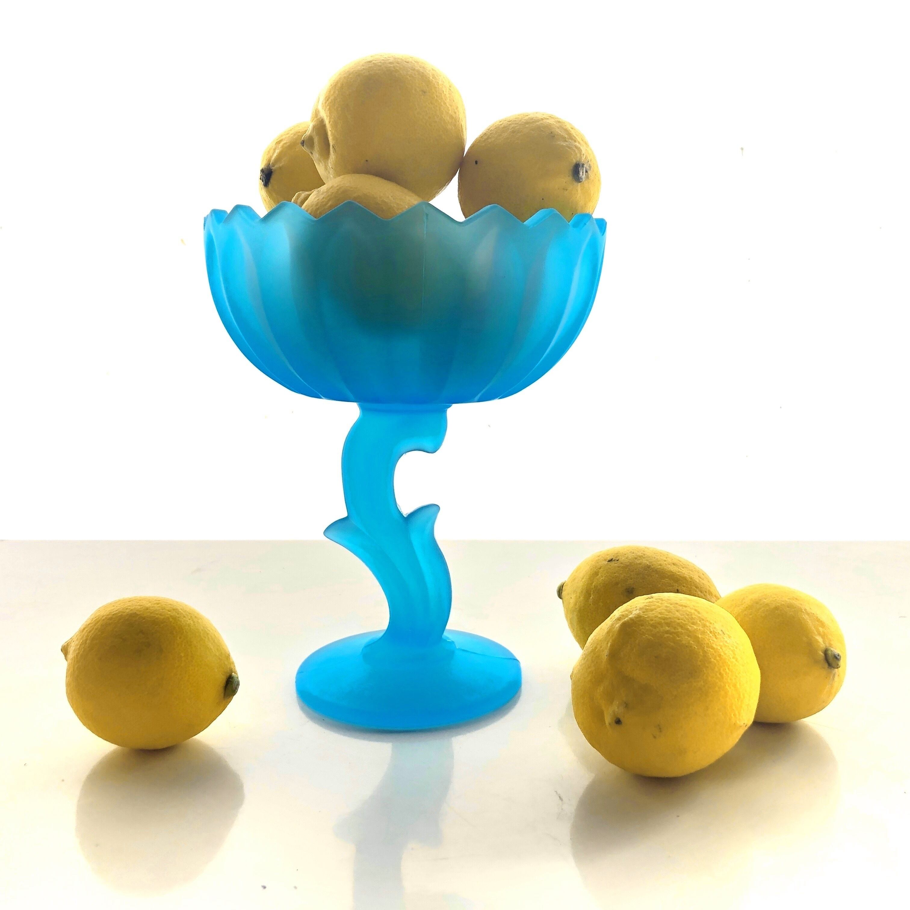 靄がぼんやりと集まってできたような脚付きのガラス器です。まずは、そのサテン仕上げの半透明のガラスの青い色彩が見事です。その色味は軽やかでありながら、まるで全体に霞をまとっているような、あるいはほんのりと発光しているような、なんとも幻想的な雰囲気に包まれています。そしてその造形はハスの花をかたどったもので、夢幻の池にぼおっと立ち上がったような姿です。