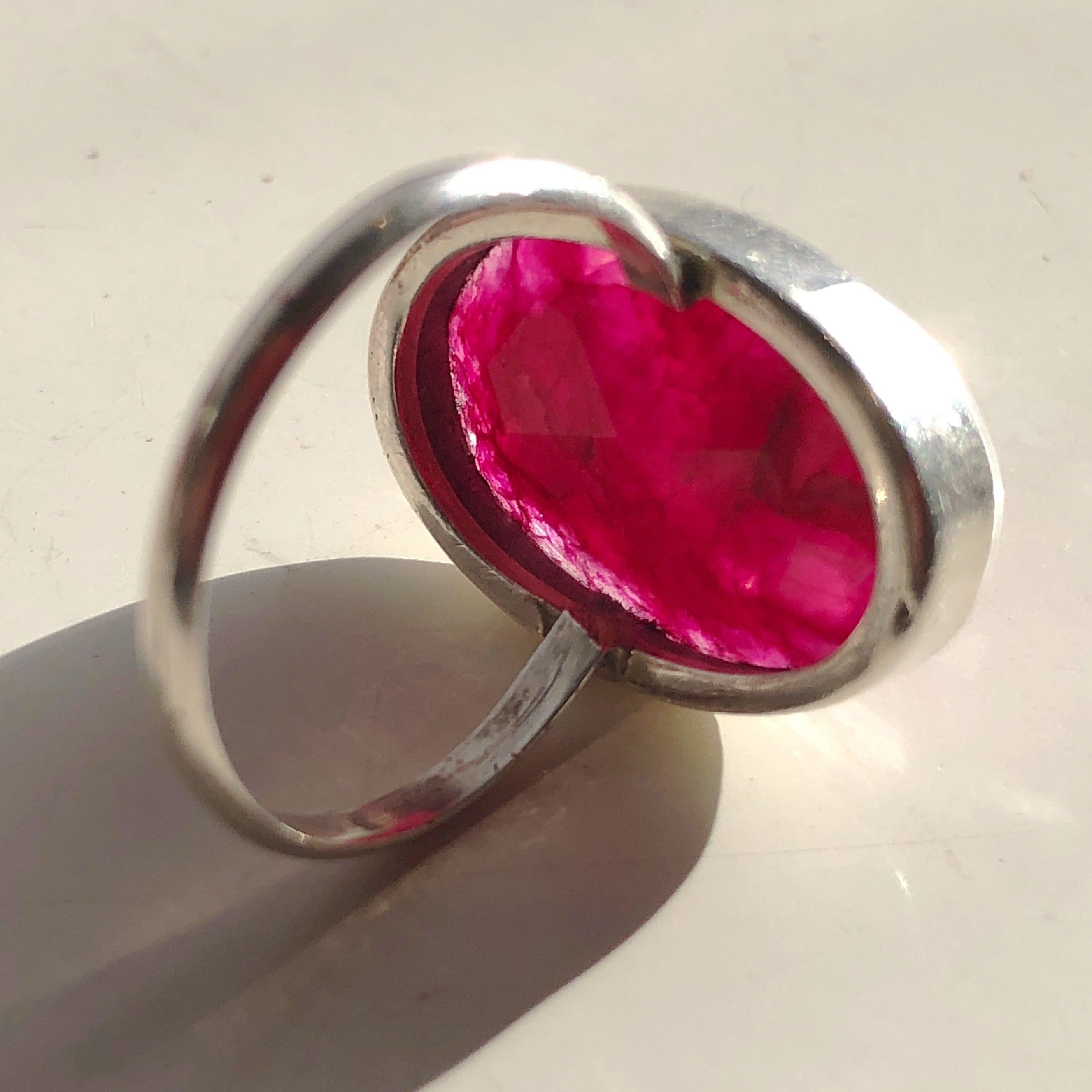 濃いピンクが陰りを見せる、いやほんの少し紫を帯びて、と深く微妙な色味が美しい指輪です。この石はほとんど光を通しませんが艶のある中に黒みを帯びた筋が走り、光を含んだような泡が湧き、という不思議な立体感のある複雑な模様を内に秘めています。それは例えれば無数の薔薇の花びらを透明なケースにぎゅっと詰め込んだような、そんな景色です。めくるめくレッド系の色彩のグラデーションの世界、それがエレガントでないはずがありません。
