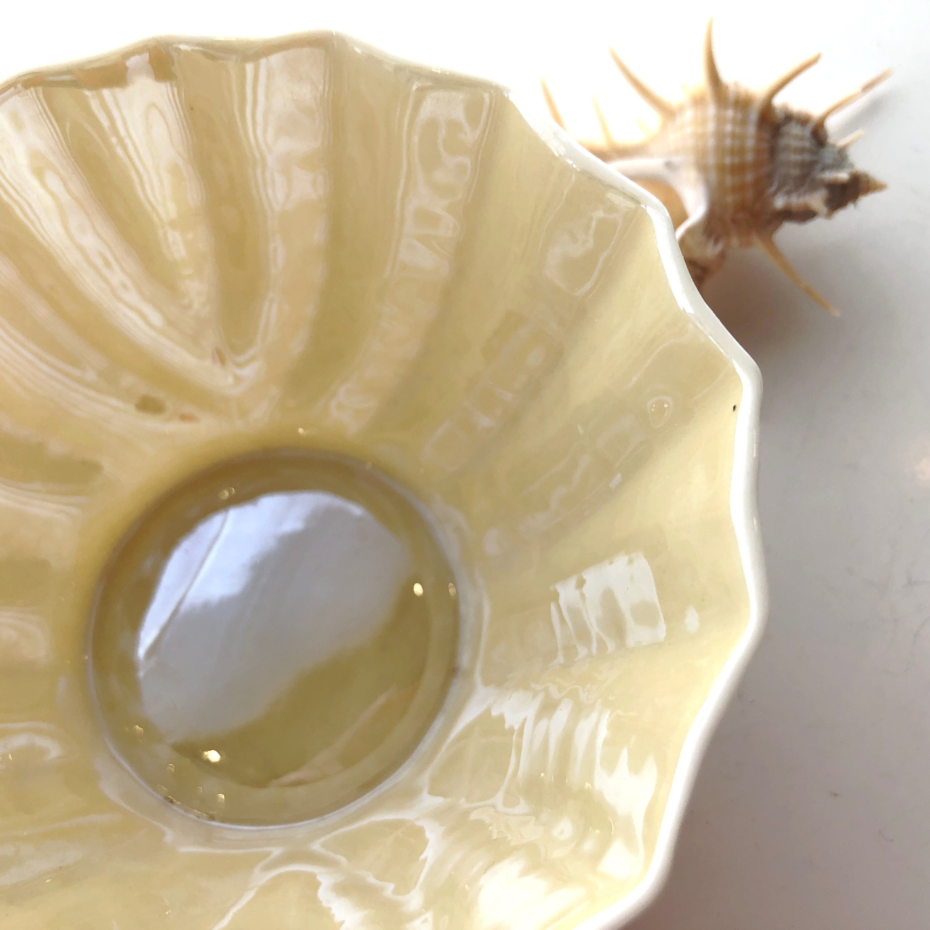 ポーセリンマークは19世紀中頃の創業から6番目のグリーンマークで、1965年から1980年に作られたことを表していますが、ネプチューンのポット類はデザイン、大きさなどが頻繁に変更されたようで、こちらのお品はネプチューンの名前にふさわしく、全体が貝を思わせる大胆な意匠です。また、外側は滑らかな光沢を帯びたアイボリーで、内側にくすんだ黄色みを帯びた釉薬がかかっています。この釉薬はラスター彩とも呼ばれ、磨いた真珠貝を思わせる艶を帯び、このお品の大きな特徴となっています。