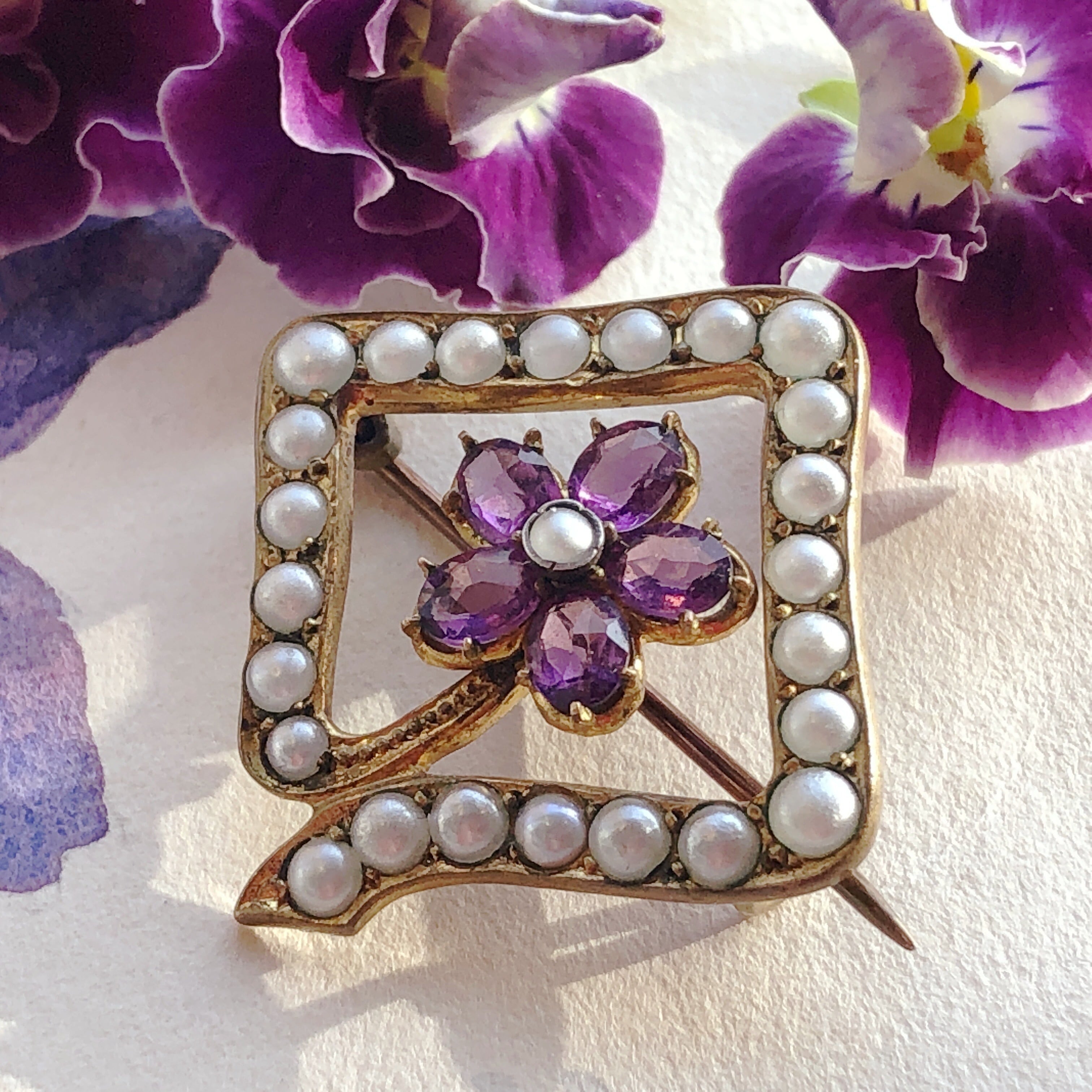 周囲と中心にシードパールを、内に紫の花を咲かせたブローチです。