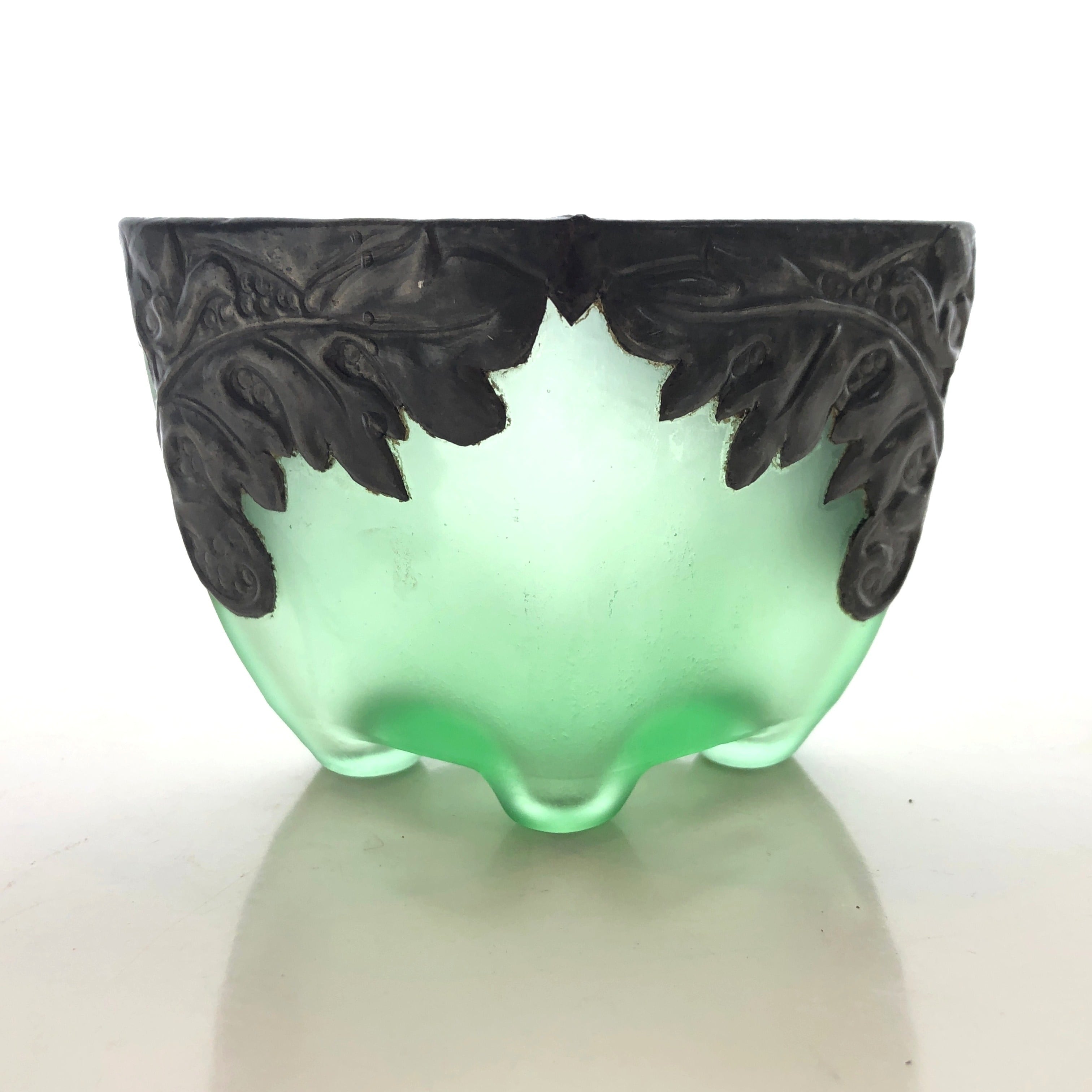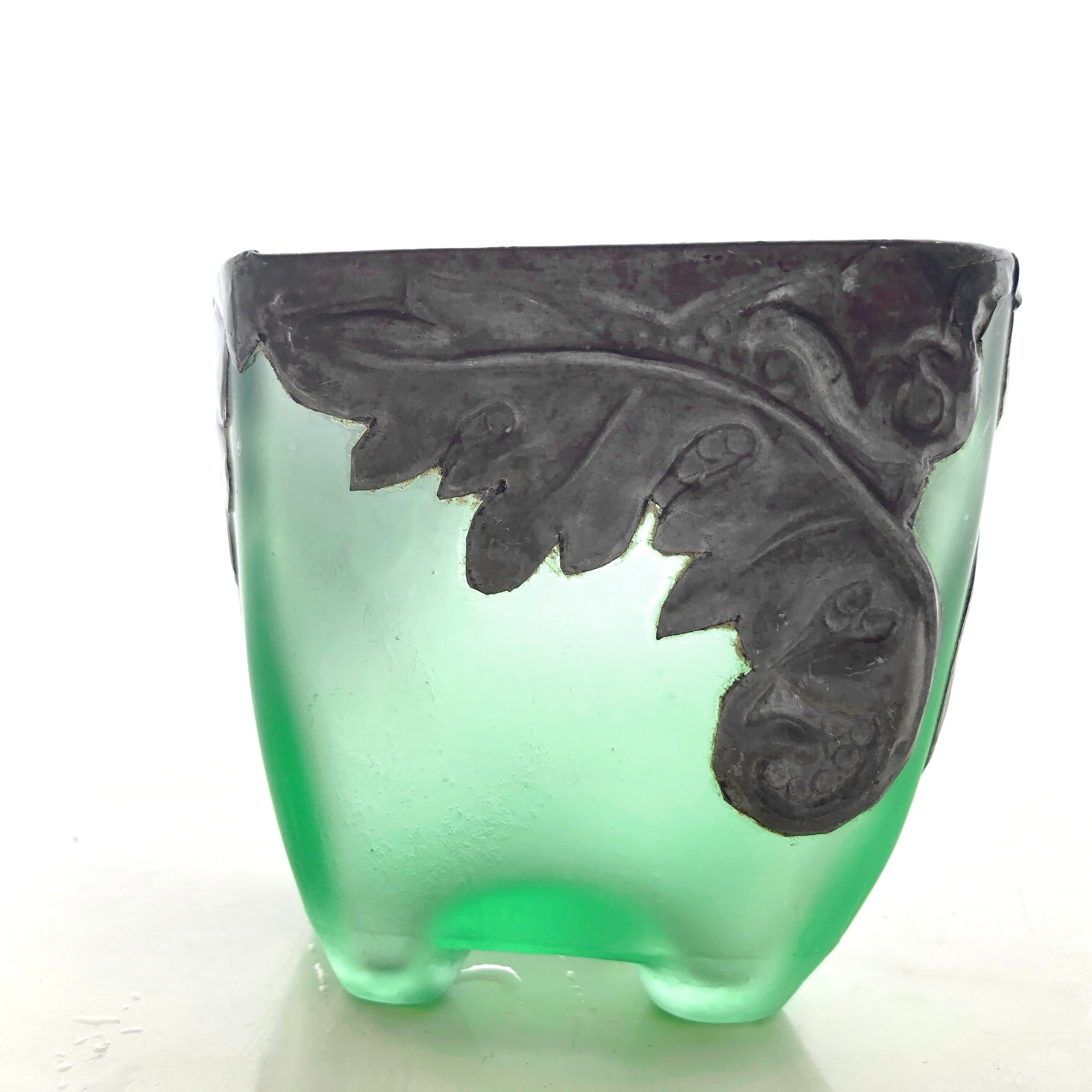 ミントグリーンに金属の装飾を施したフラワーポットです。半透明のガラスは、霧に包まれた新緑の森を思わせるほんのりと薄い緑色です。小花を活けるに良いような小ぶりの菱形で、そこに被せられた植物の装飾は、素材がピューターで、長い年月がその肌を黒々と艶のある質感に仕立てています。