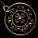 周囲を取り巻く葉の中央に一輪の花をあしらったラウンド型のペンダントです。中央の4つの花弁にはめ込まれたほんのりと薄いピンクのペーストガラスが、清々しい透明感と優しい煌めきを宿しています。全体に金メッキよりもずっと層の厚い金張りが施され、その落ち着いた光沢が繊細で可憐な意匠にさらにエレガントな雰囲気を加えています。