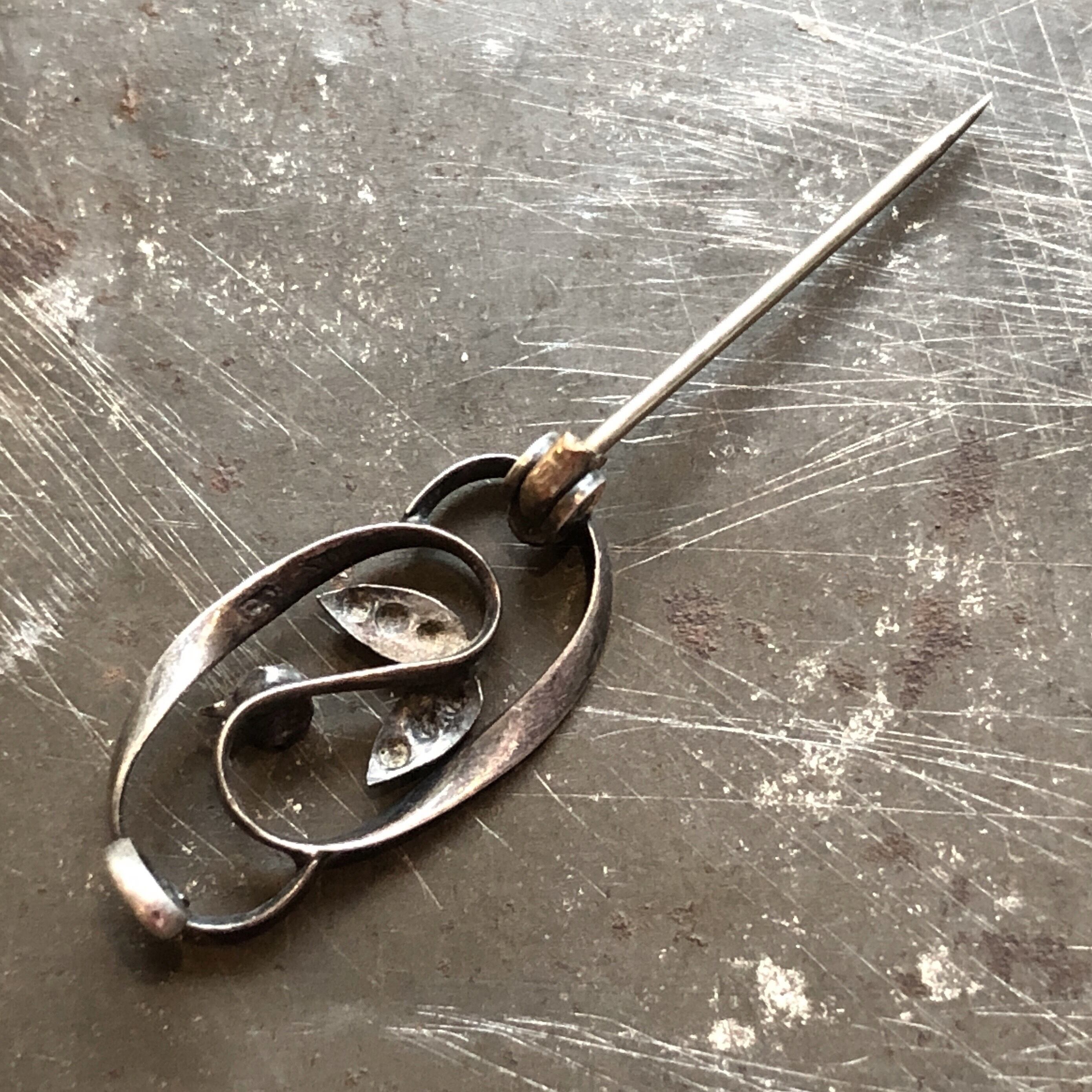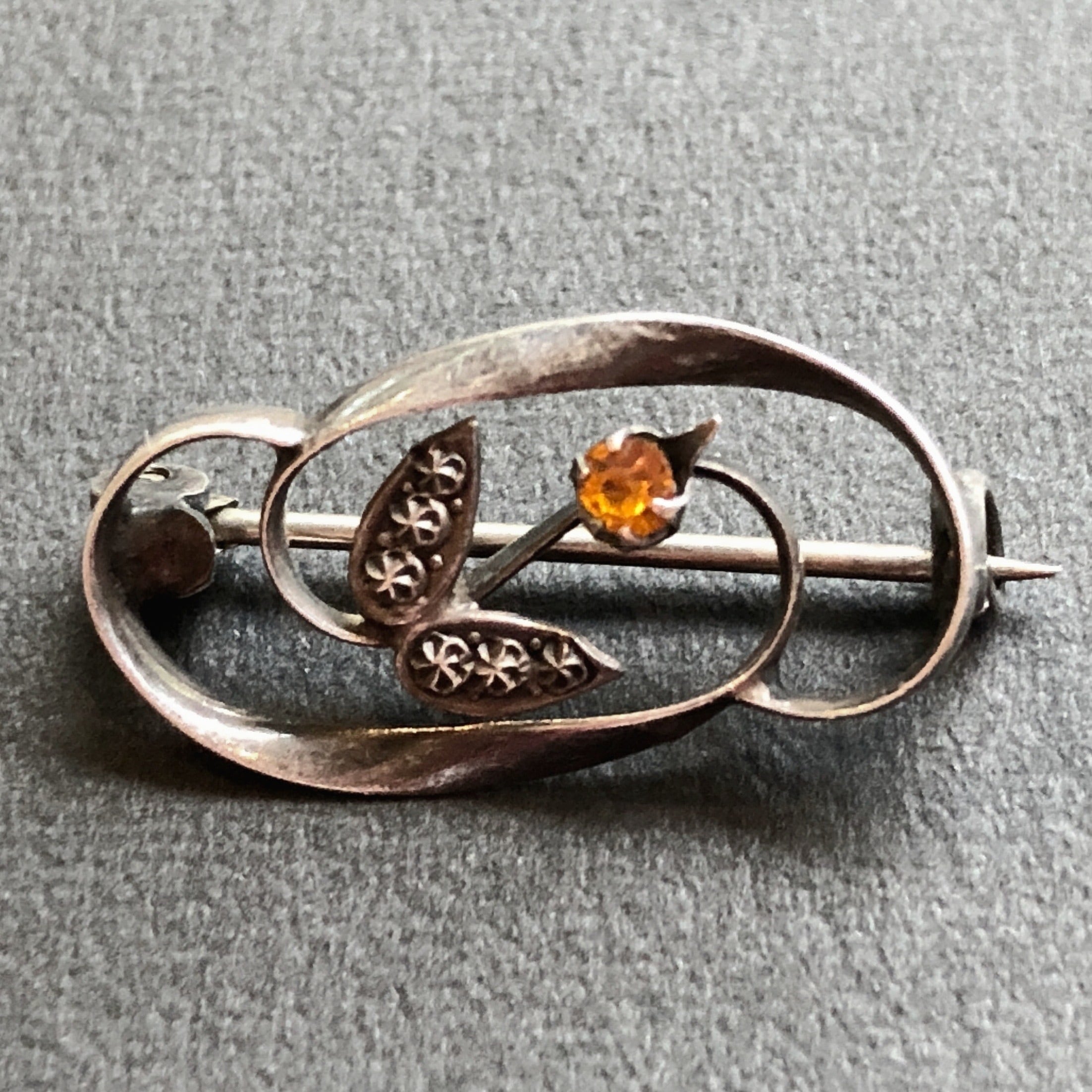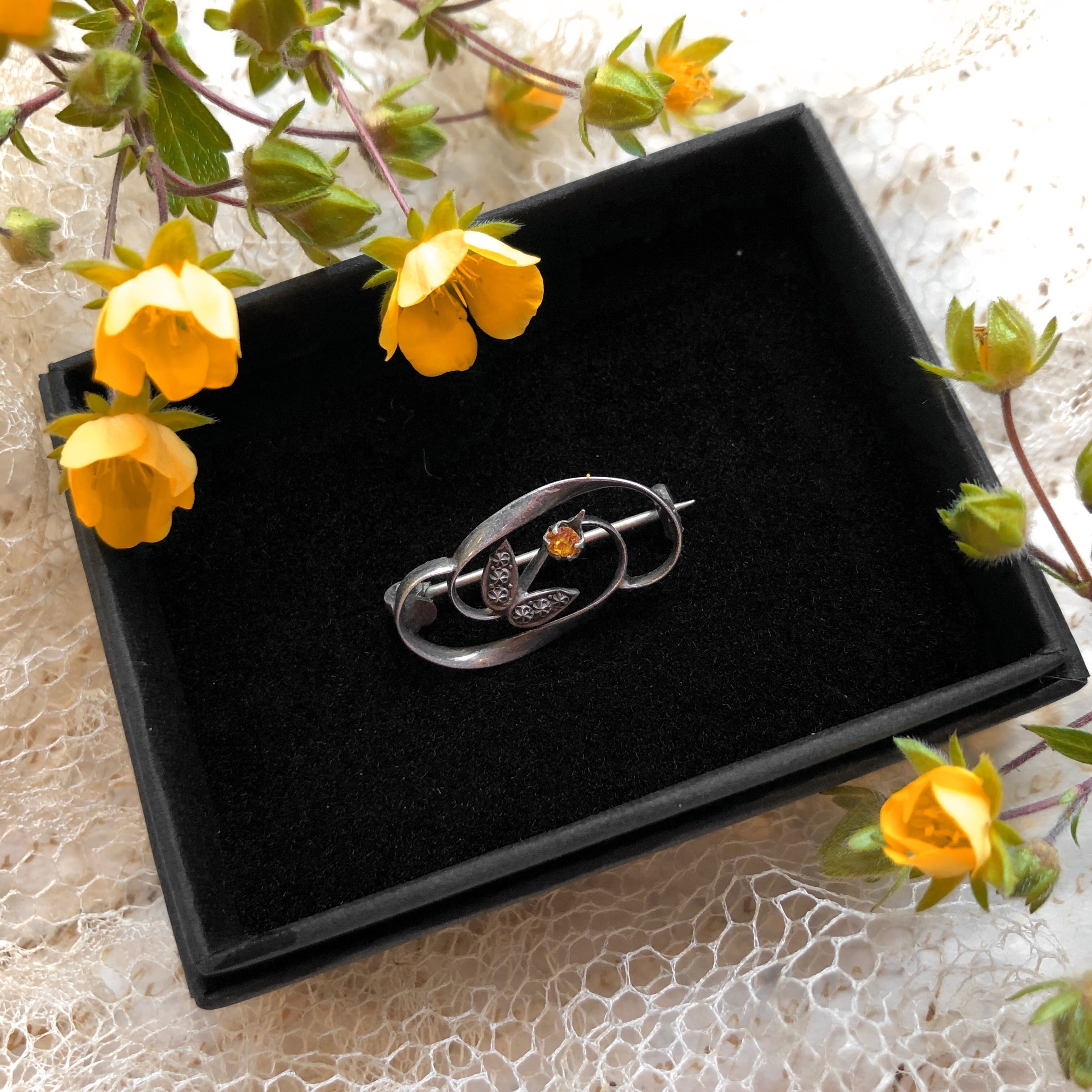 台座は銀の純度が92.5%以上のスターリングシルバーで、長い年月を経て黒味を帯びた質感が、未だ煌めきを宿す花をさらに引き立てています。