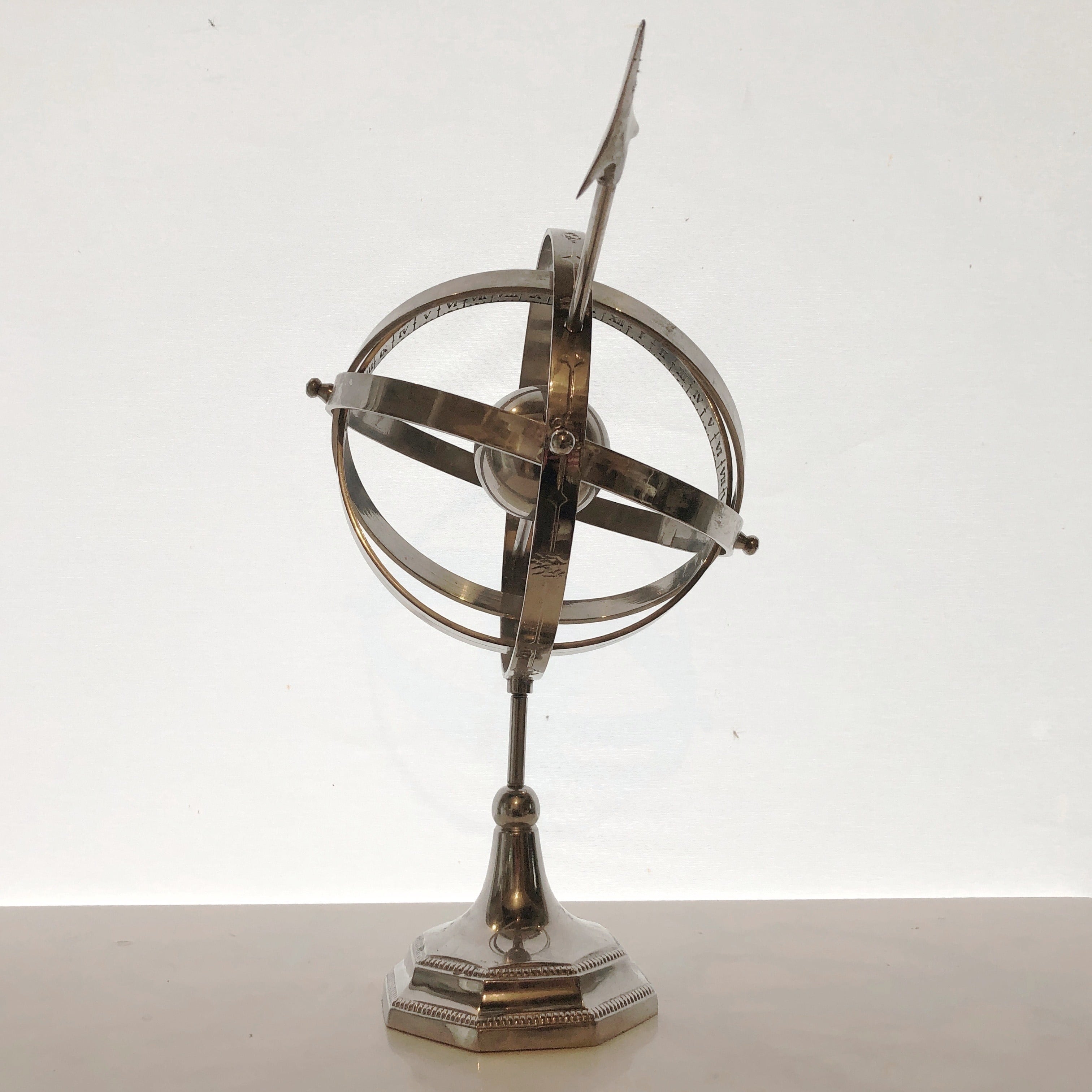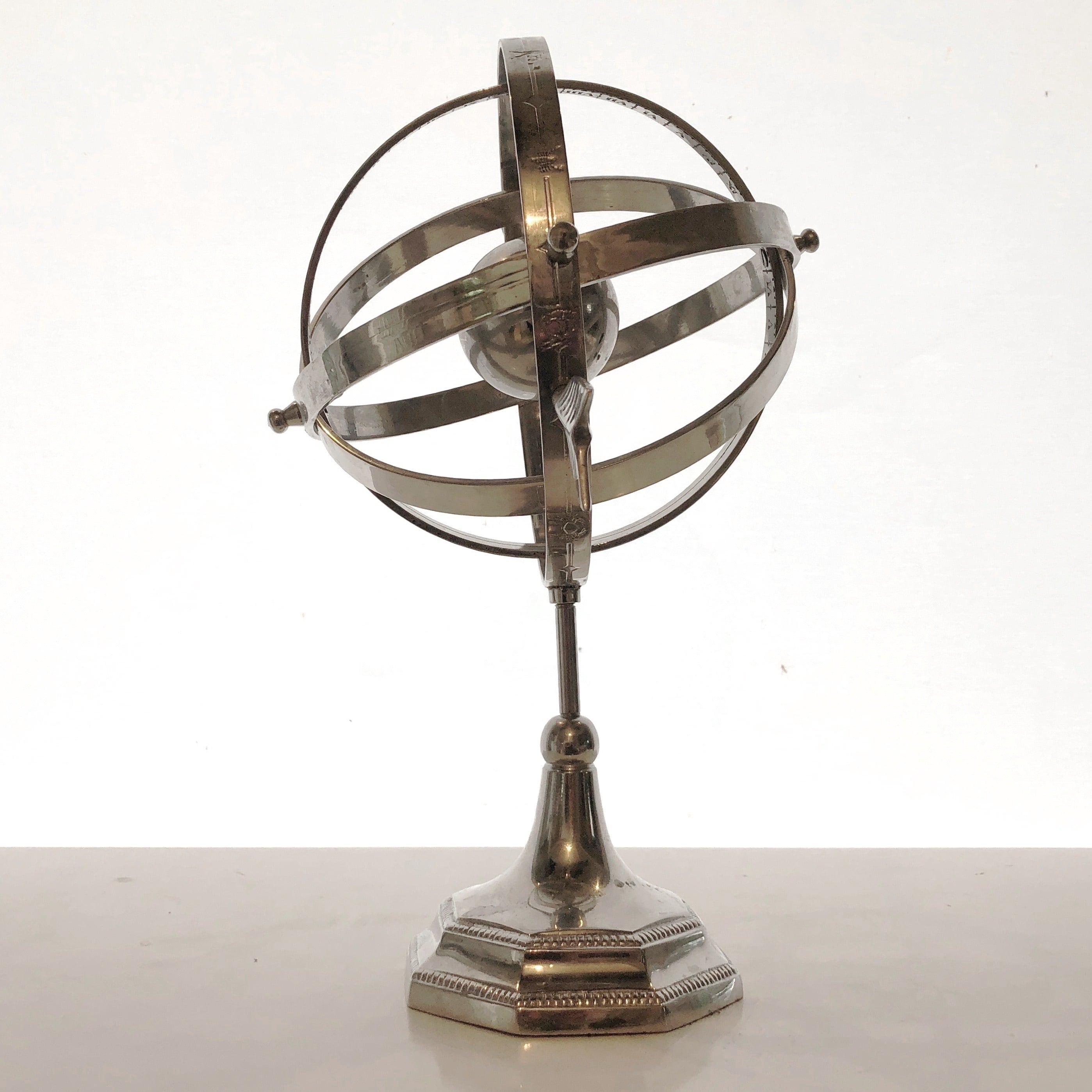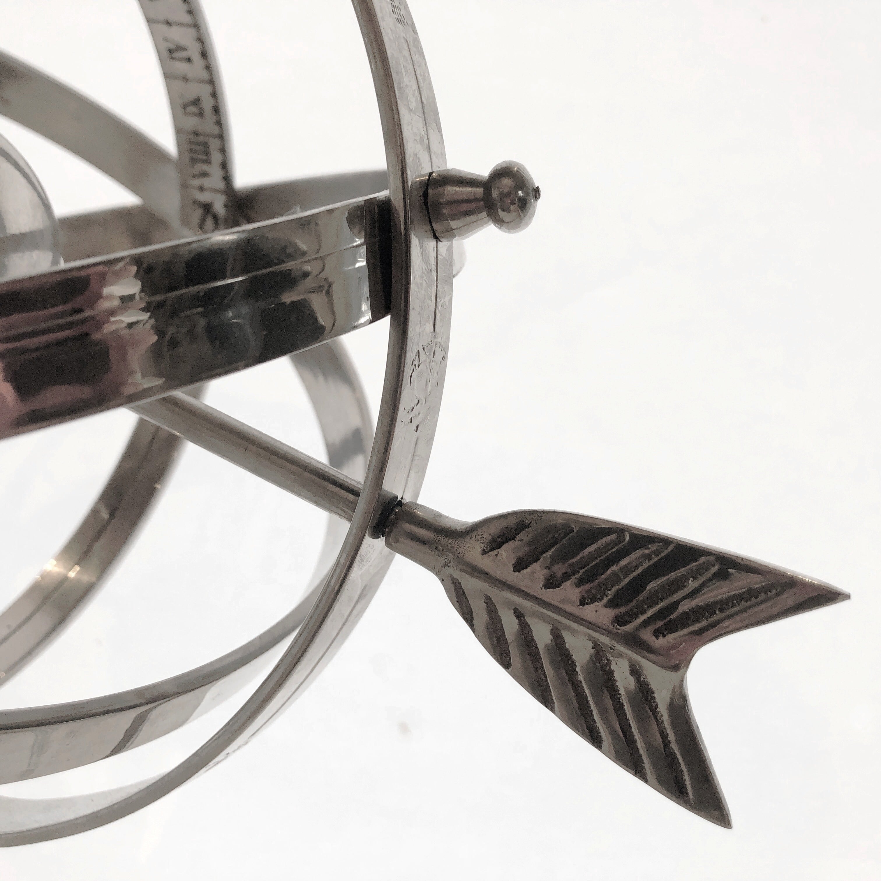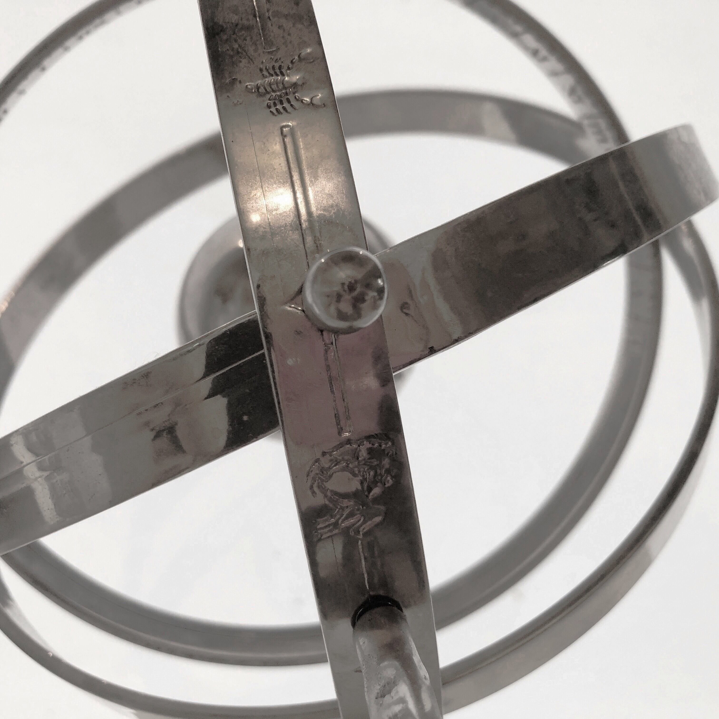 アーミラリ天球儀にインスパイアされて製作された銀色のオブジェです。これは渾天儀とも呼ばれ、天球上の天体の動きを表す機器として古代のギリシャと中国でそれぞれ独自に考案され、当時の天文学者たちは天体観測に用いました。それを模して作られたものがこちらですが、全体の高さが約36センチ、矢の長さが約40センチと大型で迫力があり、リングに十二宮が浮き彫りにされていたりと、天空に魅入られた者の部屋に相応しいアイテムと言えましょう。