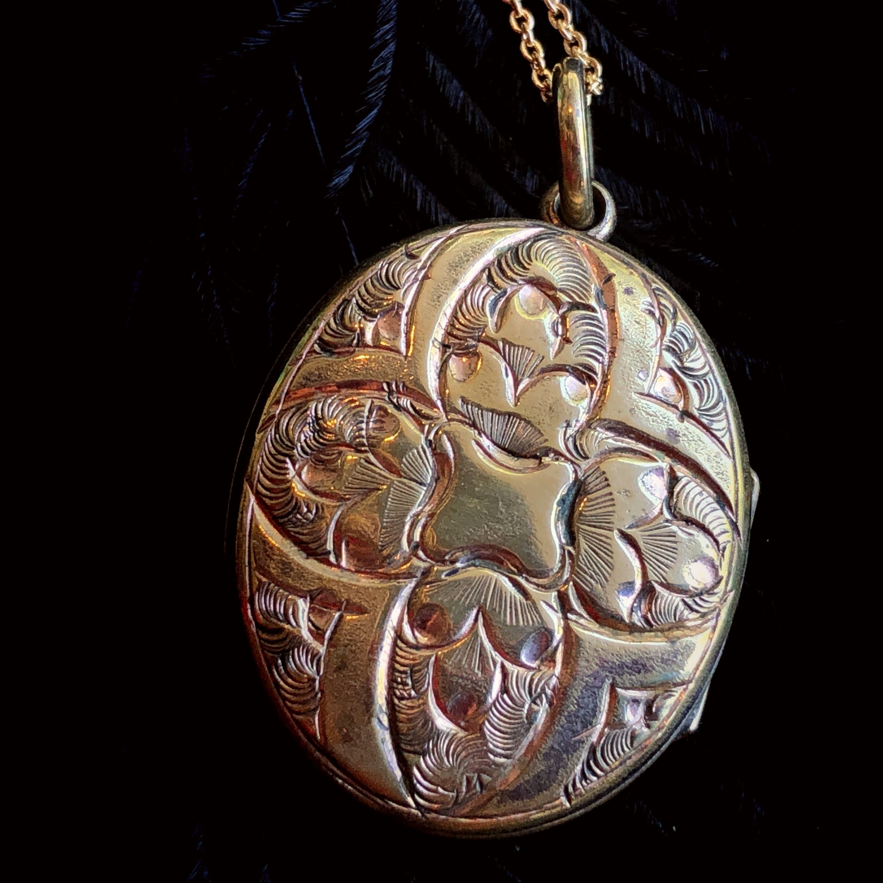 仕上げは金メッキより層の厚い金張りとのことで、素材の艶やかな質感も残っています。ただ、はげた部分も見られ、実際に使われたようですが、さて、どのような方が何を忍ばせたものでしょうか。製作は1880年代、ヴィクトリア朝も後半に入ったイギリスとのことです。当時、秘めておかなければならないことも多かったことでしょうし、それだけでなくそっと身につけておきたい想い出もあったことでしょう。そして今も、それはあまり変わらないのかも知れません。かつての持ち主の気配も道連れに、今、また何かをそっとひそませるのも、古いものを所有する時空を超えた楽しみと言えましょう。本来は写真を入れるものですが、厚みがあるので小さなものなら入れられます。思い出の品や大切な形見を入れて。またちょっとしたピルケースにもなりそうです。プレゼントにも素敵だと思います。