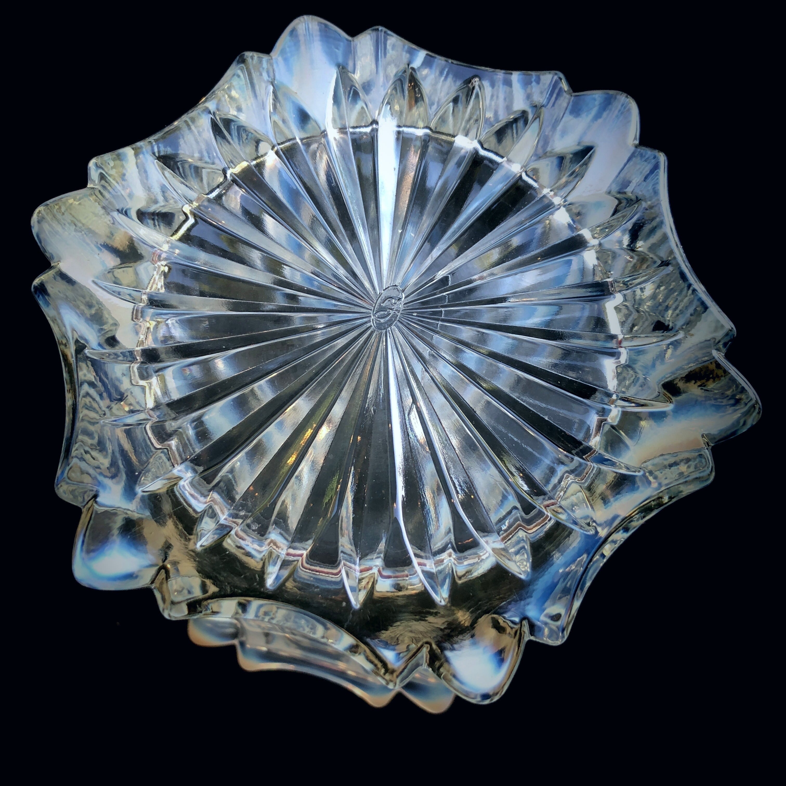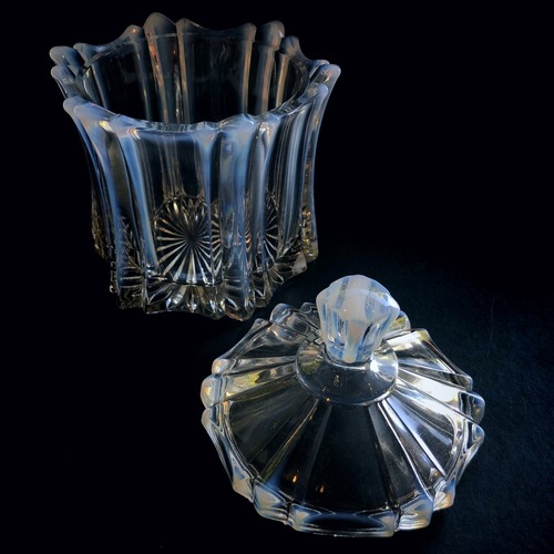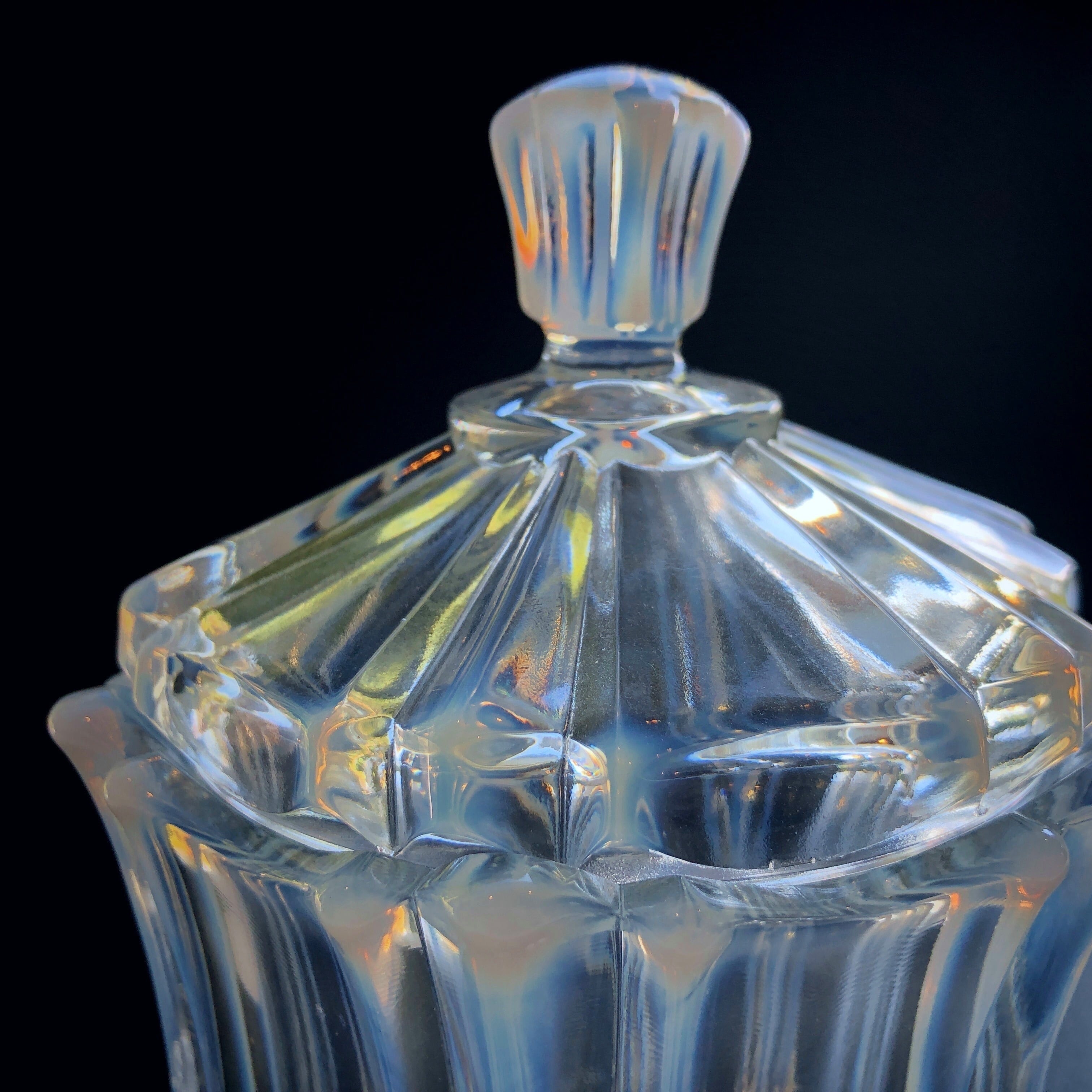 クリアなガラスにぼんやりと青白い筋やドットが浮かぶ蓋つきのポットです。透明度が高い厚手のガラスは貴族の邸宅の庭にあるパビリオンを思わせるフォルムで、床面の綺麗にカットされた模様を曲面のガラスに透かして見ると、まるで少し空間が歪んだ世界を外から覗いているかのようです。その柱にあたる部分に光を含む青白いもやがスッと走り、角の部分にはやはり青白い粒がポツリポツリと浮かびます。全体が靄で霞むようなオパールセントガラスとは違う、クリアな光が踊る中に青白い光の筋が立ち上がる、誰かが光の魔法をかけた世界のようなユニークな意匠のお品です。