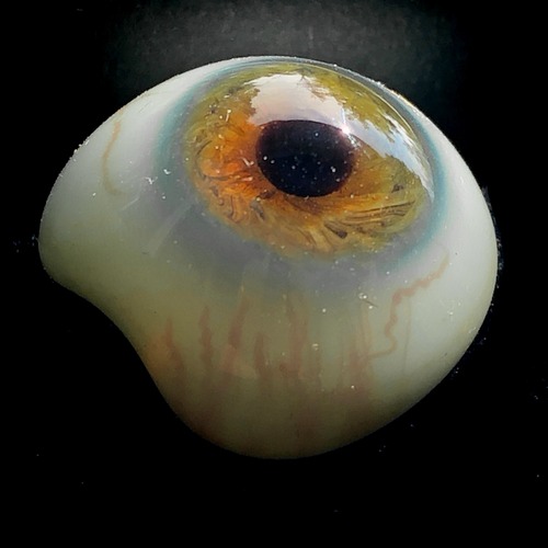 外縁の黒味を帯びた水色がまるで湧き出してくるような、なんとも幻想的な美しさの義眼です。その内側にはたっぷりと水を含んだような瑞々しい空間が広がります。こんな小さな世界になぜこのような奥深い感覚を覚えるのかと不思議になりますが、これも透明度の高いラウシャのガラスならではの表現だと思います。黒目から赤みを帯びた茶色が次第に薄く黄色味がかり、それを背景に濃い紺色の線が渦を巻いています。その虹彩に、光の角度によって赤茶色の煌めきが走る瞬間があります。