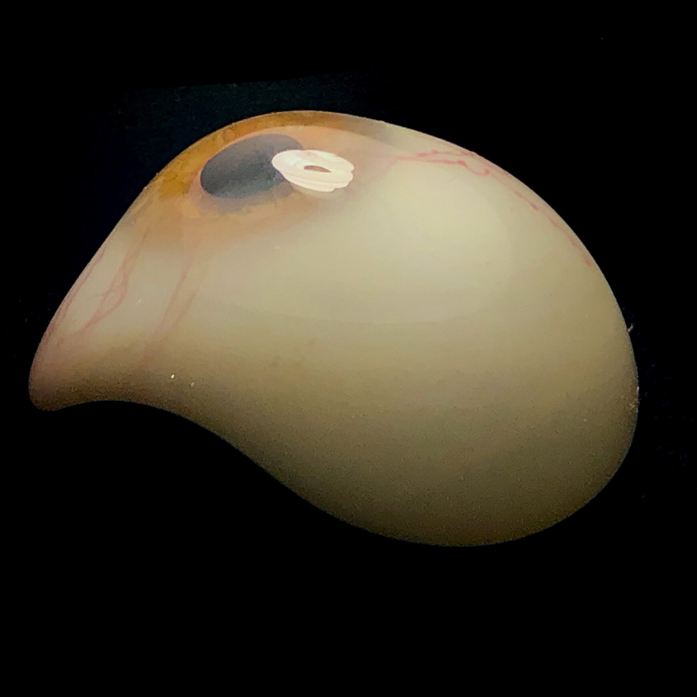 こちらのガラス義眼はドイツ、チューリンゲン州、ラウシャの "Theodor Müller-Hipper" の手によるもので、その商標にはチューリンゲン州の「最高品質認定」の記載があります。ラウシャは古くから優れたガラス工芸の町でしたが、19世紀にイタリアから義眼製作の技術が伝わり、19世紀の末までにはガラス義眼で有名になりました。今でもその技術を使って、カスタムのドールアイなどを製作しているそうです。